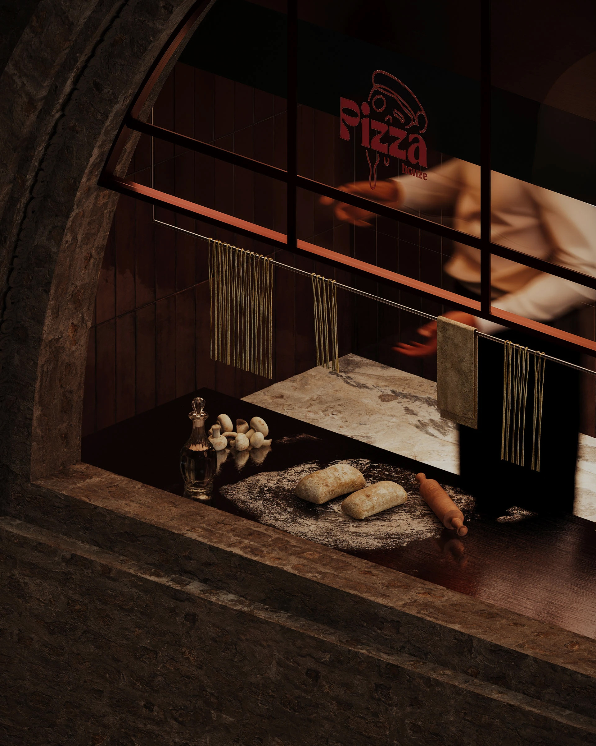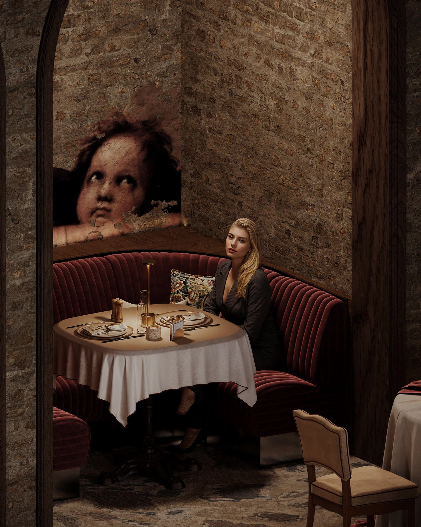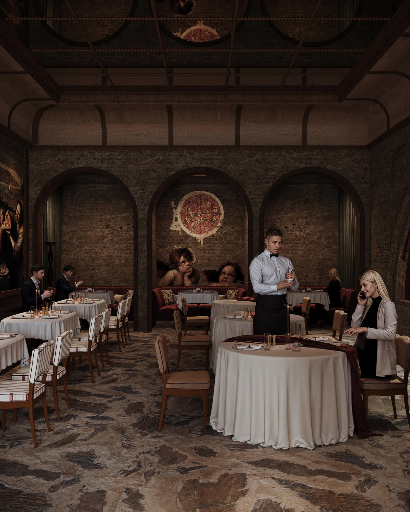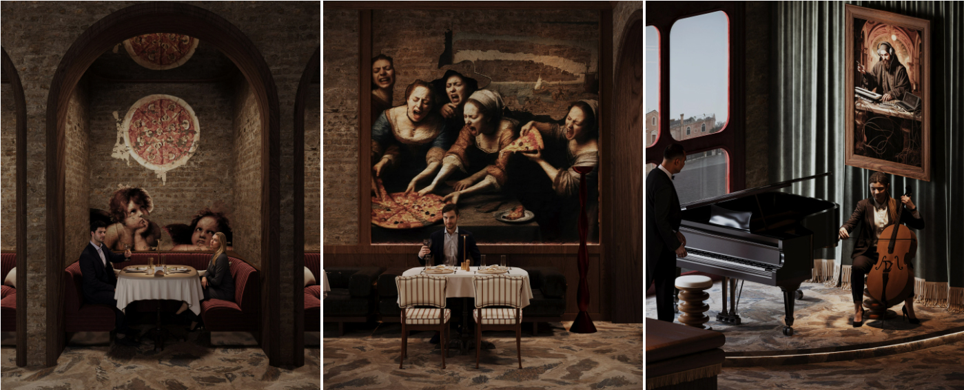 这是古典戏谑艺术混搭风:把文艺复兴的古典壁画和披萨美食做反差萌,粗粝复古砖墙搭轻奢软包、现代暖光,既留了复古的厚重质感,又用美食元素戳中趣味点,高级不沉闷。