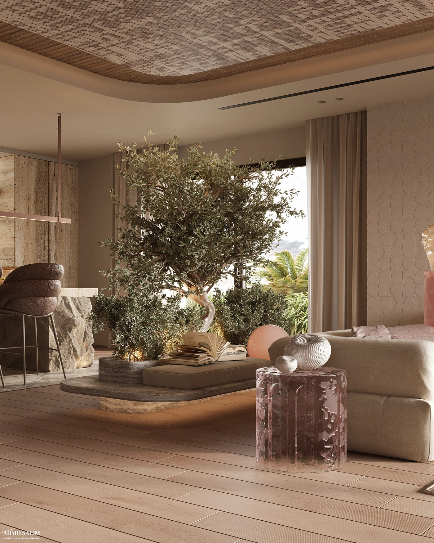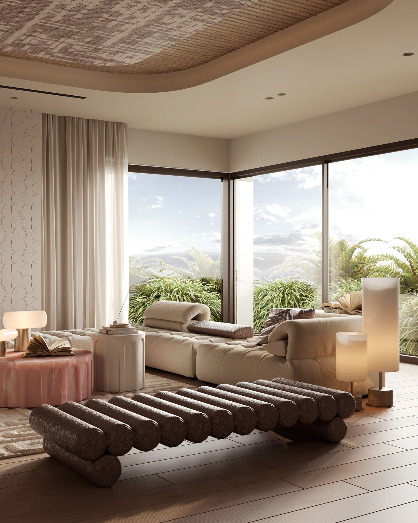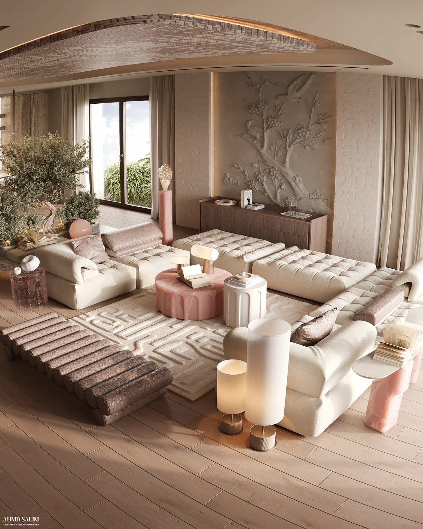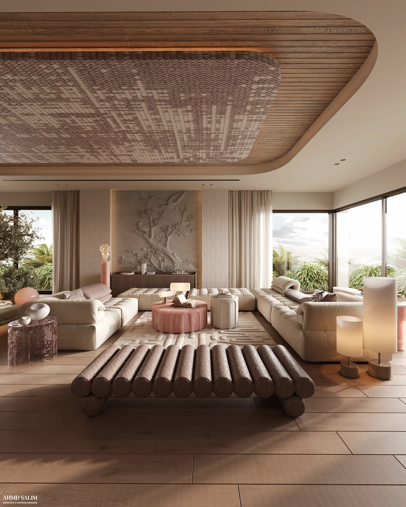 谁被这组国外顶流室内设计案例美到失语✨木质的暖裹着大理石的润,肌理吊顶的编织感撞着墙面浮雕的柔,粉调边几的软中和了石质桌腿的粗 —— 每一处都把 “自然轻奢风” 的高级松弛感焊死了!