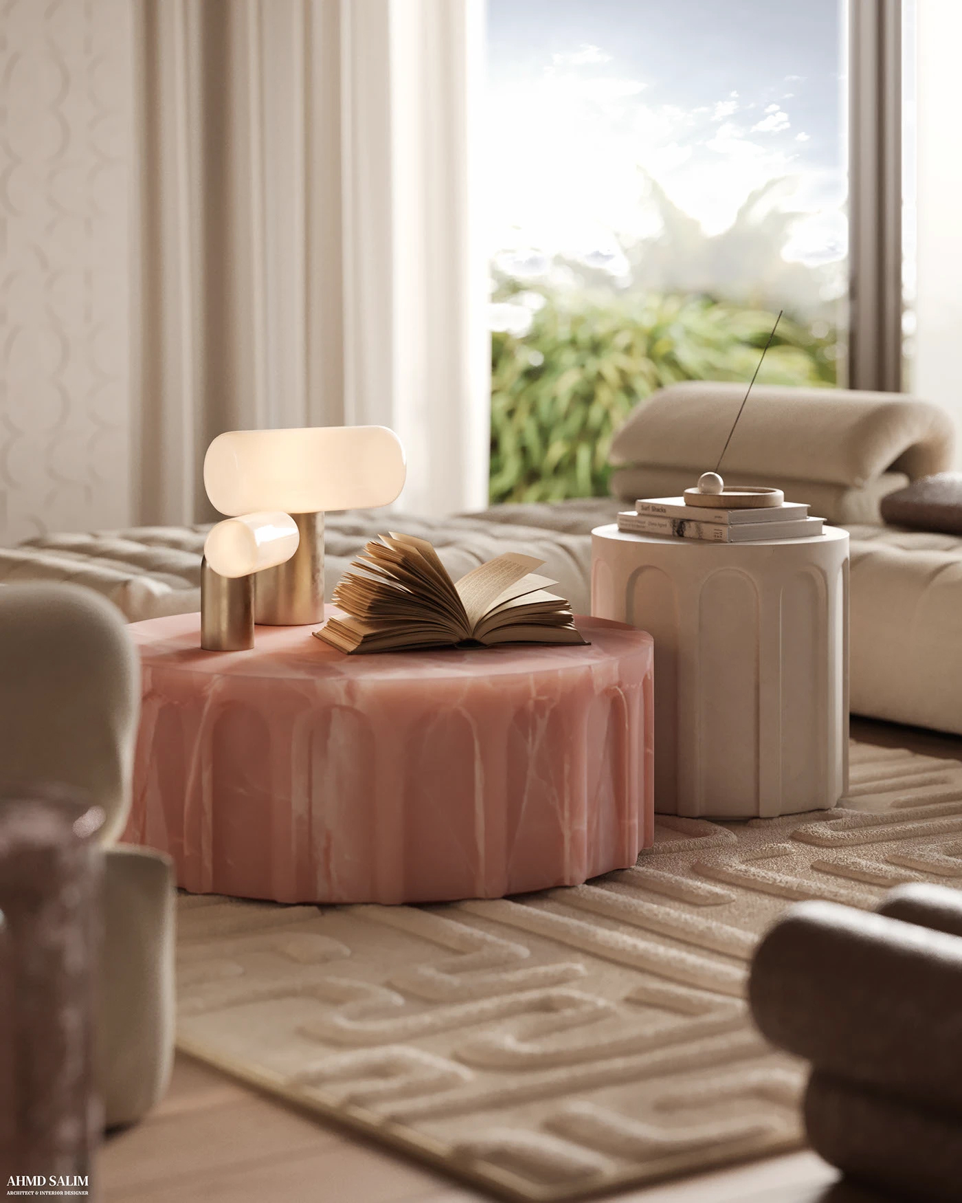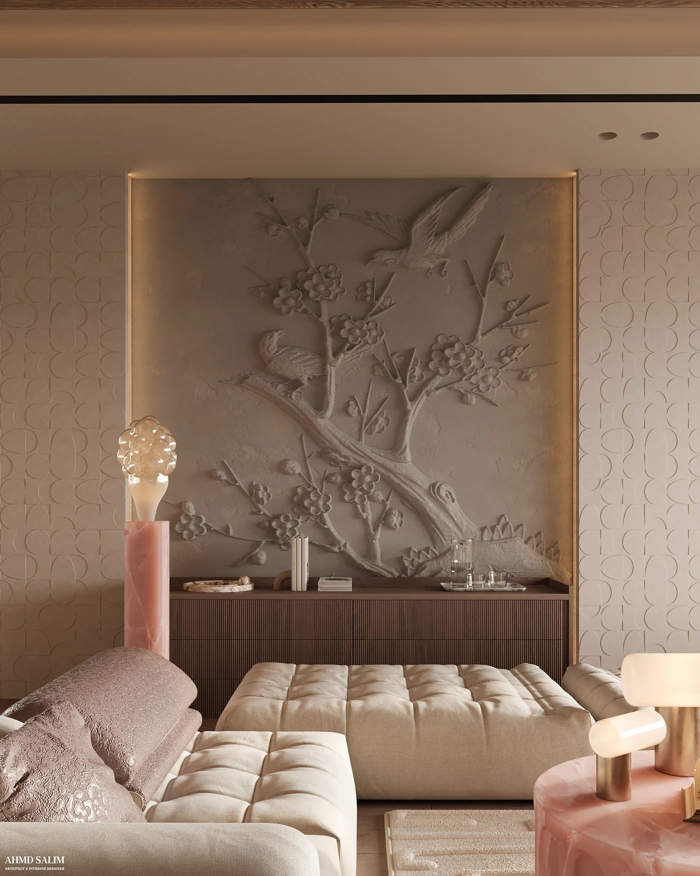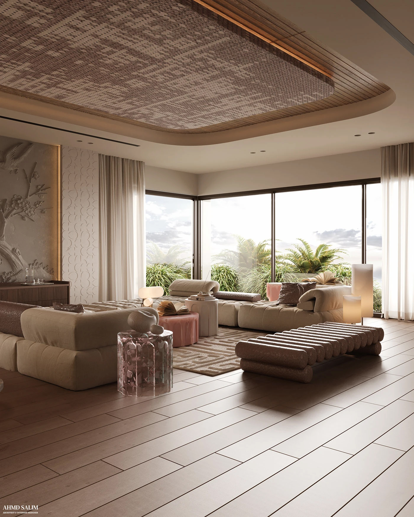 谁被这组国外顶流室内设计案例美到失语✨木质的暖裹着大理石的润,肌理吊顶的编织感撞着墙面浮雕的柔,粉调边几的软中和了石质桌腿的粗 —— 每一处都把 “自然轻奢风” 的高级松弛感焊死了!