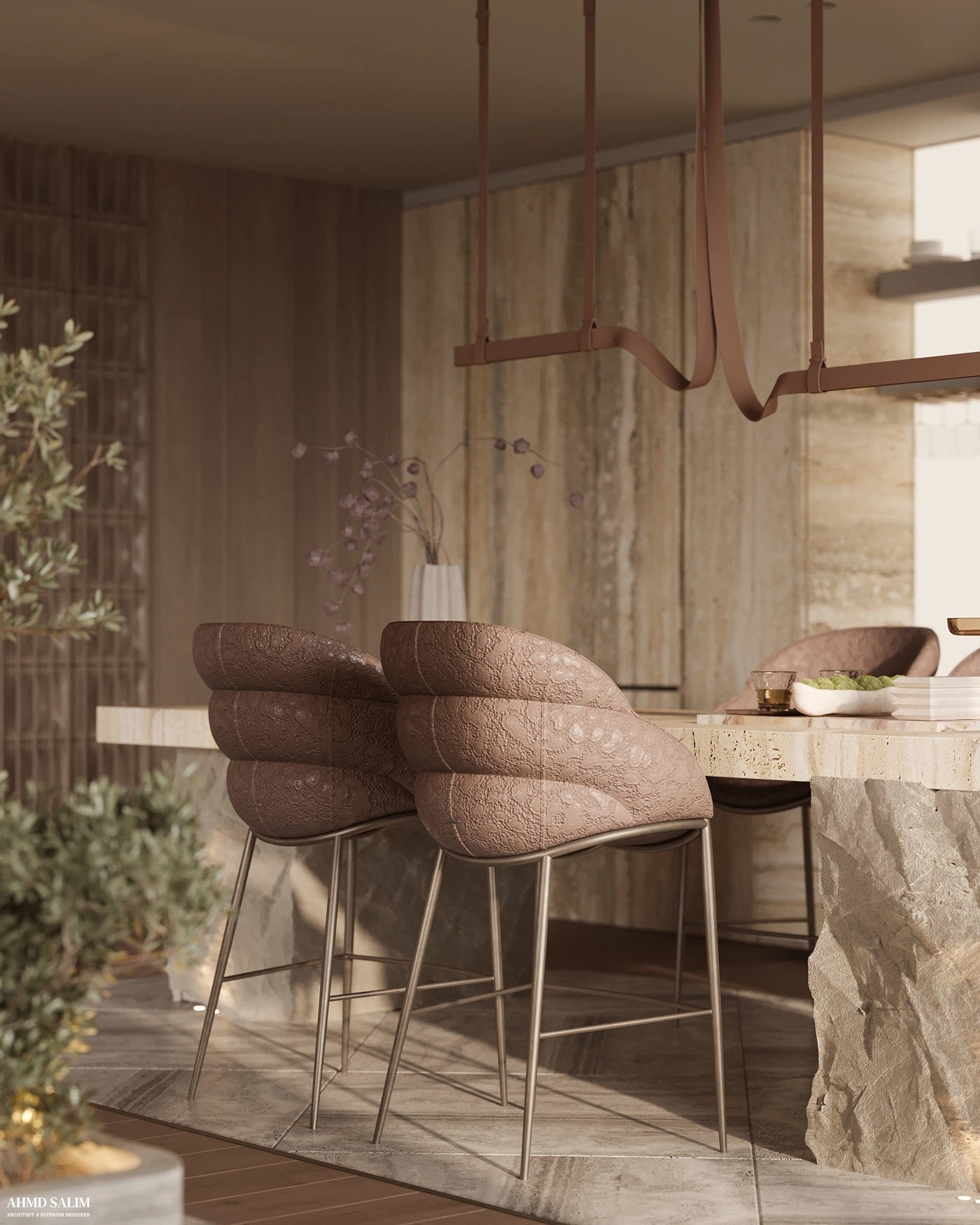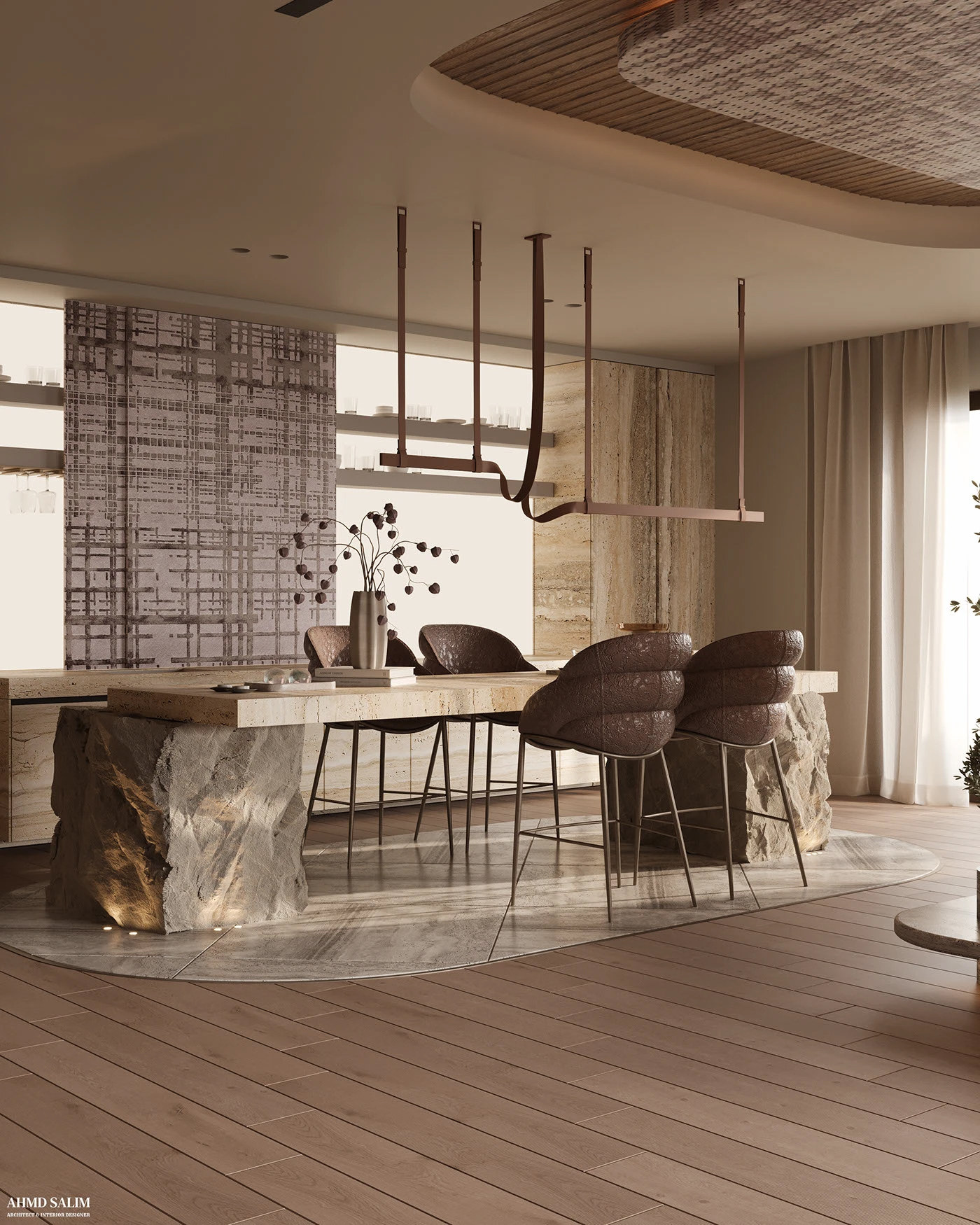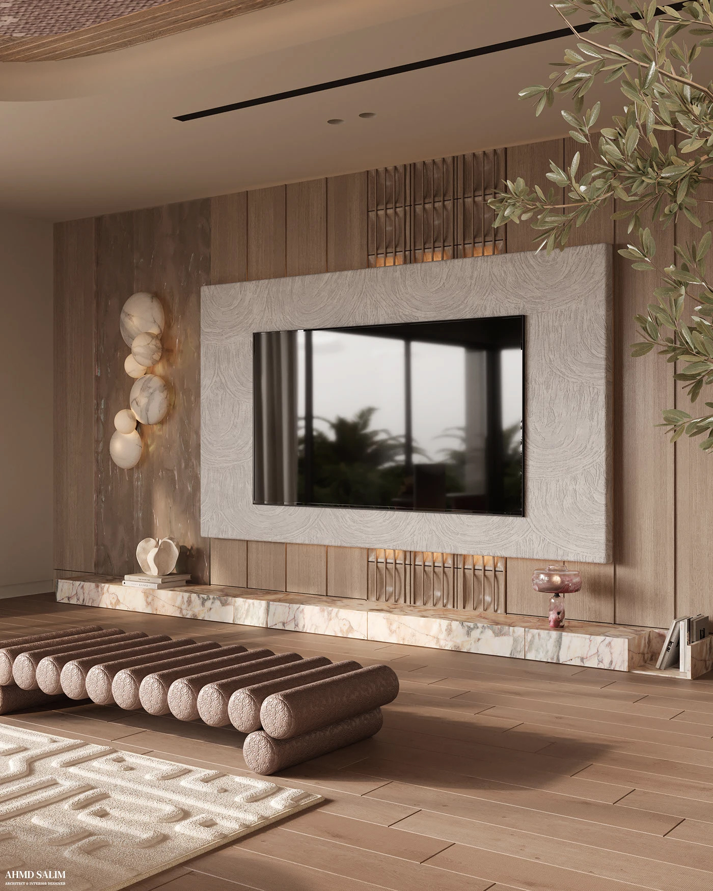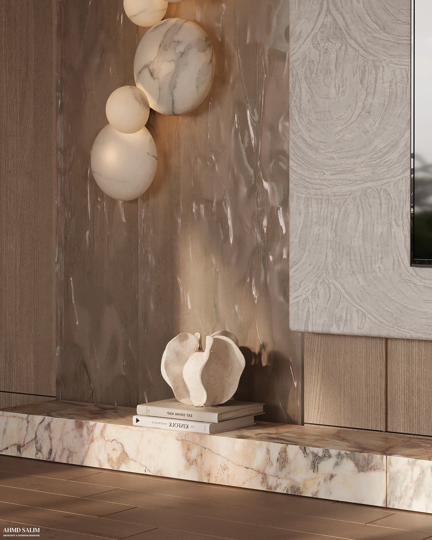 谁被这组国外顶流室内设计案例美到失语✨木质的暖裹着大理石的润,肌理吊顶的编织感撞着墙面浮雕的柔,粉调边几的软中和了石质桌腿的粗 —— 每一处都把 “自然轻奢风” 的高级松弛感焊死了!