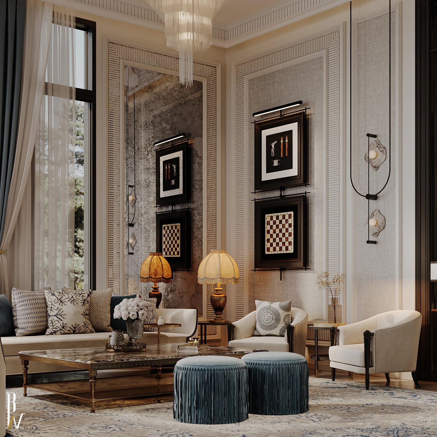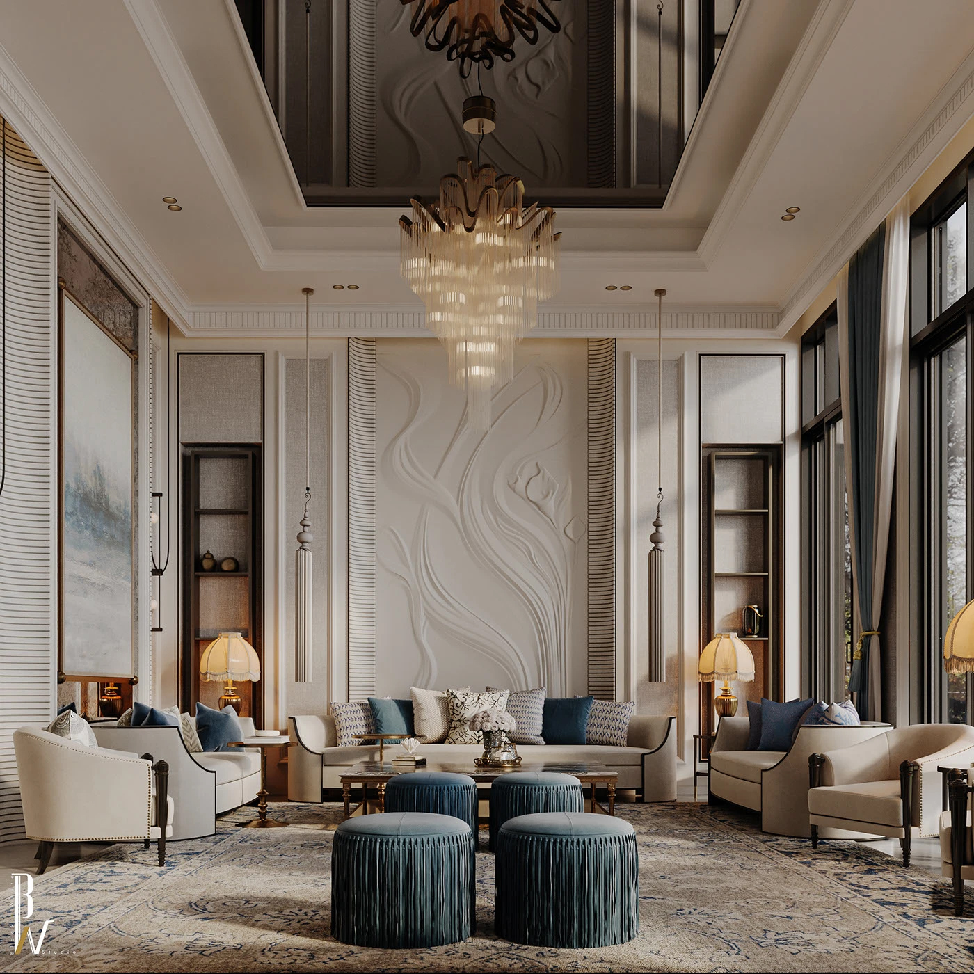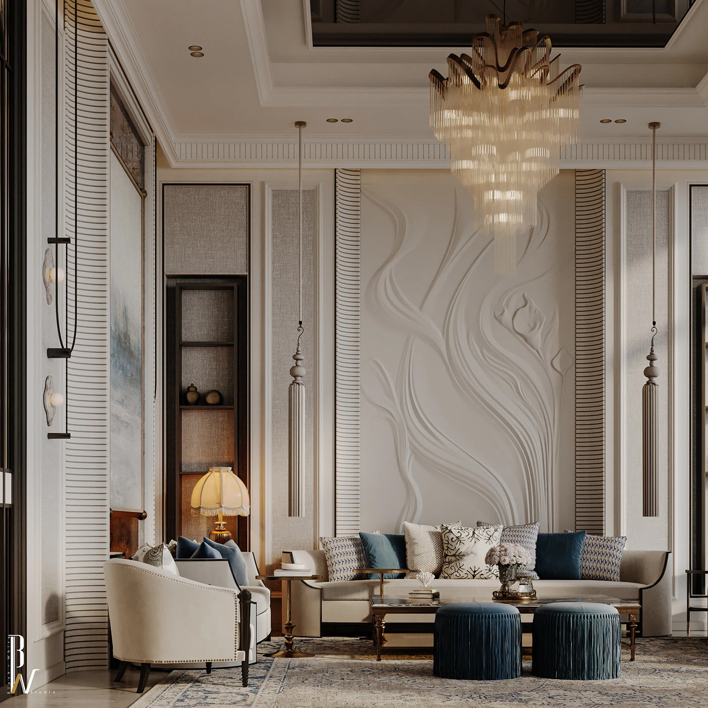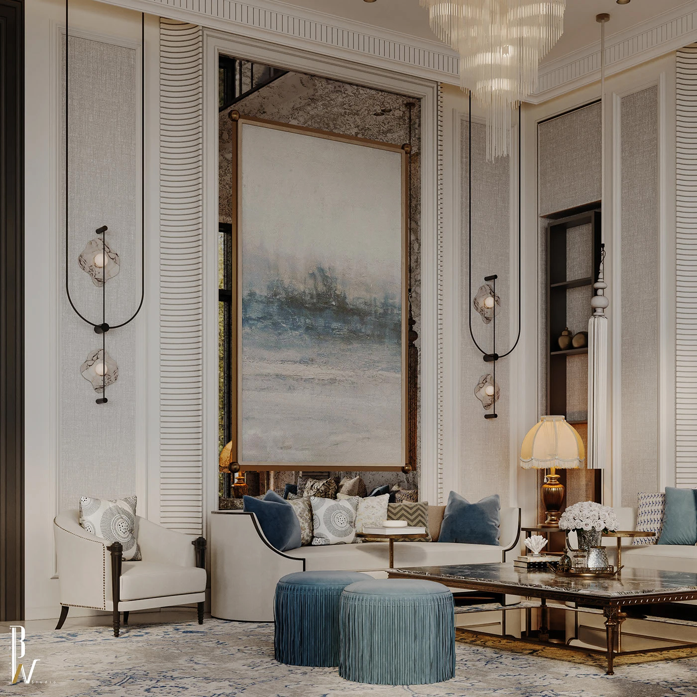谁刷到这轻奢客厅能不原地种草啊!💫柔纱白肌理墙撞雾霾蓝流苏墩,水晶吊灯衬着浮雕细节,现代轻奢揉了点新古典的柔,每处都把 “当下设计流行审美” 焊得死死的 —— 这就是现在行业抢着要的 “新精致风”!