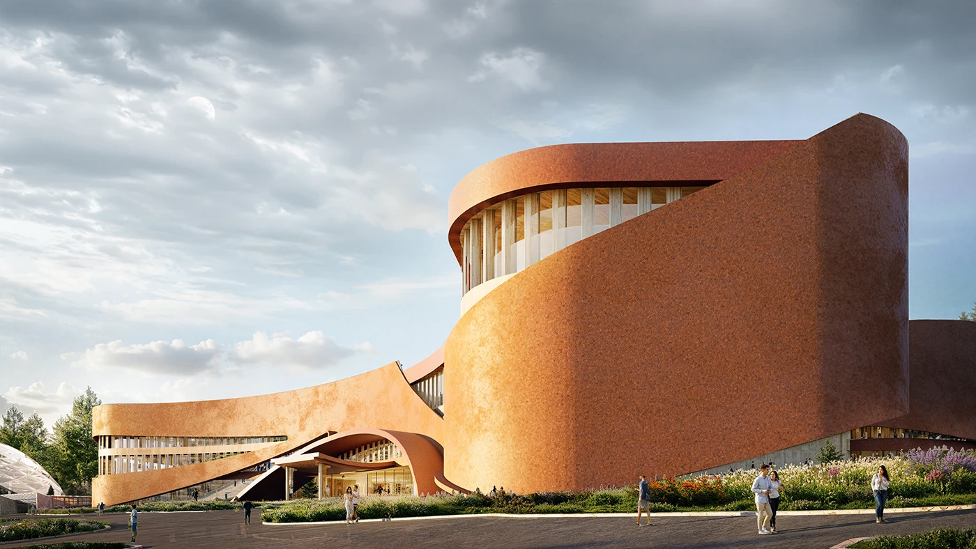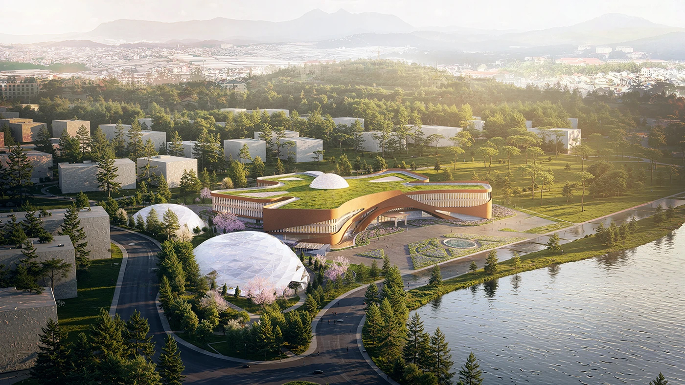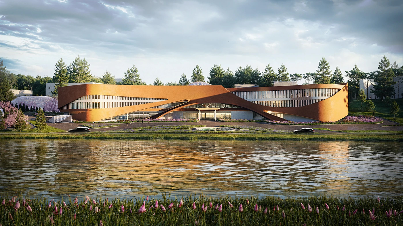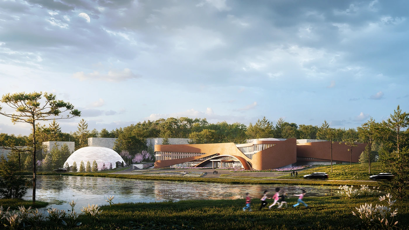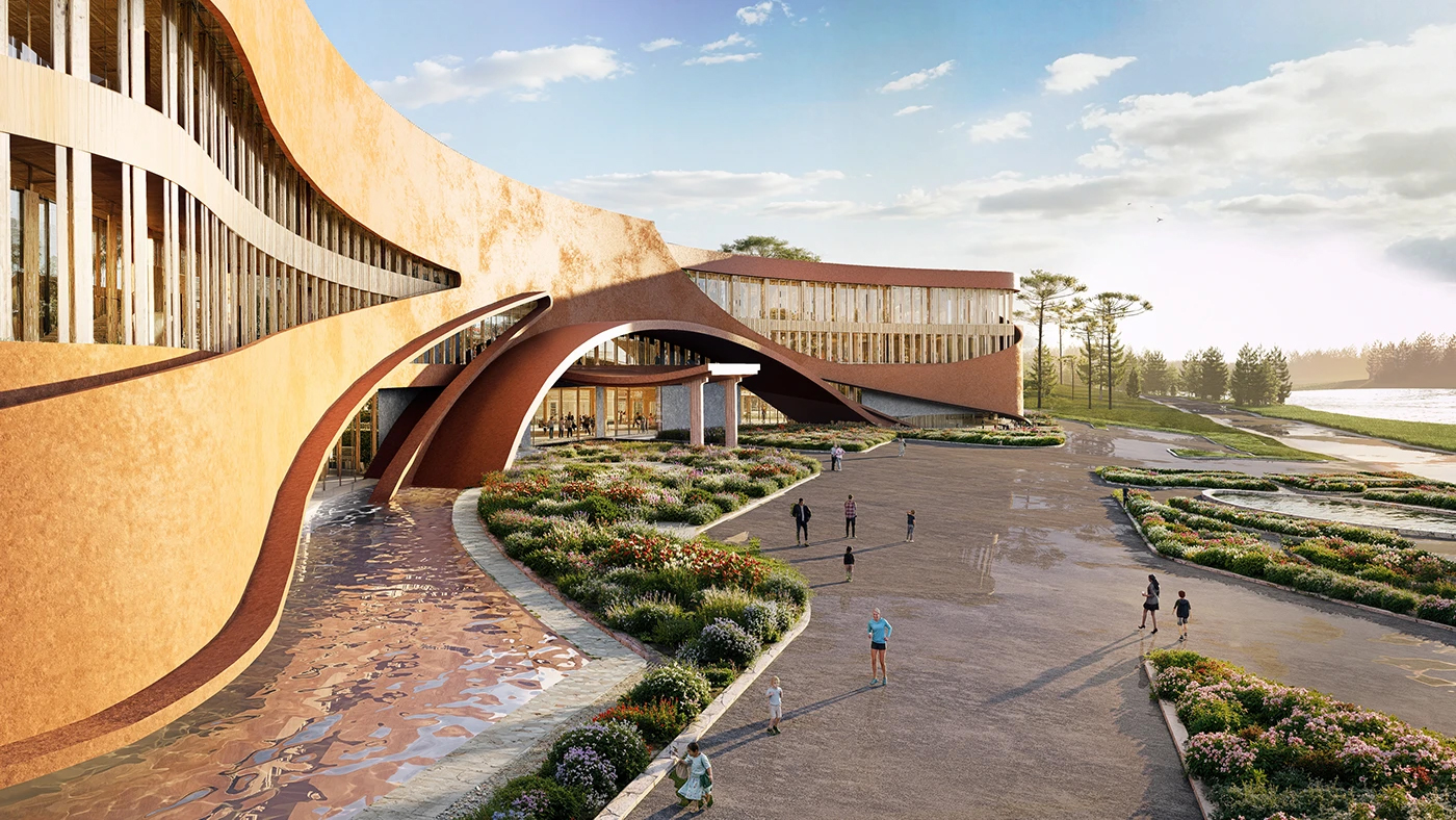 ✅ 和环境零违和:曲面造型顺着地形走,暖棕肌理呼应自然色调,站湖边看建筑像从树林里 “长” 出来的,完全没破坏环境氛围