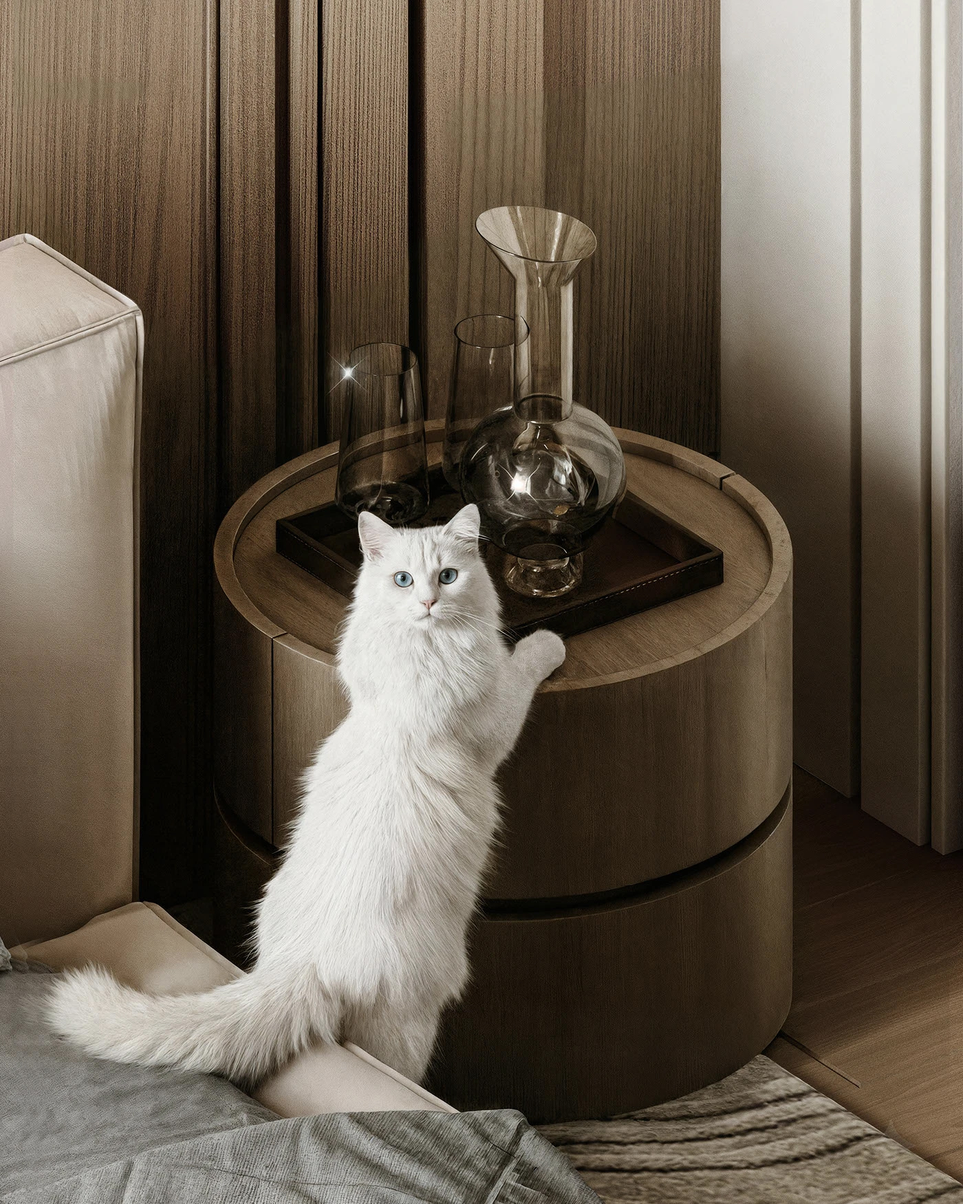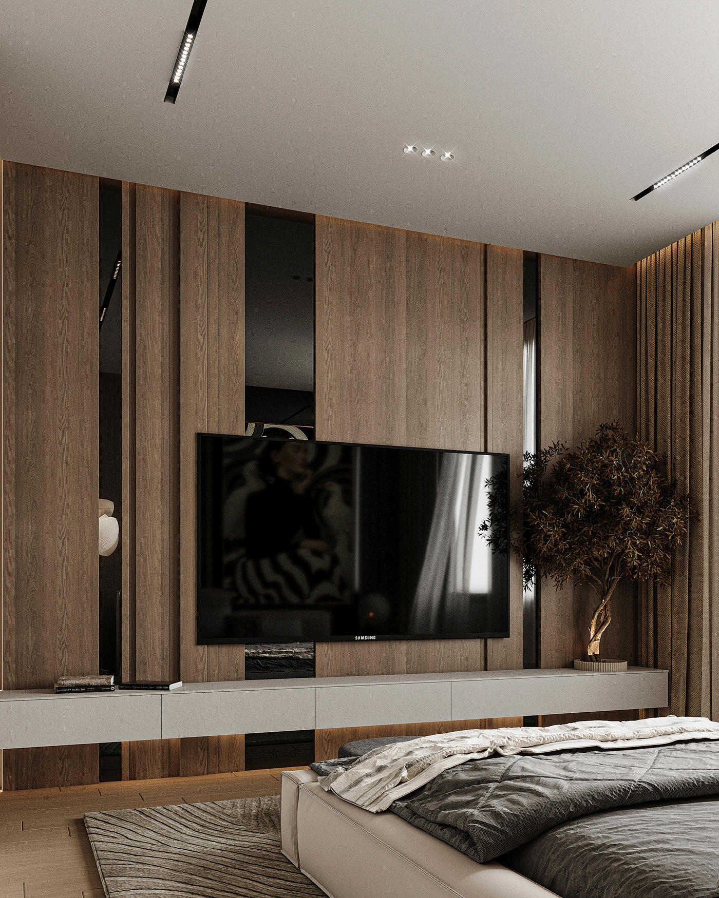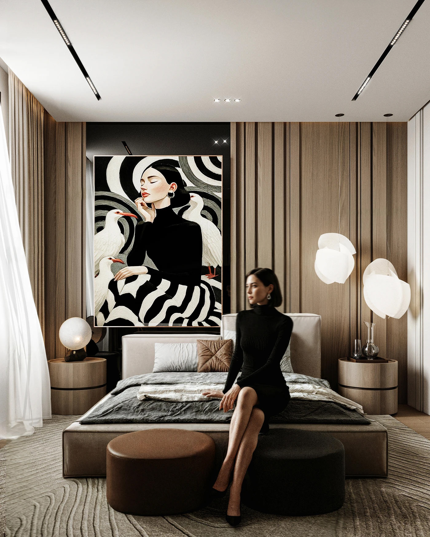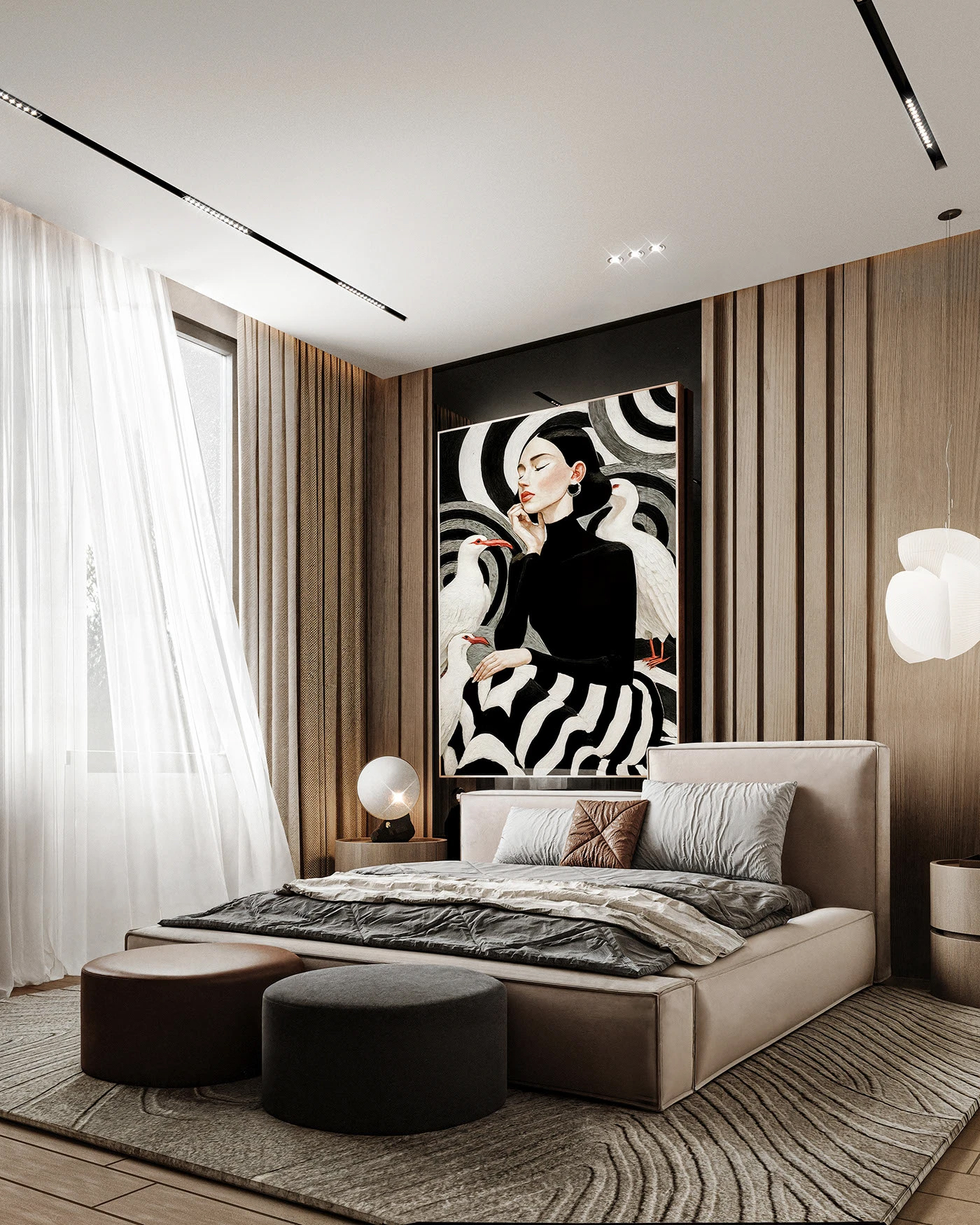 谁懂啊!室内设计培训案例:这卧室直接把 “高级松弛感” 焊在我心巴上了🤩暖调木饰面柔化了空间棱角,无主灯灯光刚好衬出肌理质感,黑白艺术画一挂,轻奢那味儿瞬间拉满 —— 连小边几的弧度都精准踩在审美点上!