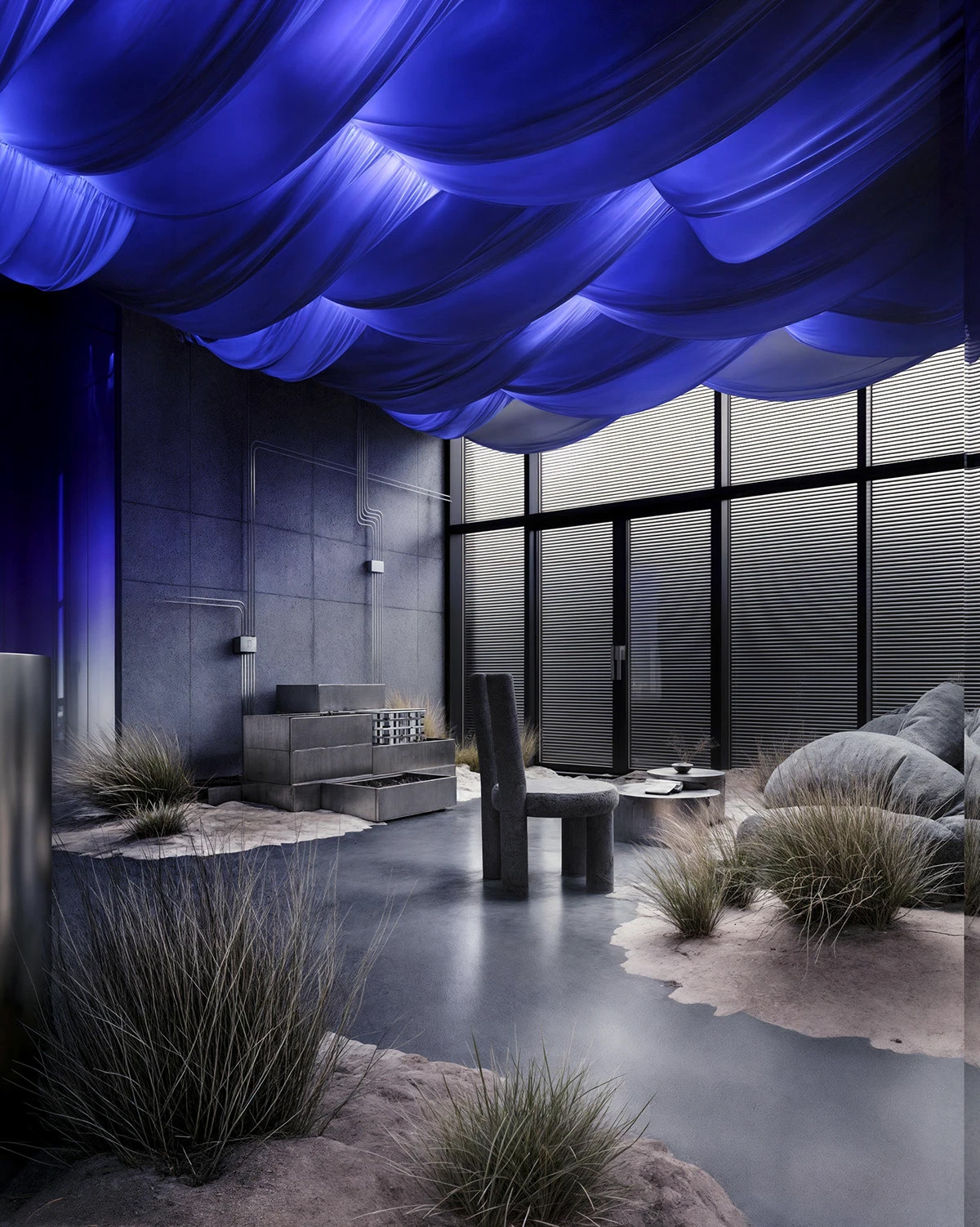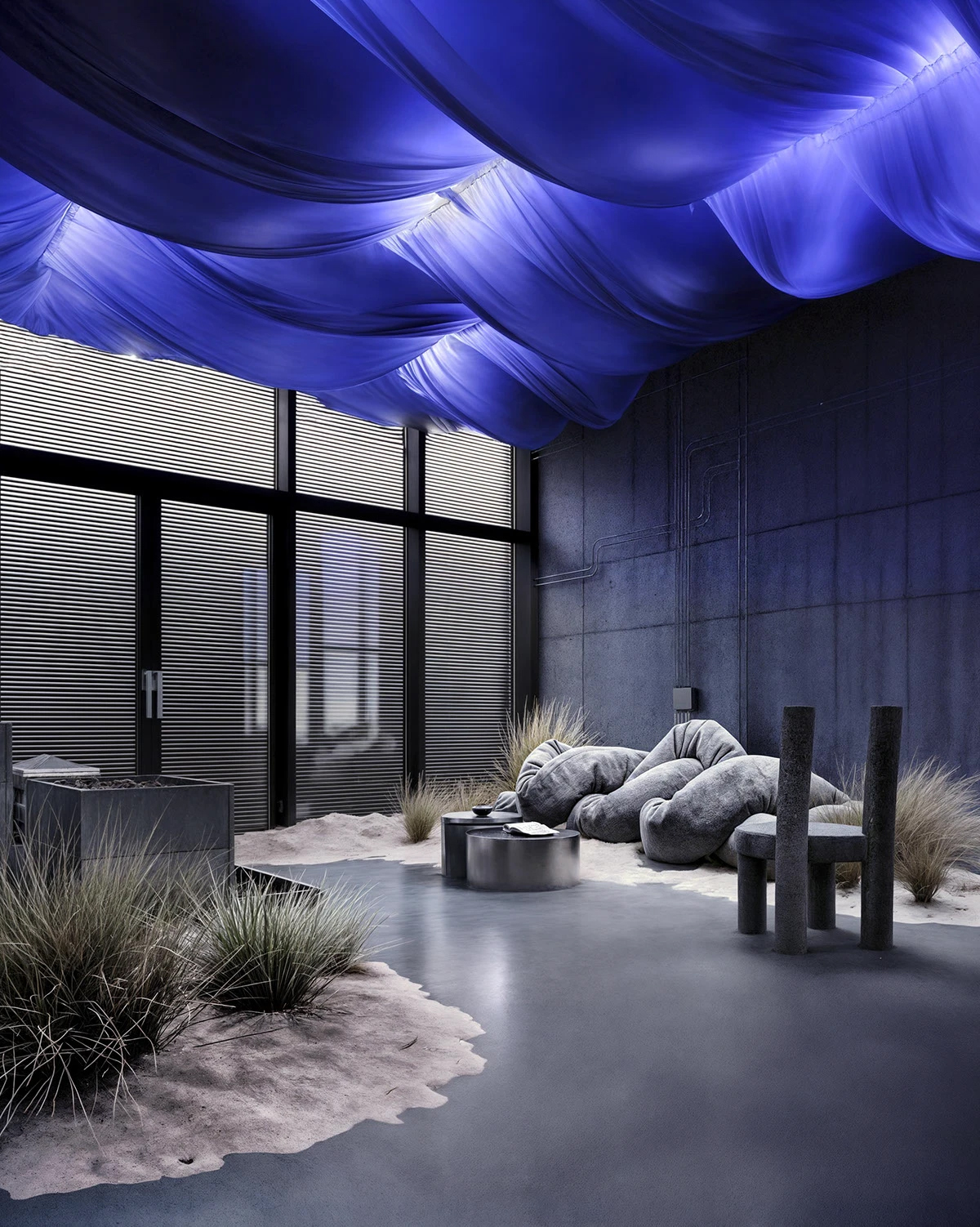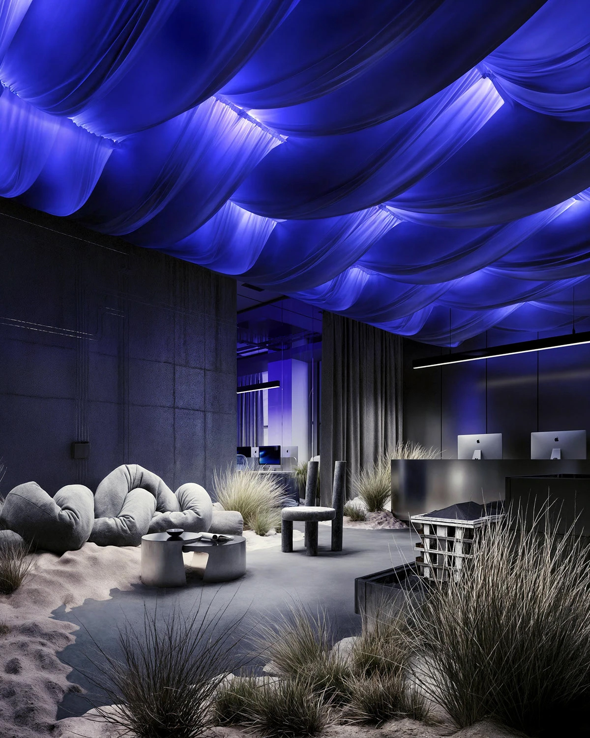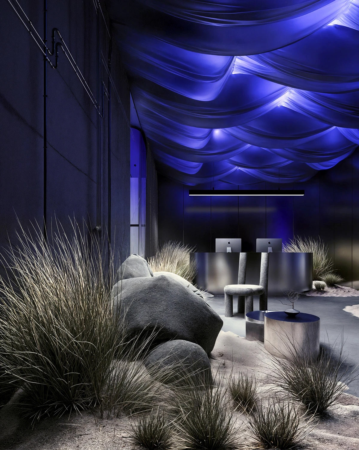 这是赛博自然风办公空间:拿工业风的水泥、金属做基底撑质感,室内设计用蓝色灯光 + 柔纱顶幔裹出未来感,再嵌进沙、草本这些自然元素柔化氛围 —— 既没有纯工业的冷硬疏离,也没有纯自然的松散随性,把 “上班像沉浸式打卡” 的体验焊在了空间里。
