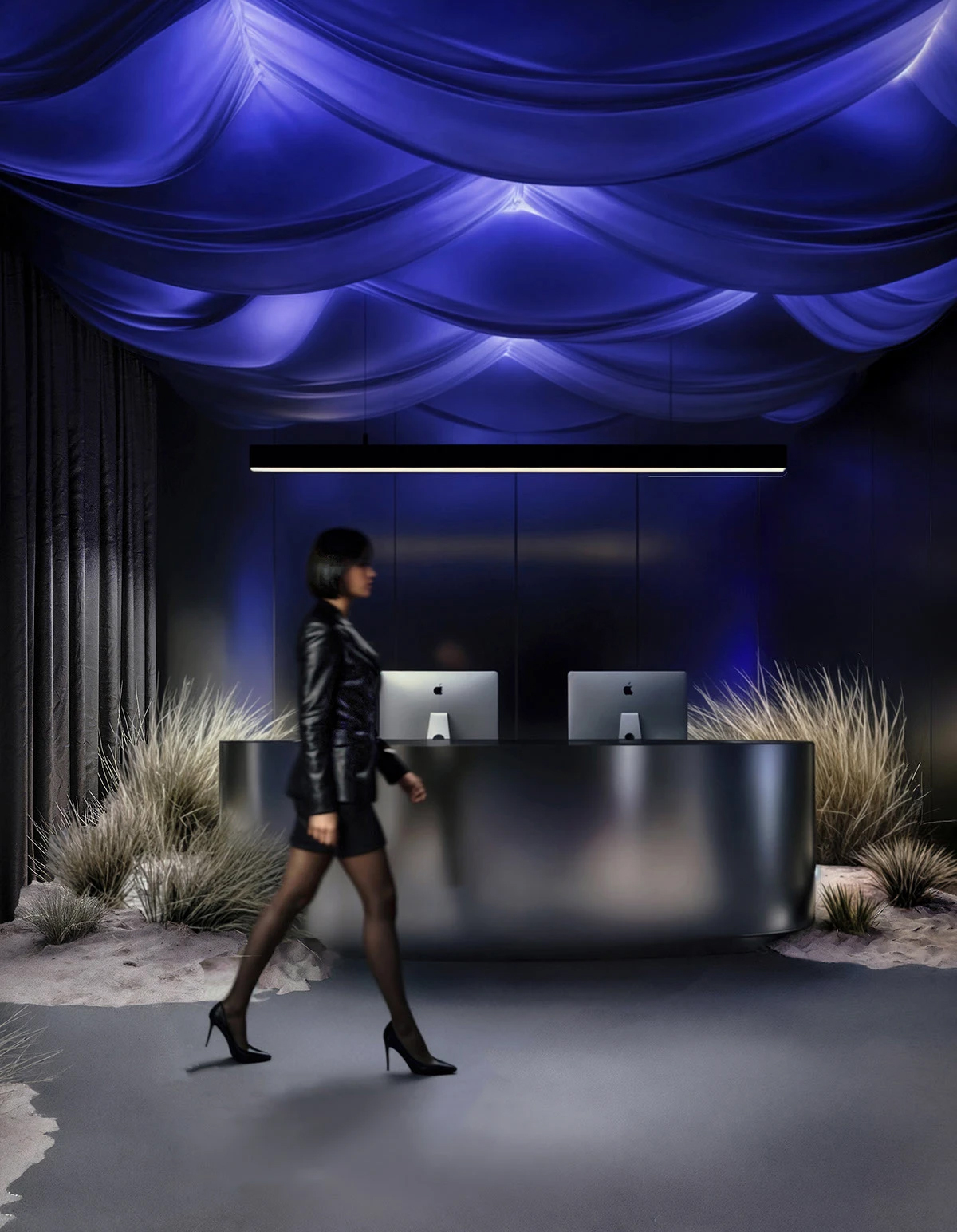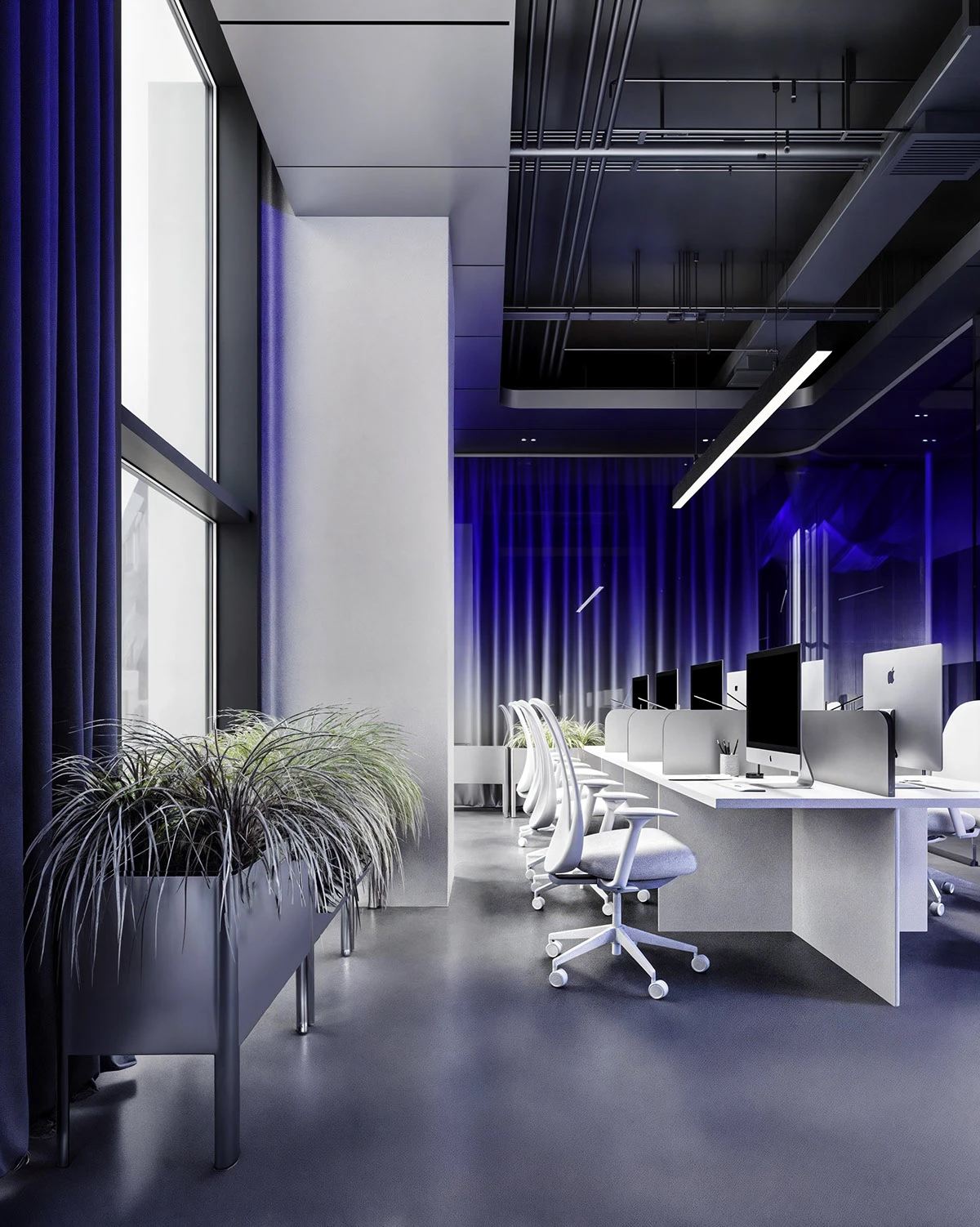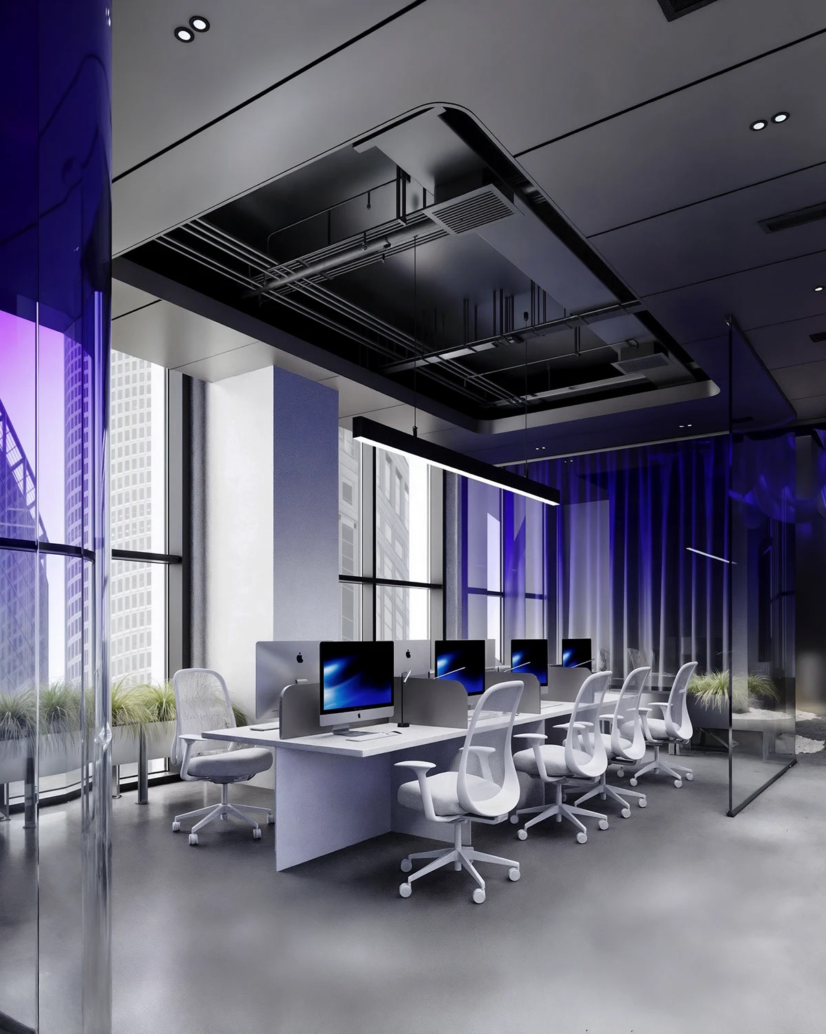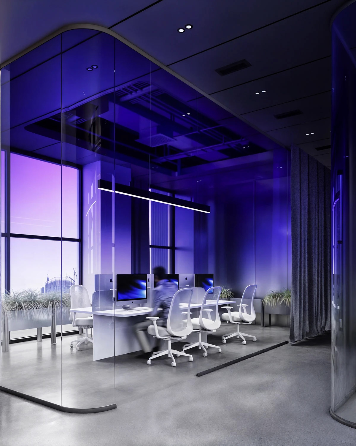 这是赛博自然风办公空间:拿工业风的水泥、金属做基底撑质感,室内设计用蓝色灯光 + 柔纱顶幔裹出未来感,再嵌进沙、草本这些自然元素柔化氛围 —— 既没有纯工业的冷硬疏离,也没有纯自然的松散随性,把 “上班像沉浸式打卡” 的体验焊在了空间里。