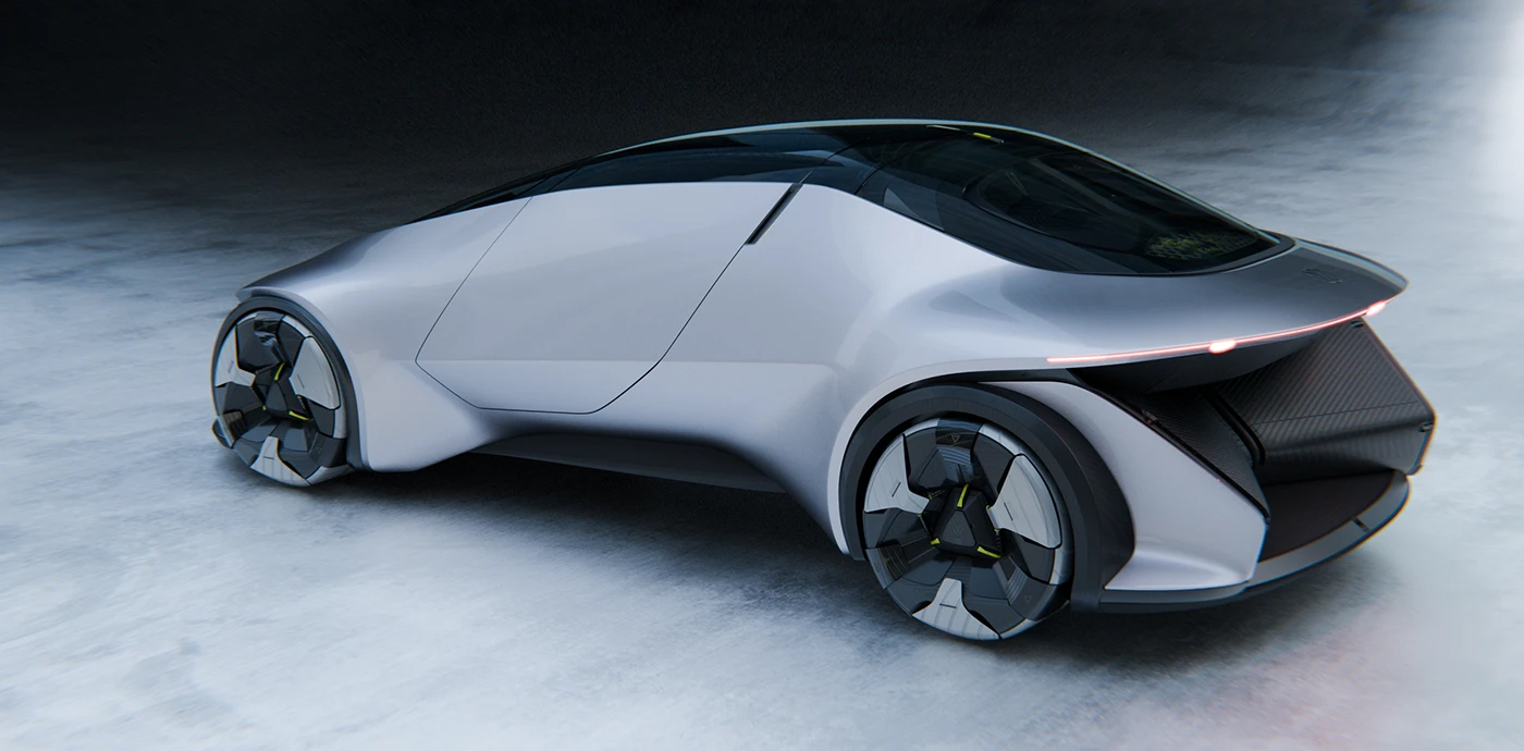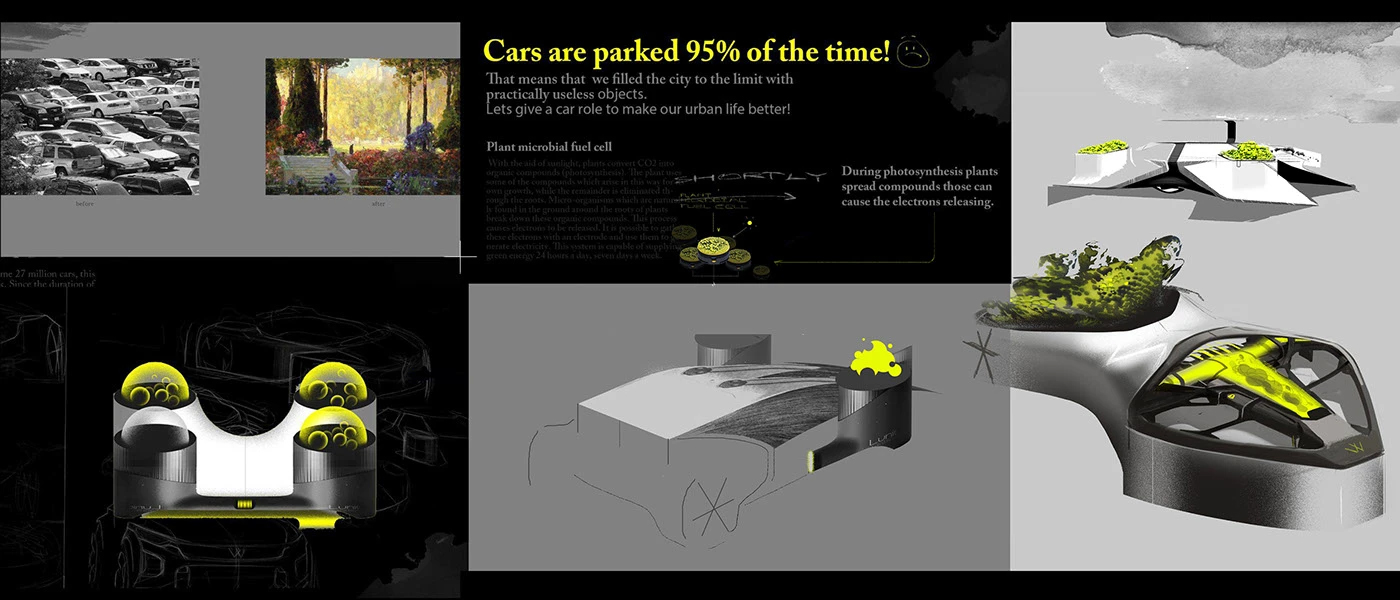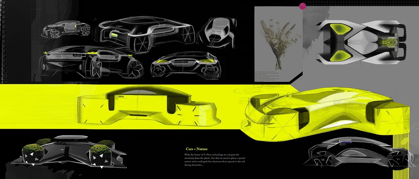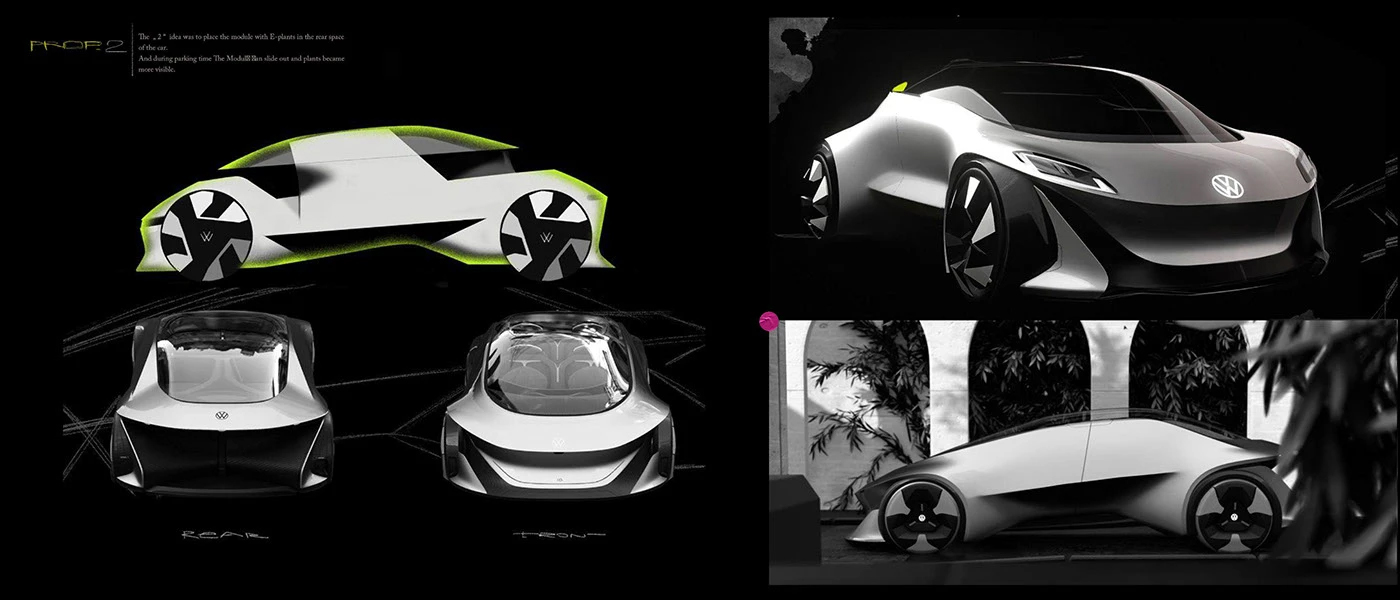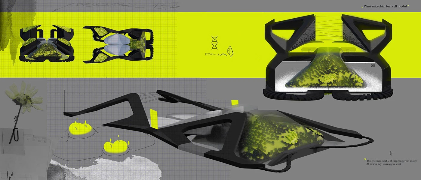 这是科技生态融合风:拿未来感的车身形态(流畅曲面 + 几何轮毂)撑满科技质感,再嵌进植物模块 + 微生物燃料电池的生态功能,把 “代步工具” 直接升级成 “能发电的移动绿植”—— 既没有纯科技车的冰冷疏离,也没有纯生态设计的松散随性。