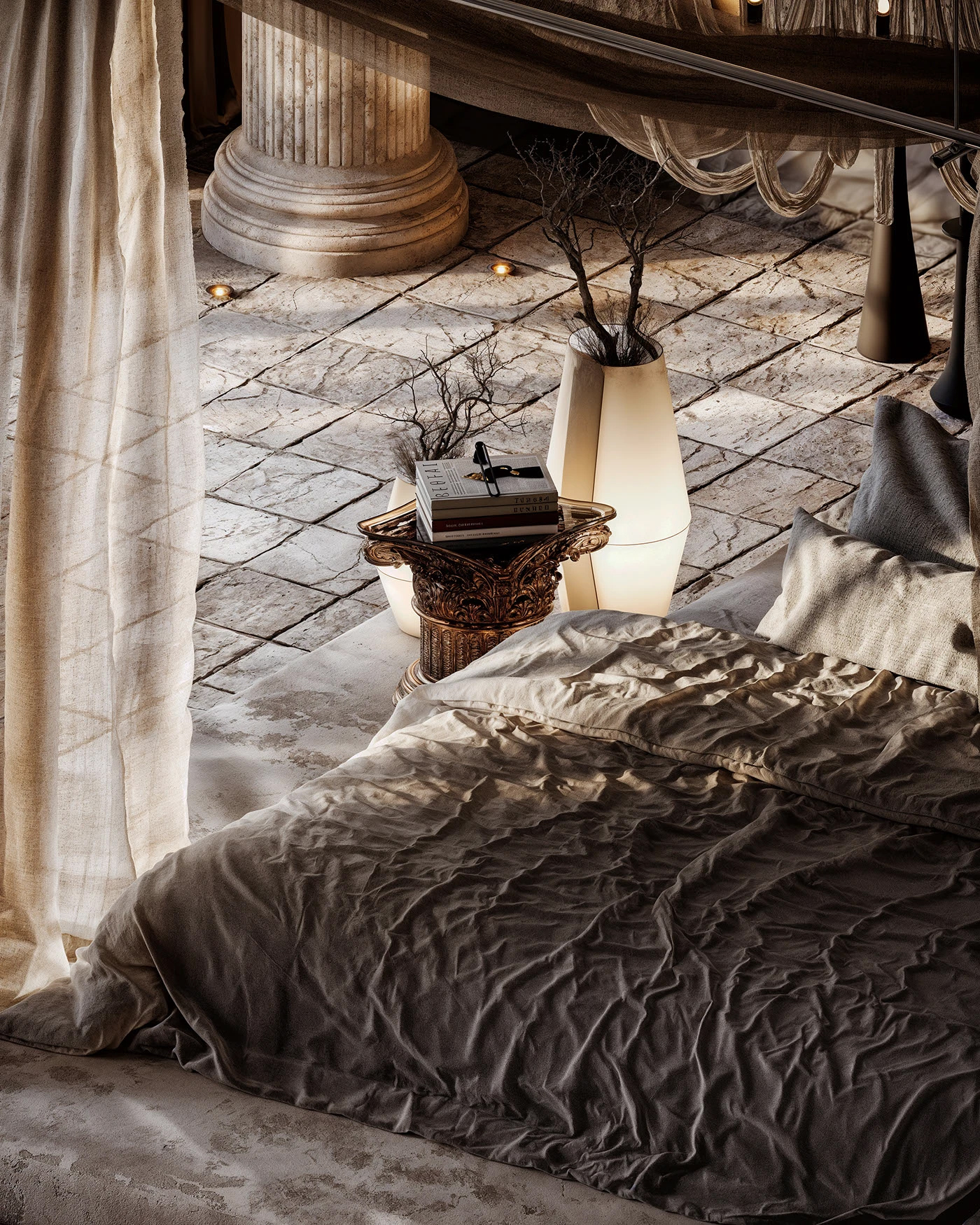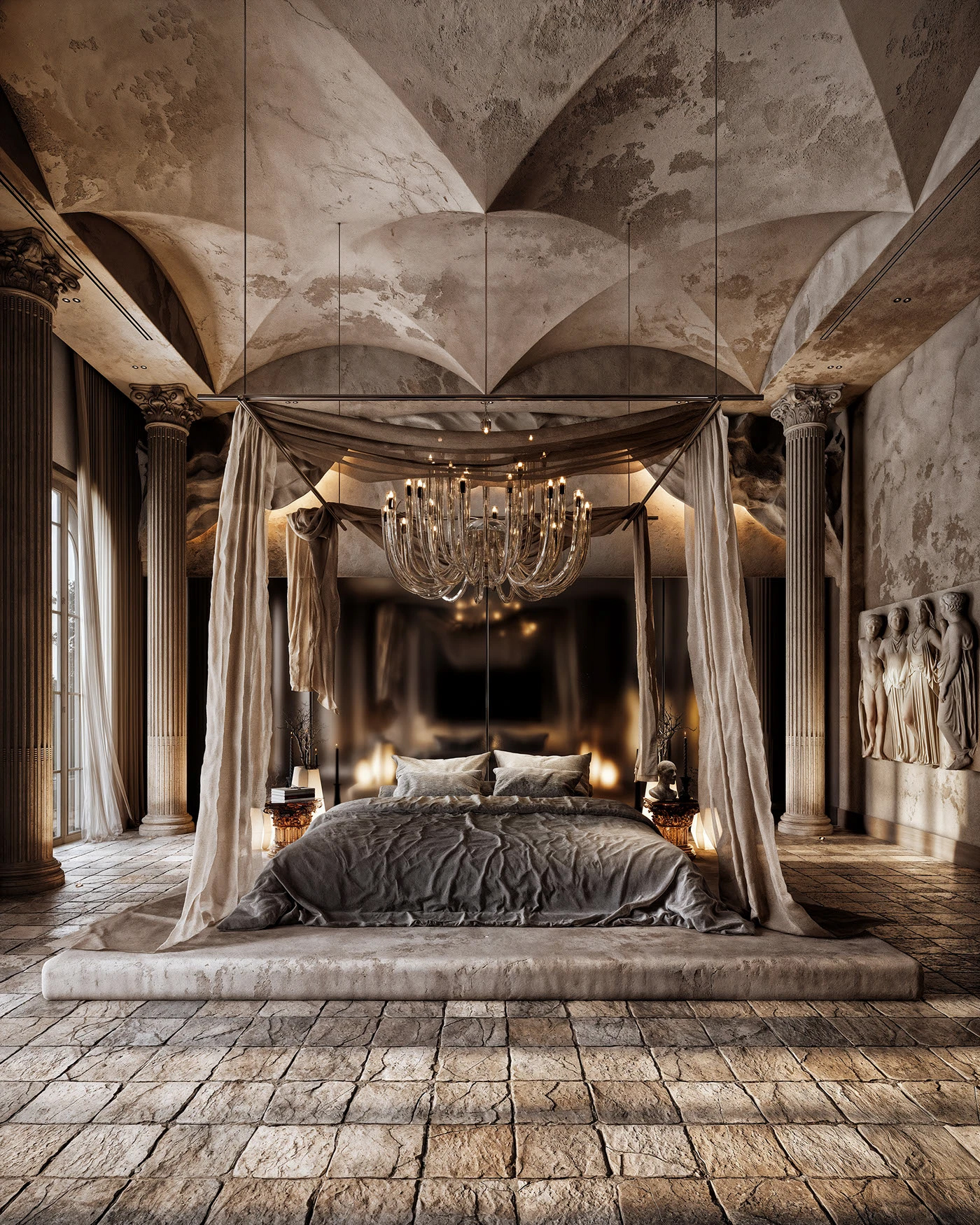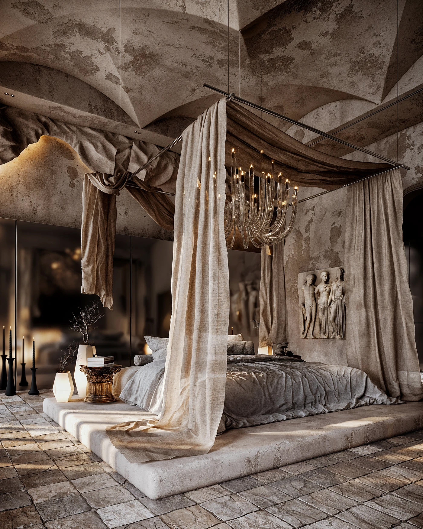 这组复古罗马风卧室直接把 “古典奢华” 焊在审美上了✨