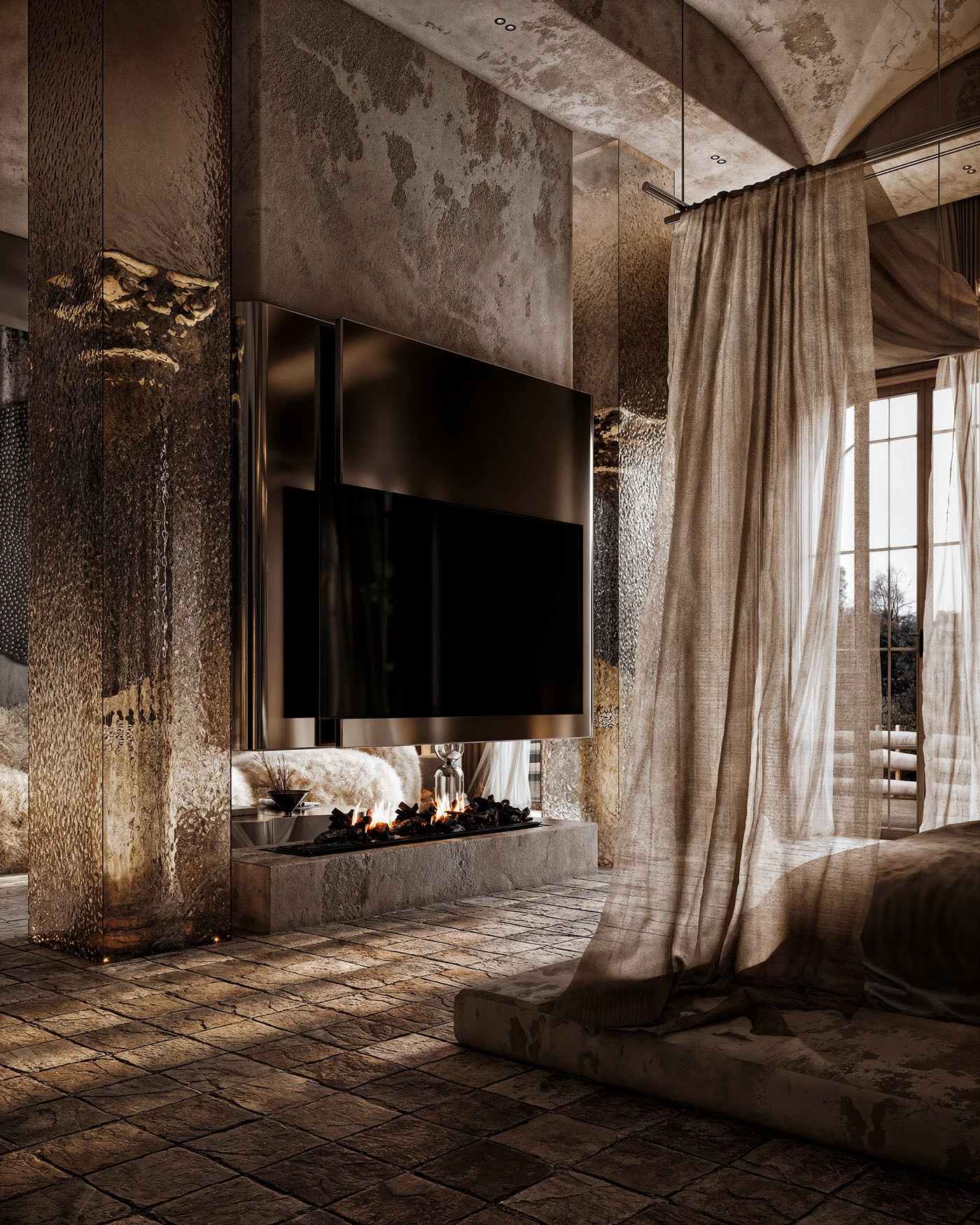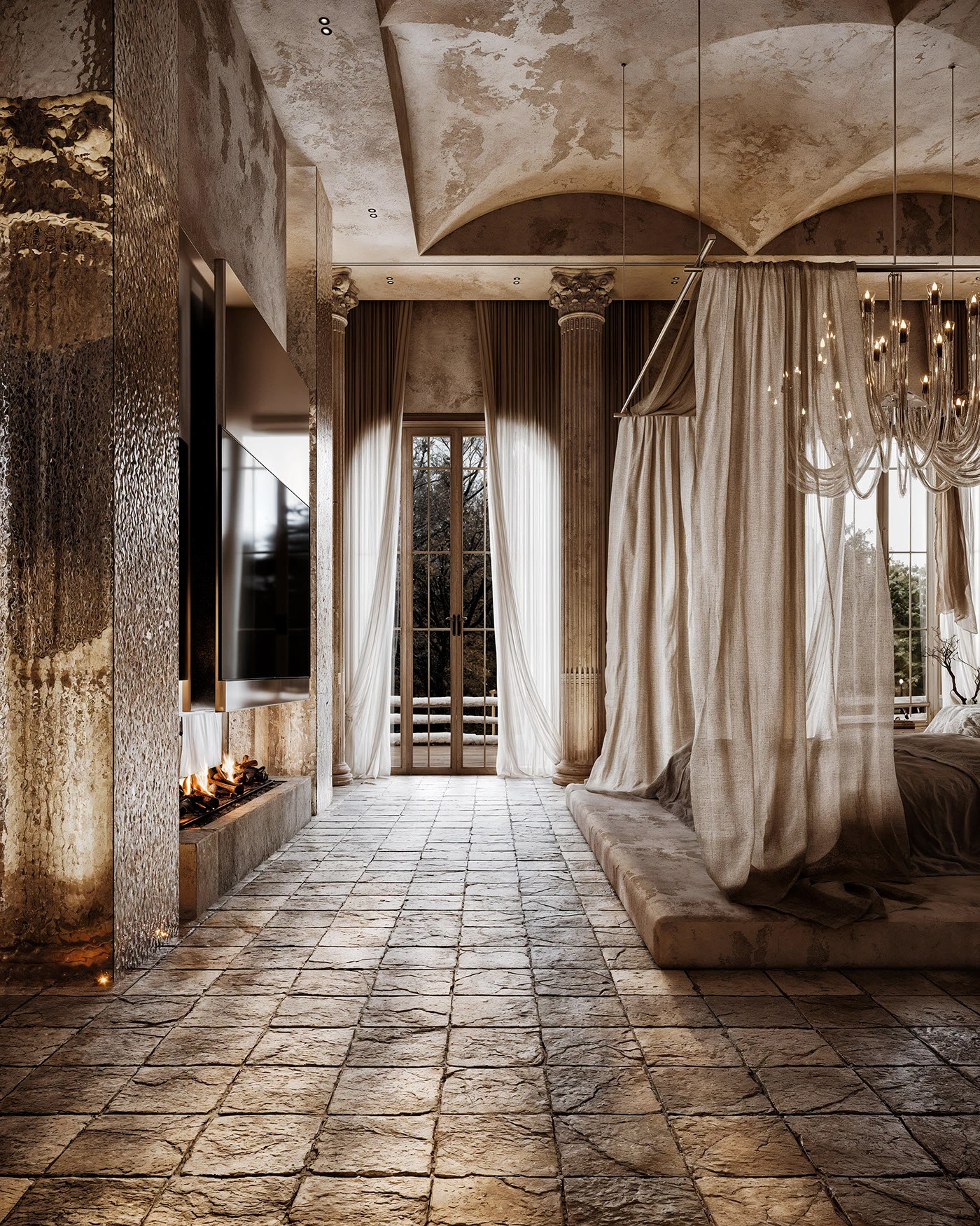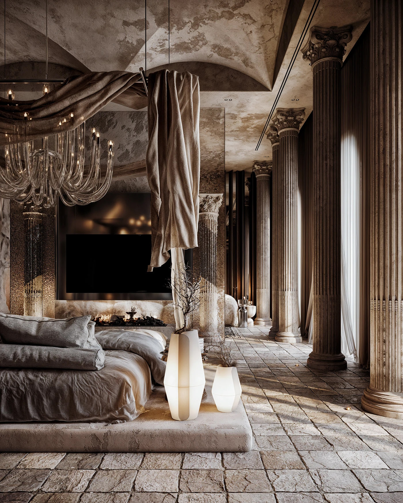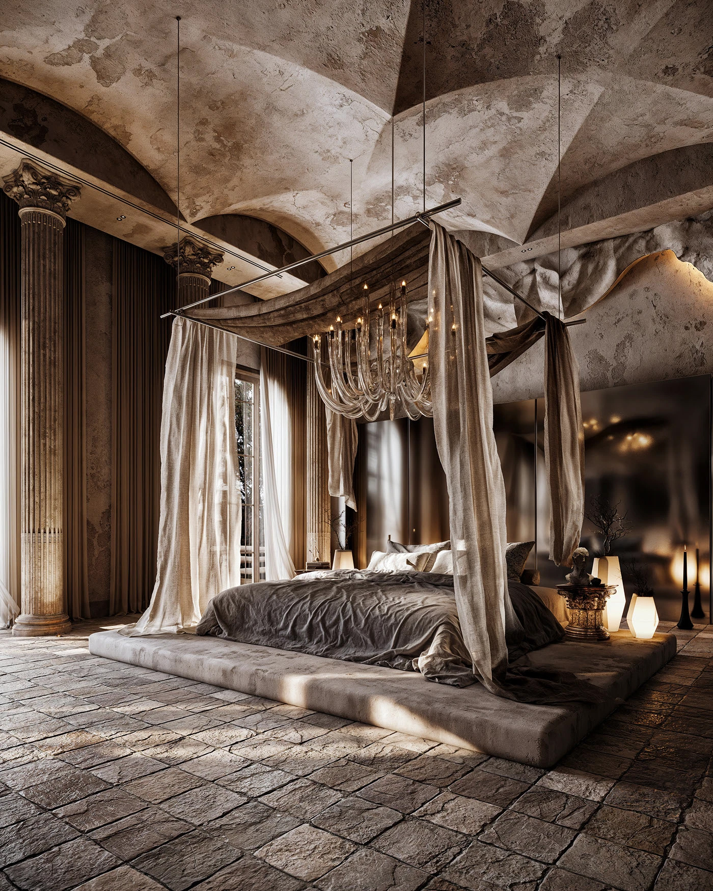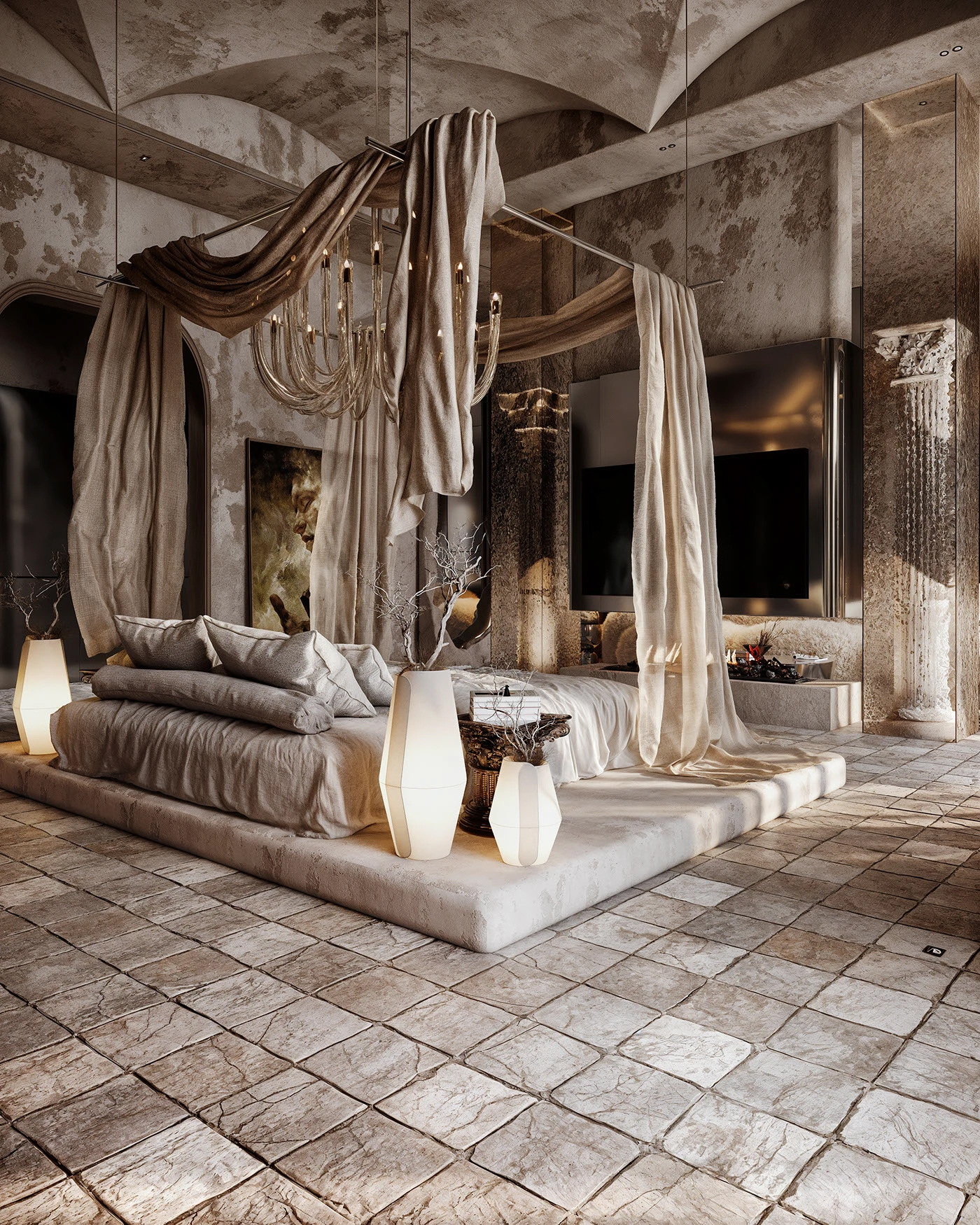 科林斯柱式、斑驳肌理穹顶、雕塑装饰是古典魂,悬浮床幔、水晶吊灯、柔纱帘又揉进现代慵懒 —— 旧时光的厚重感,和当下的松弛感居然这么搭!