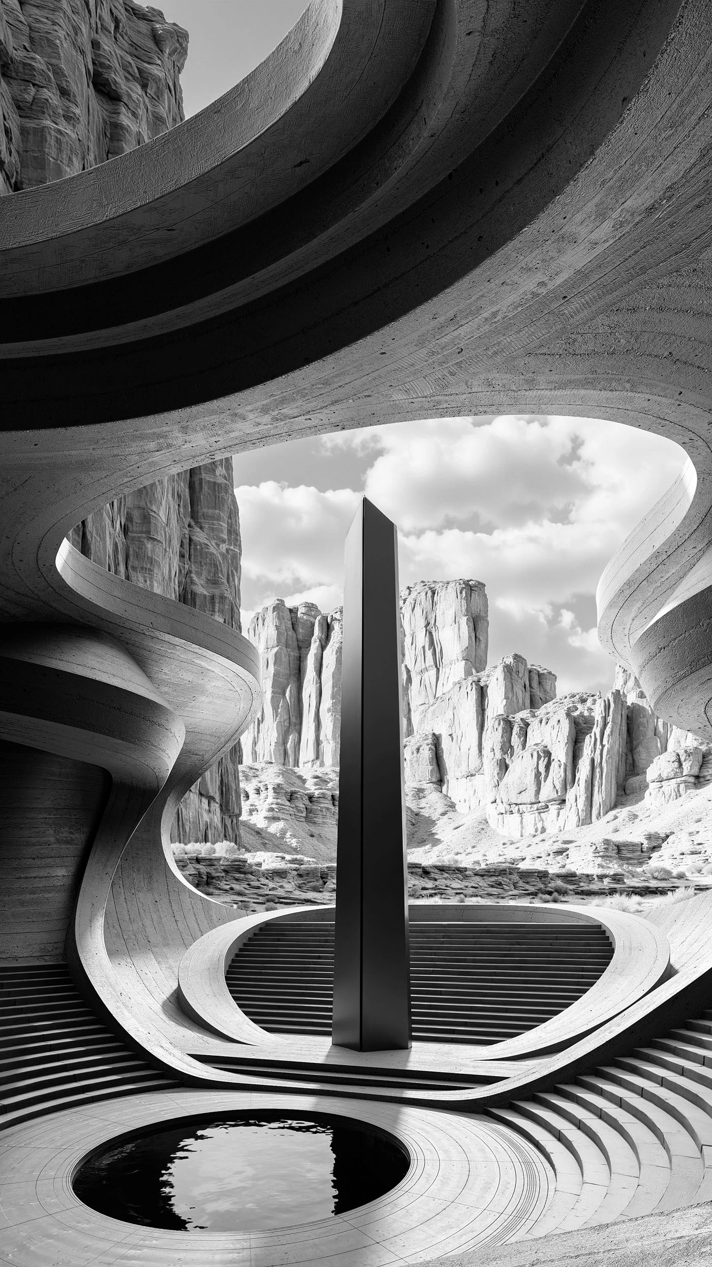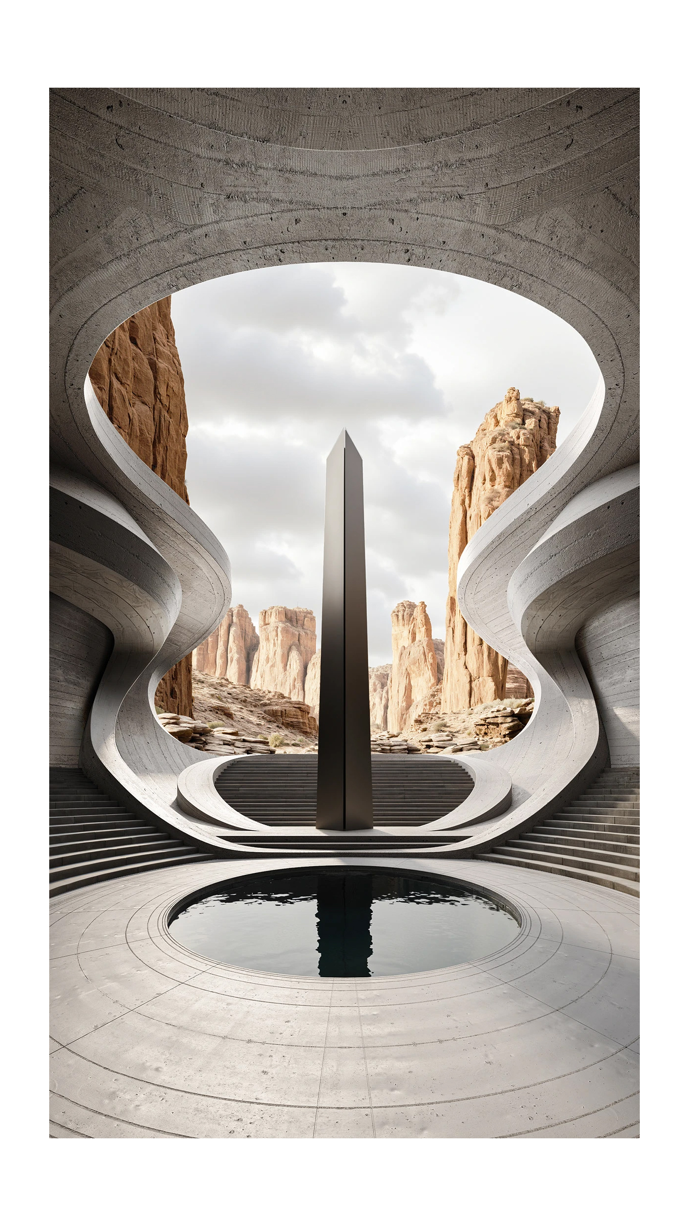 这是超现实未来主义建筑风:以流动的水泥曲面为核心语言,融合峡谷地貌的自然粗犷,用极简黑白灰(或低饱和大地色)营造冷峻的仪式感。方尖碑、水镜等元素强化了超现实的朝圣氛围,把 “自然地貌” 与 “未来建筑” 无缝焊在一起,既有水泥的硬朗肌理,又有曲线的柔和流动,是科幻感与自然感的极致碰撞。