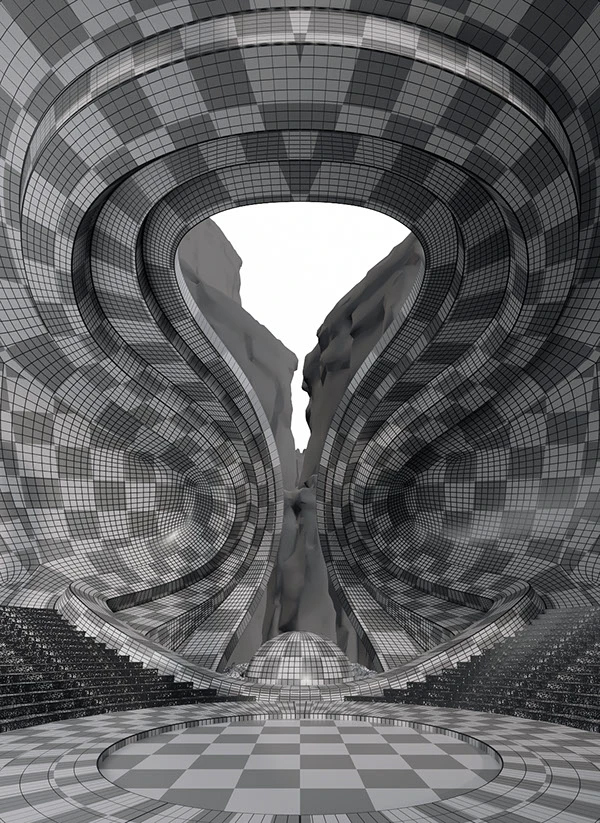 - Photoshop 后期:用 PS 调整黑白灰对比,叠加峡谷地貌的背景,强化超现实氛围,让建筑和自然无缝融合。