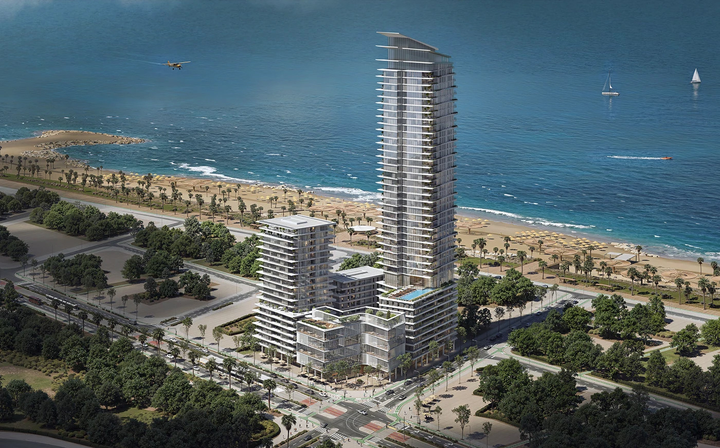 这是典型的现代滨海轻奢高层风:以 “叠层退台” 为核心形态语言,白色金属线条勾勒出层层悬挑的露台,搭配大面积玻璃幕墙,让建筑既像堆叠的晶体,又能最大化引入滨海景观。设计兼顾了城市界面的秩序感与滨海生活的松弛感,退台形成的私享露台、底层开放的商业广场,以及与城市公园、沙滩的景观联动,让 “高层住宅” 不再是冰冷的容器,而是能呼吸的生态社区。