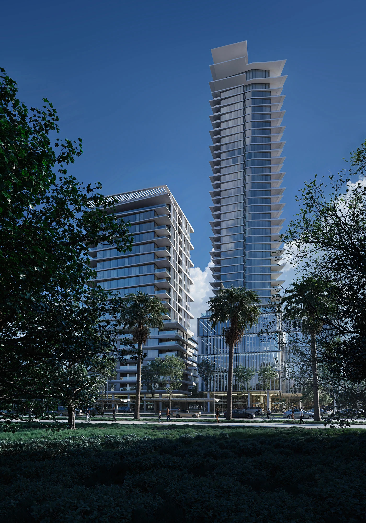 - Photoshop 后期调氛:用 PS 调整色彩饱和度,叠加人物、植被等配景,强化滨海与城市公园的景观联动,让建筑与环境的融合更丝滑。