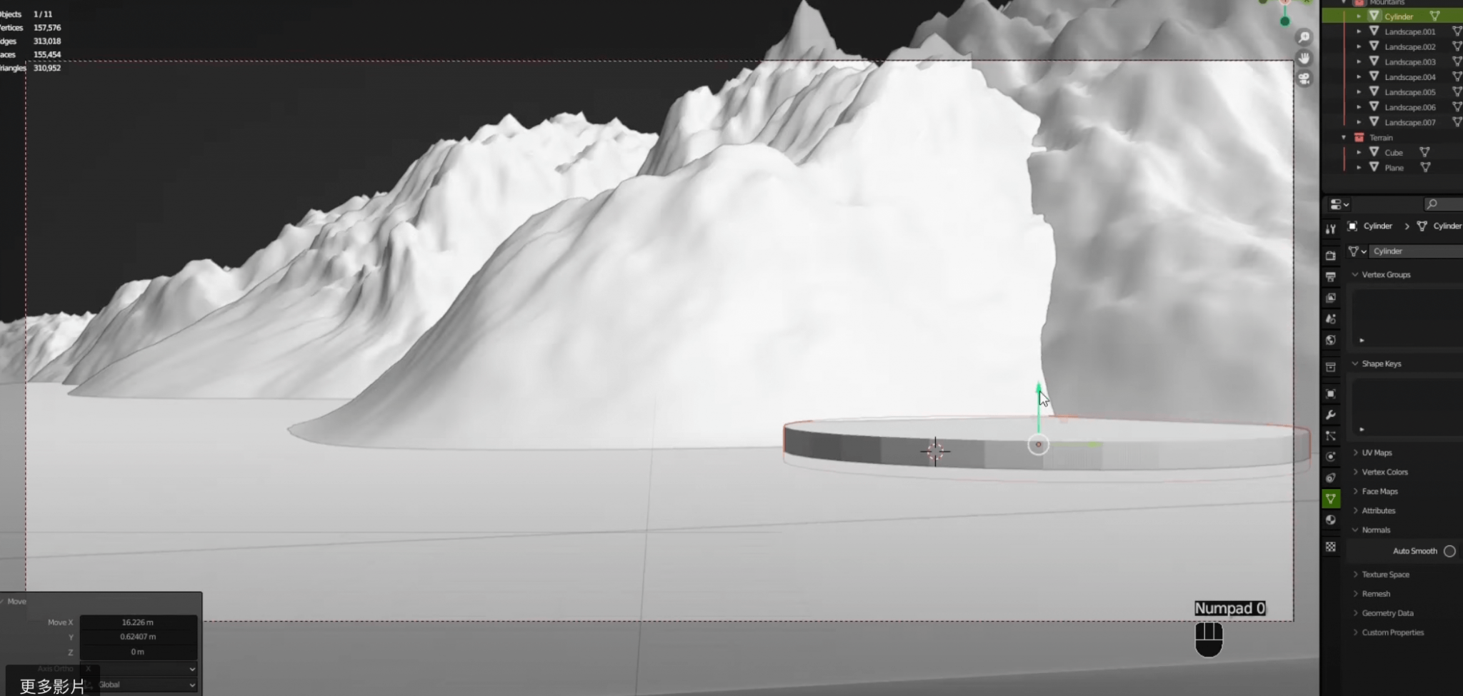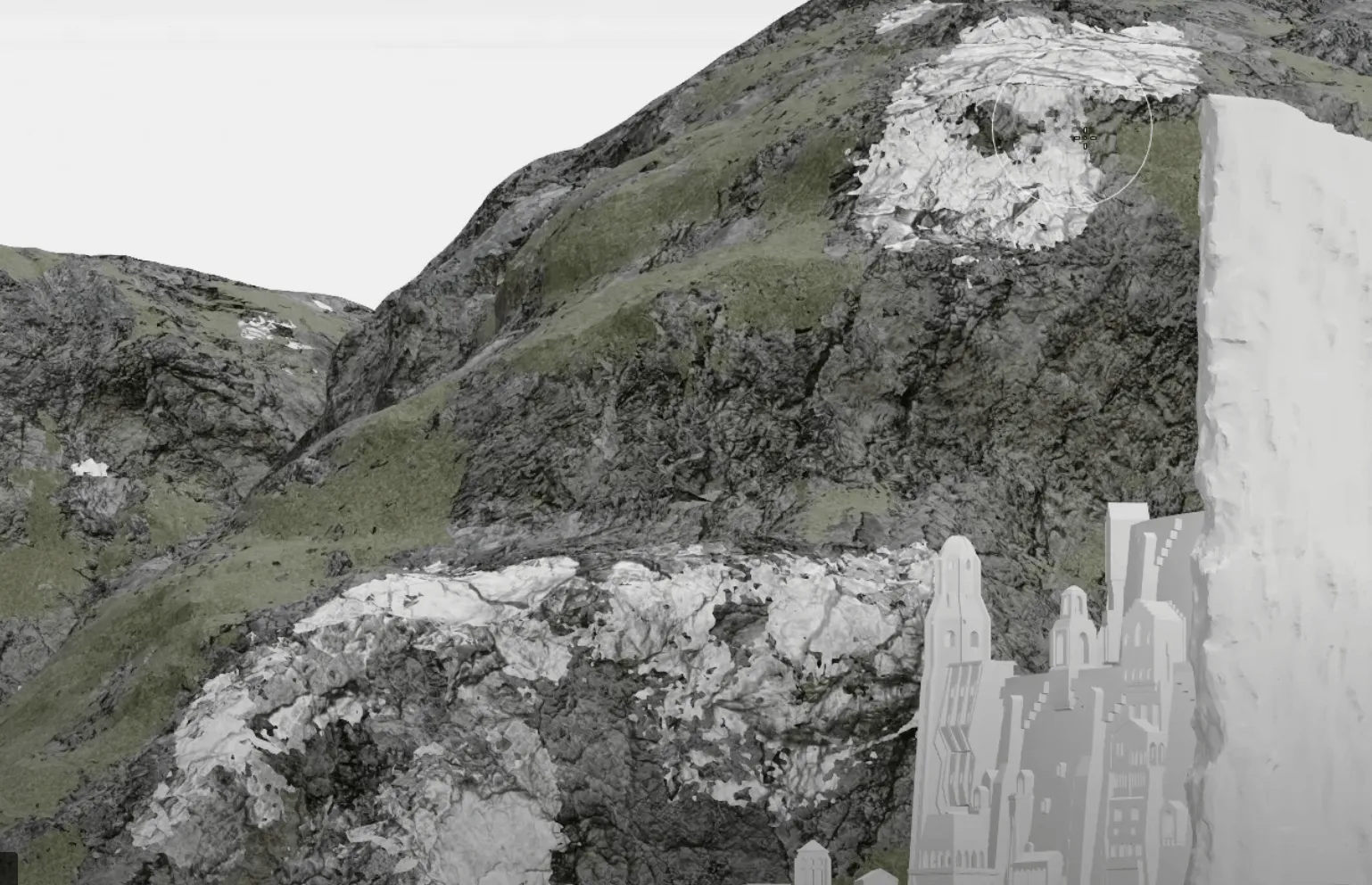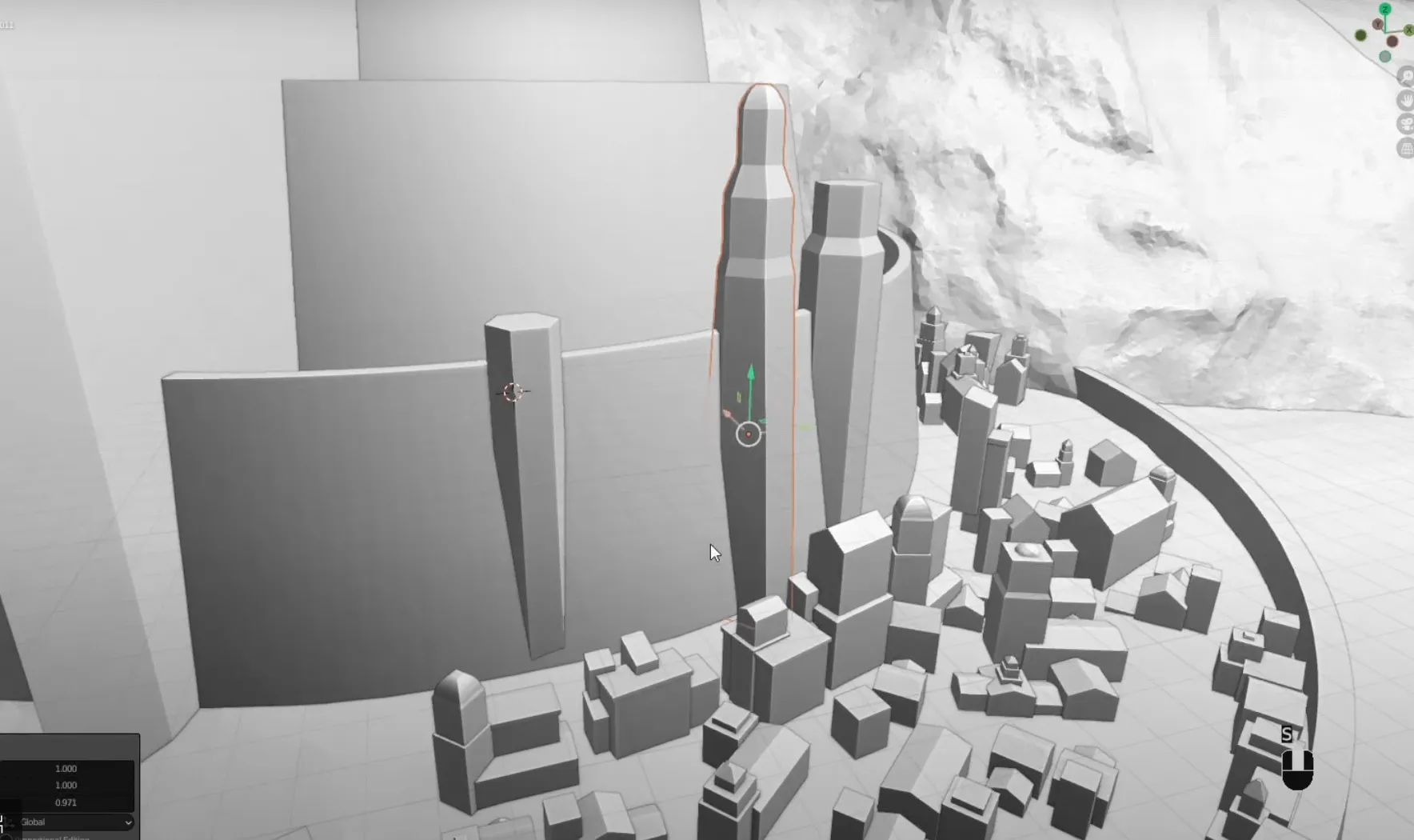 - 操作逻辑:Blender 自带的地形插件(Built-in Addon)无需额外安装,启用后可通过调整 “高度、起伏强度、粗糙度” 等参数,快速模拟米那斯提力斯 “依山而建” 的白山山体形态;再用立方体、平面等基础几何体,勾勒出城市的大致占地面积、海拔层次与核心建筑的位置边界,重点解决 “山与城的空间适配” 问题。
