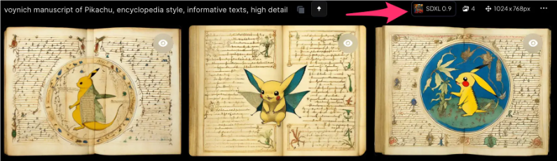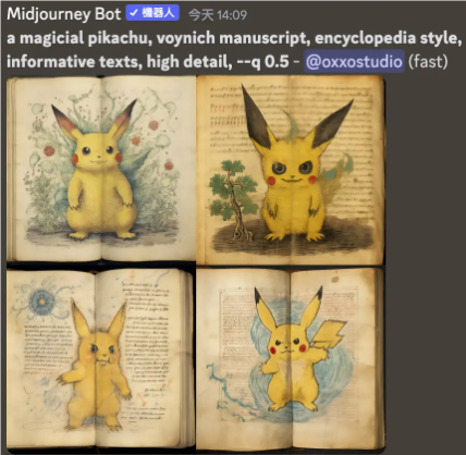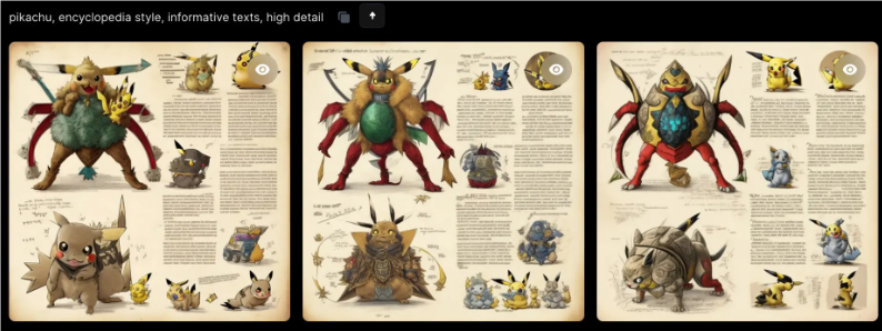 示例:“会魔法的皮卡丘,伏尼契手稿风格,百科全书样式,资讯说明文字,高细节”(对应英文:a magical pikachu, voynich manuscript, encyclopedia style, informative texts, high detail)