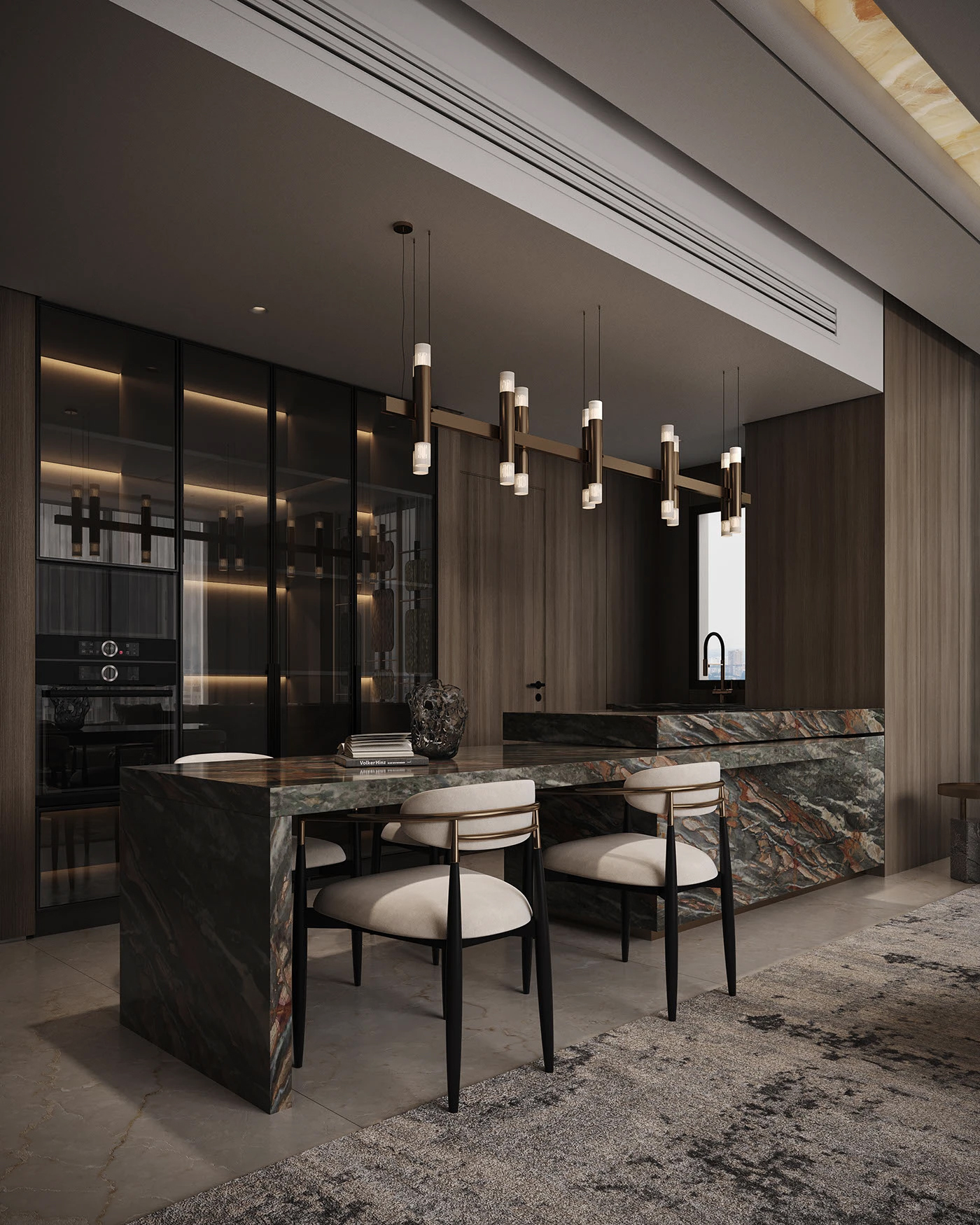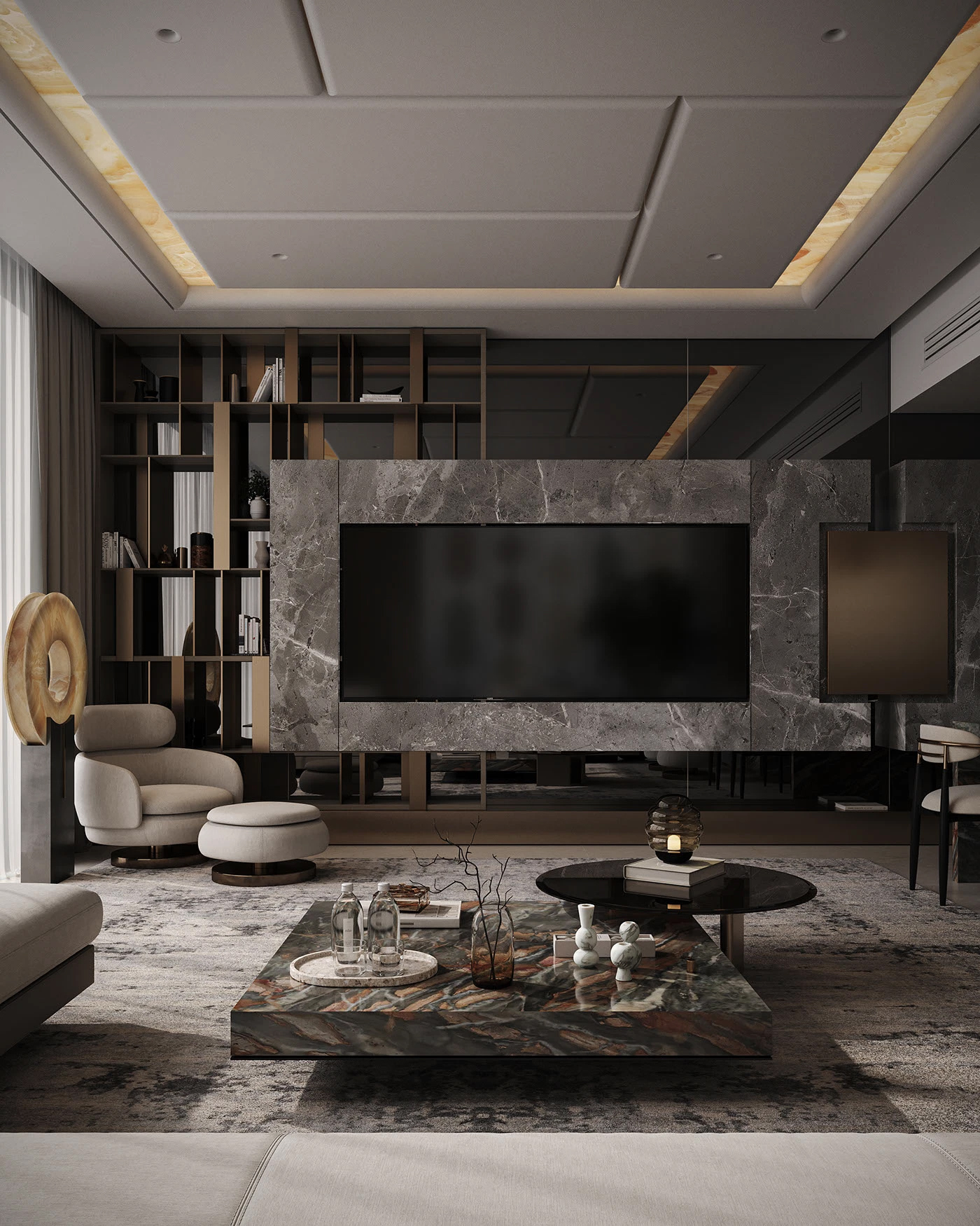 整体以深灰、暖棕为基底,天然大理石的流动纹理自带奢感,金属线条在柜体、吊顶处做精致点缀,软乎乎的米白沙发又中和了冷硬质感,每一处都在诉说 “精致但不张扬” 的生活态度。背景墙的石材拼接、悬浮感的金属置物架,还有那盏透光的玉石圆环落地灯,细节里全是对品质的执念。