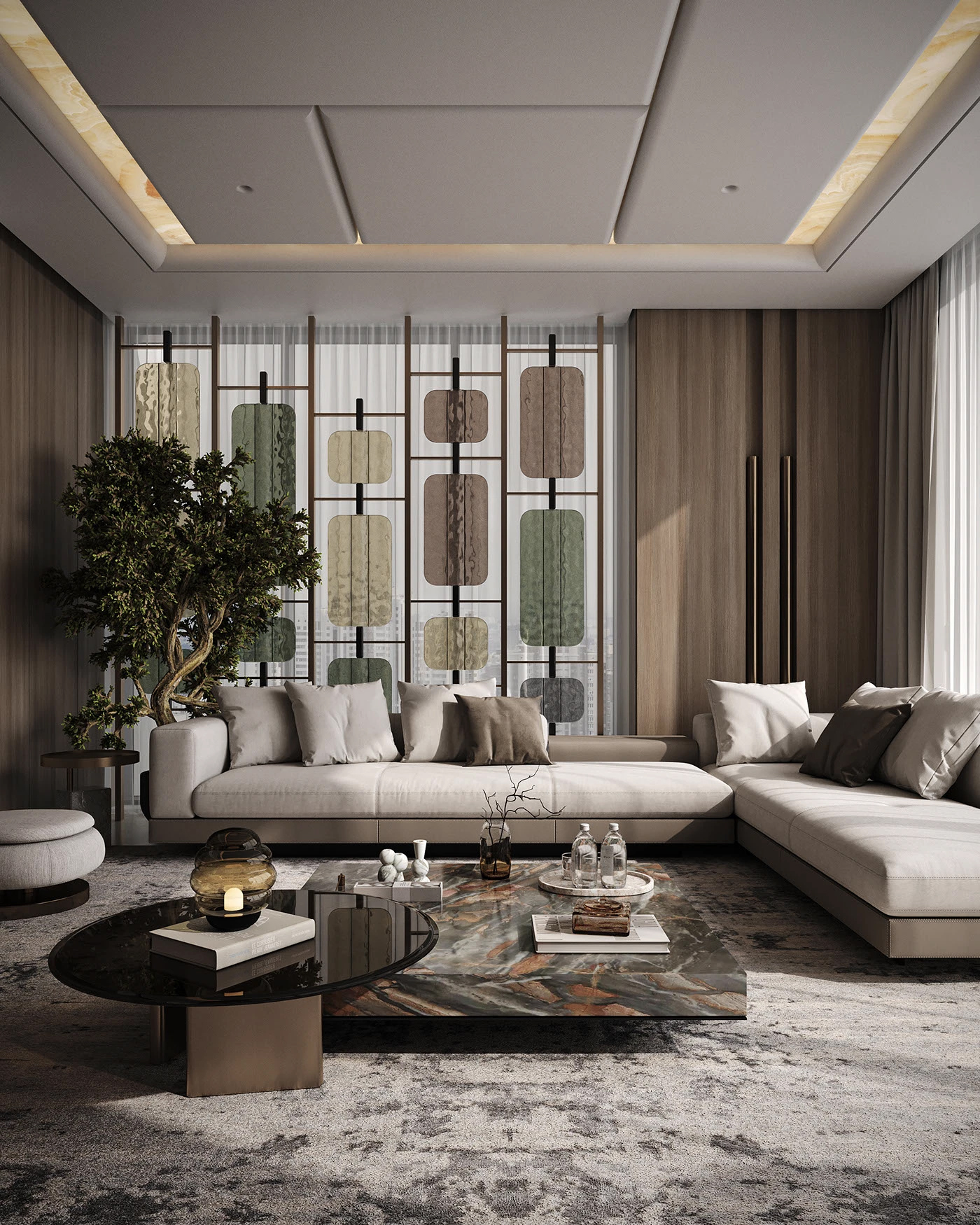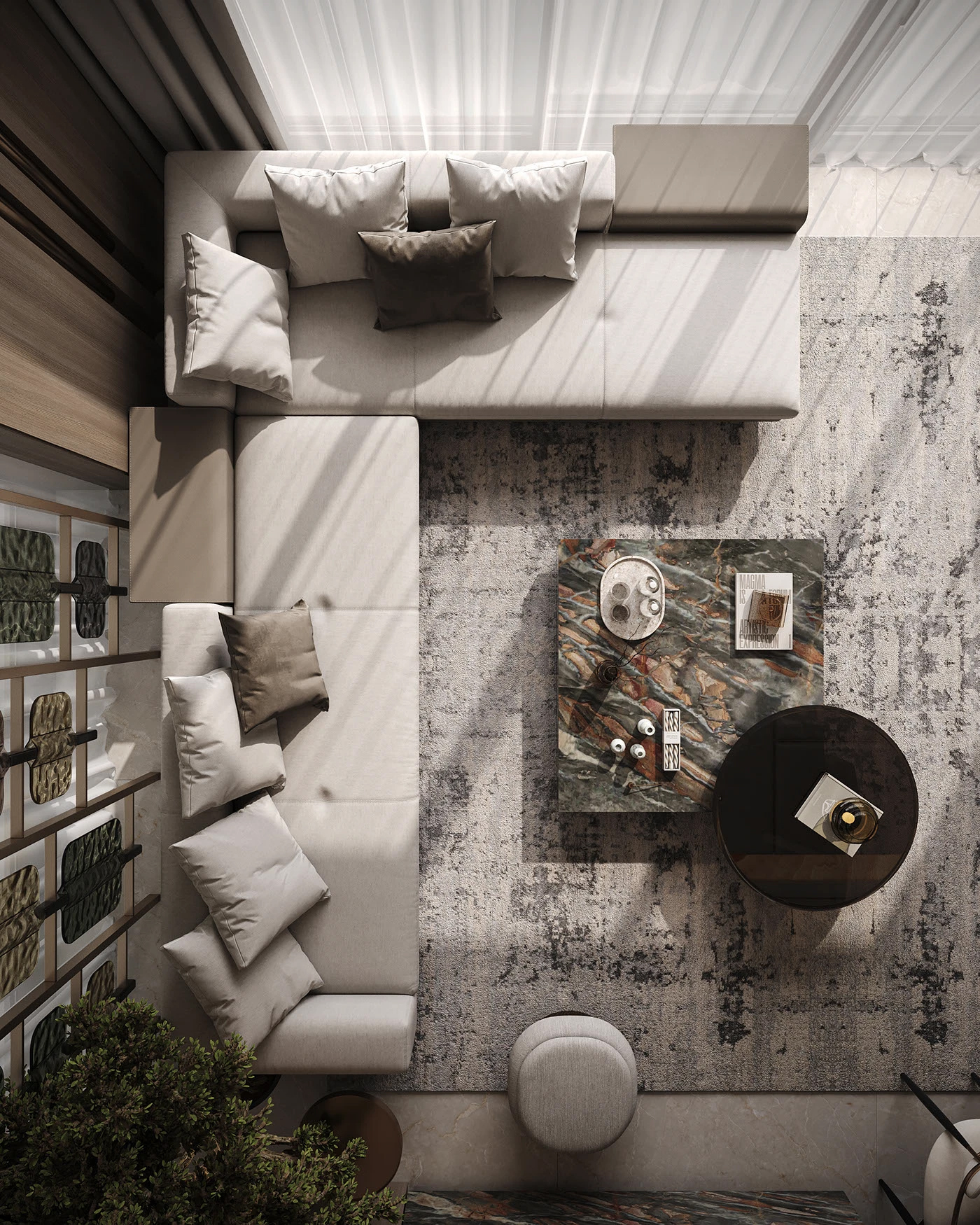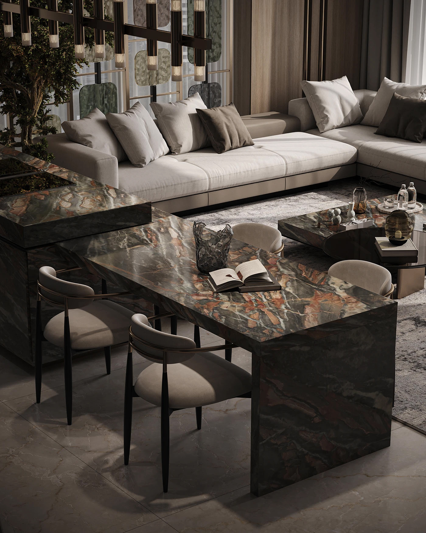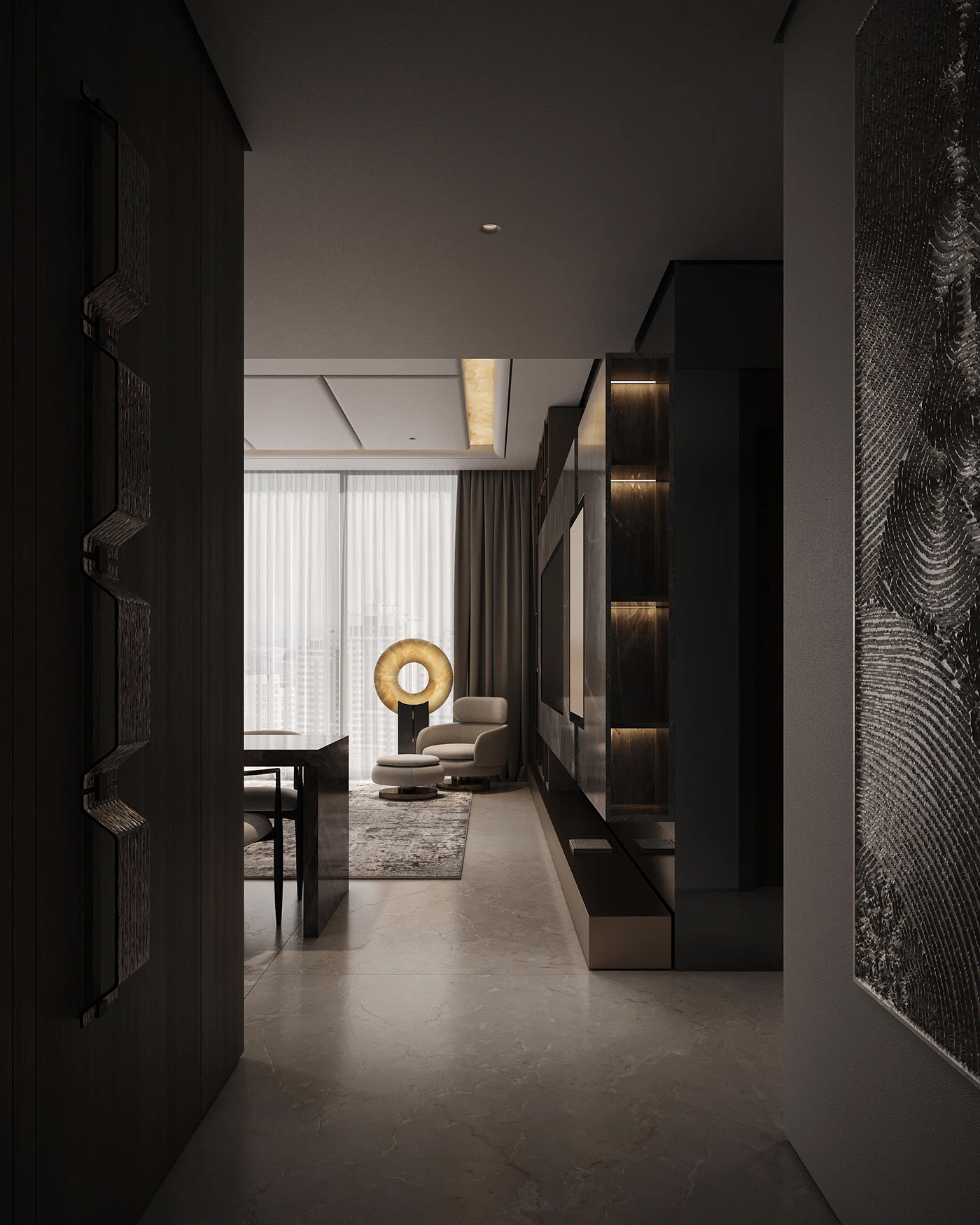 很多宝子好奇这种效果怎么实现,其实从建模到出图,每一步都有章法。我习惯用 3ds Max 搭建整体空间框架,精准还原结构细节,大到沙发的曲面弧度,小到石材的拼接缝隙,都要在建模阶段抠到极致。渲染首选 Corona Renderer,它对材质的光影还原太绝了,大理石的通透感、金属的细腻反光,调参数的过程就像给空间 “打光化妆”。最后用 Photoshop 做后期精修,微调色彩层次、添加氛围光影,让画面更有呼吸感。