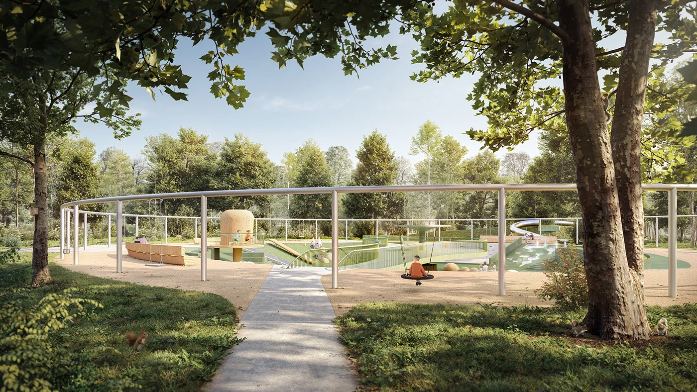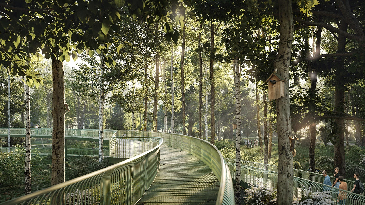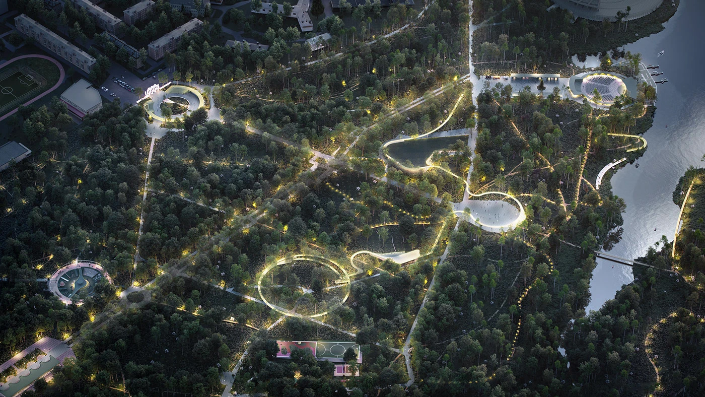 这套是现代生态自然景观设计,以曲线流线型构筑架空廊道、滨水公建,建筑完全消隐于林木水系之间,兼顾休闲游乐与生态共生,用自然光影、绿植水系打造治愈松弛的公共景观,简约灵动又贴合自然肌理。
