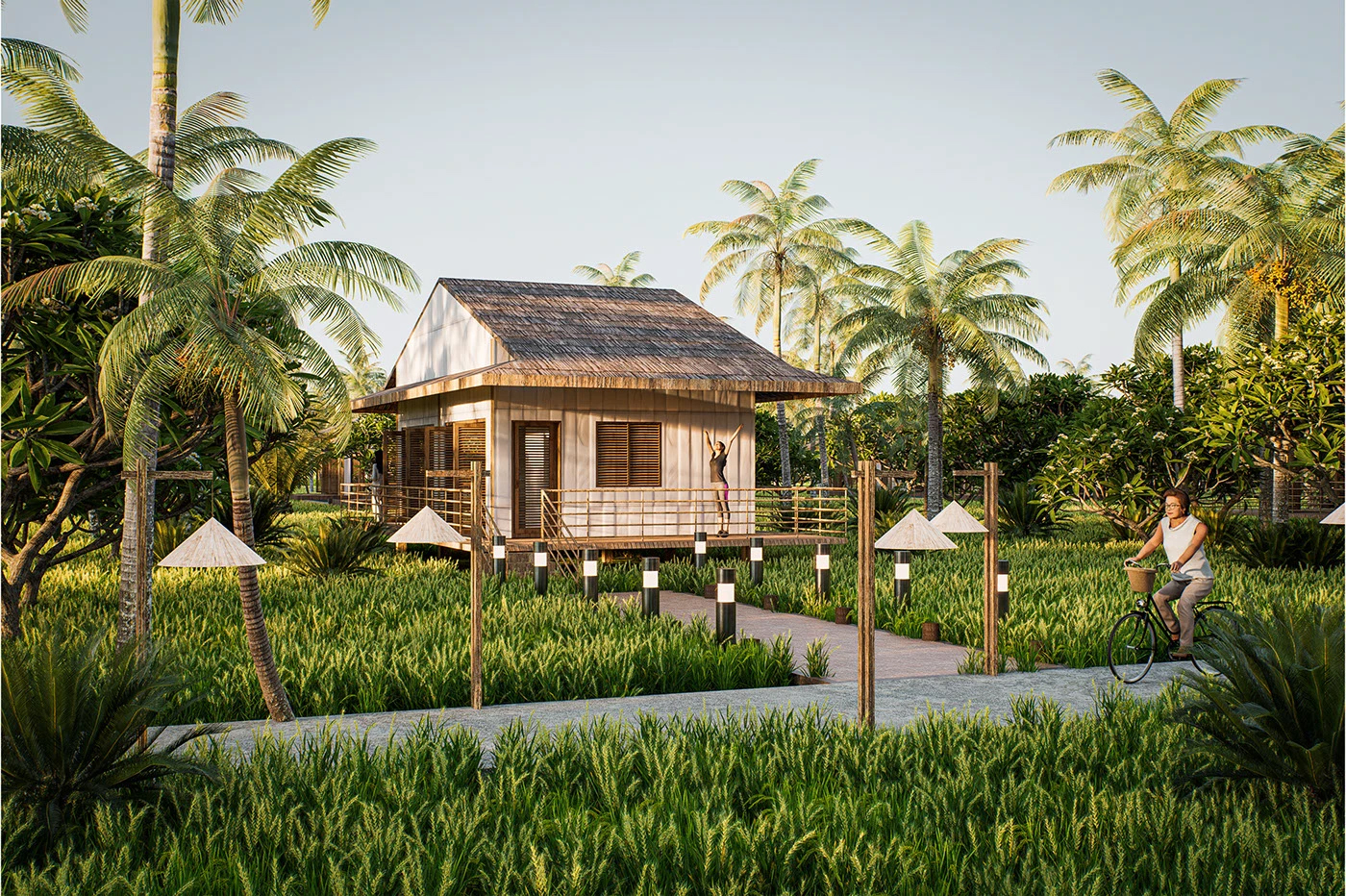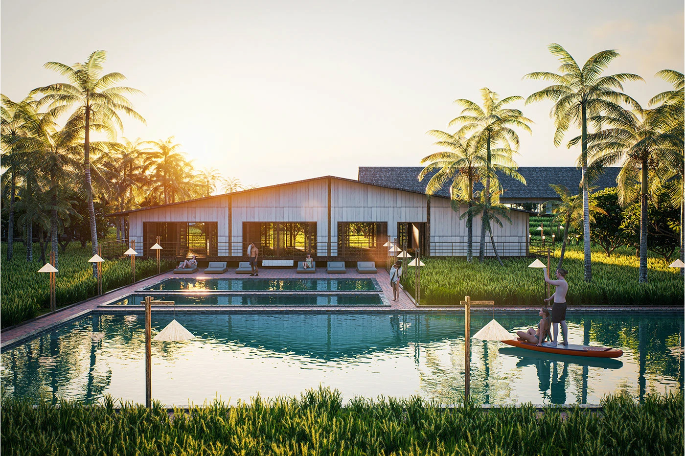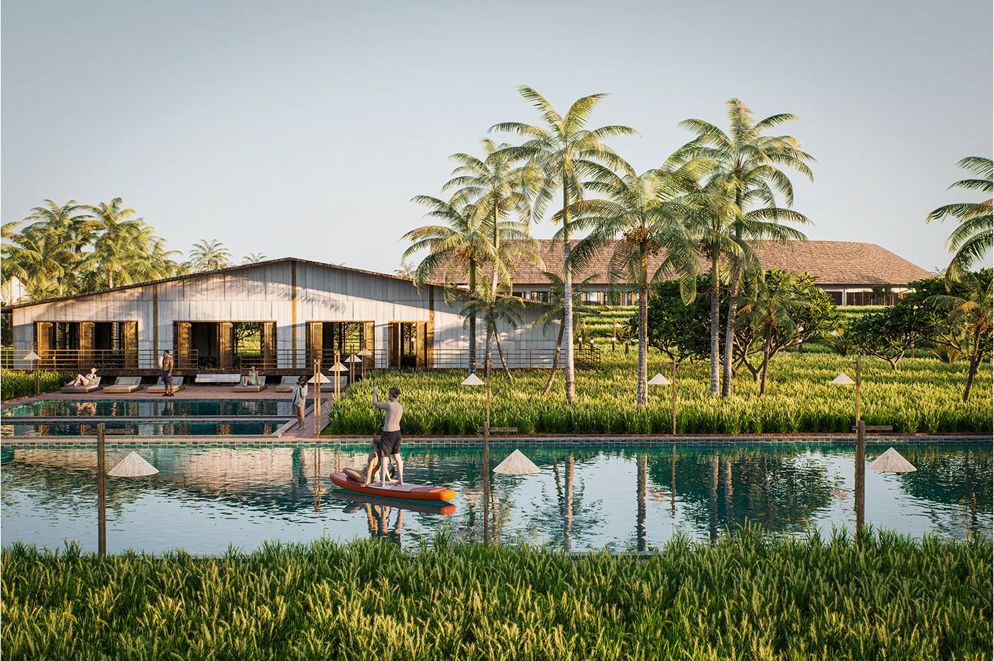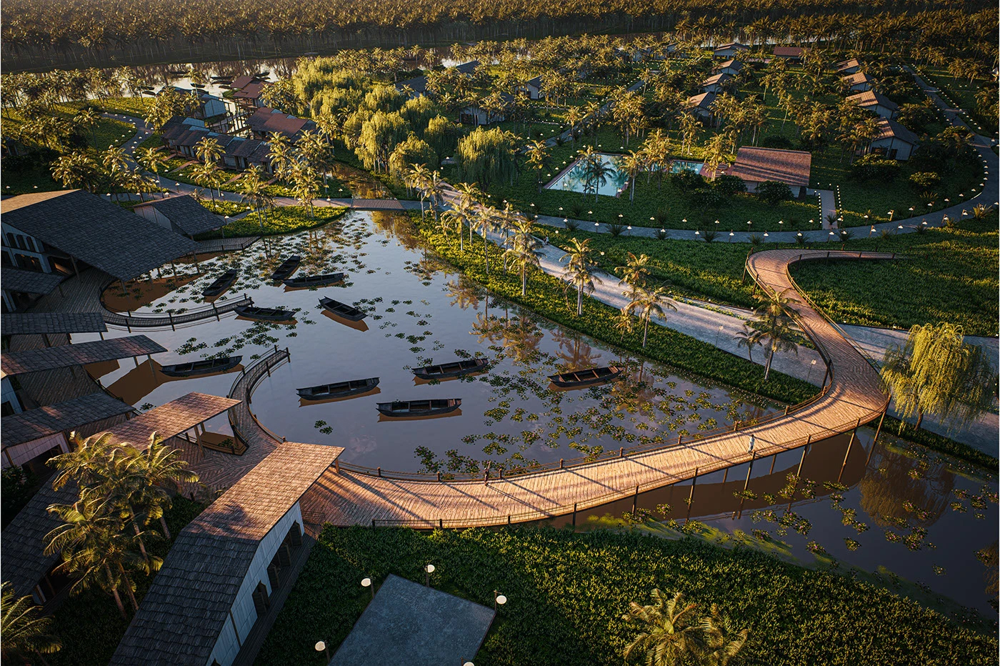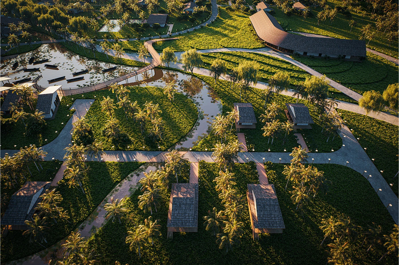 整体是现代东南亚自然度假风,融合田园生态与侘寂原木质感,以水系、椰林、稻田为基底,流线型栈道、临水木屋与自然完全共生,暖调日光加持,松弛度假感拉满,是商业景观与民宿设计的满分范本。