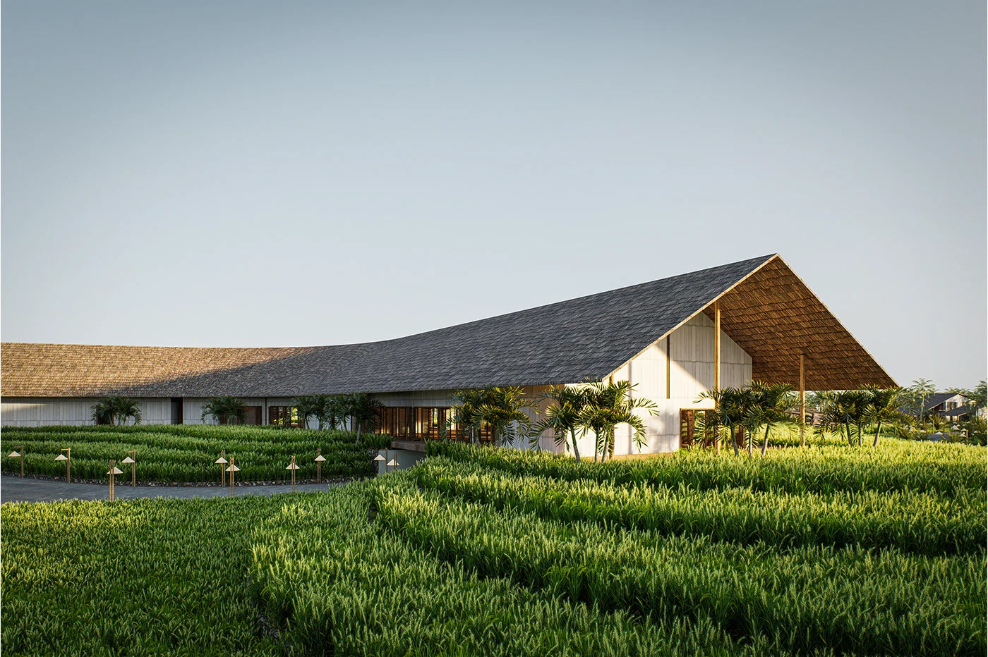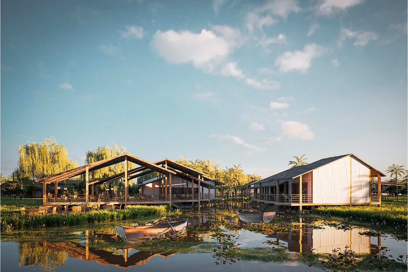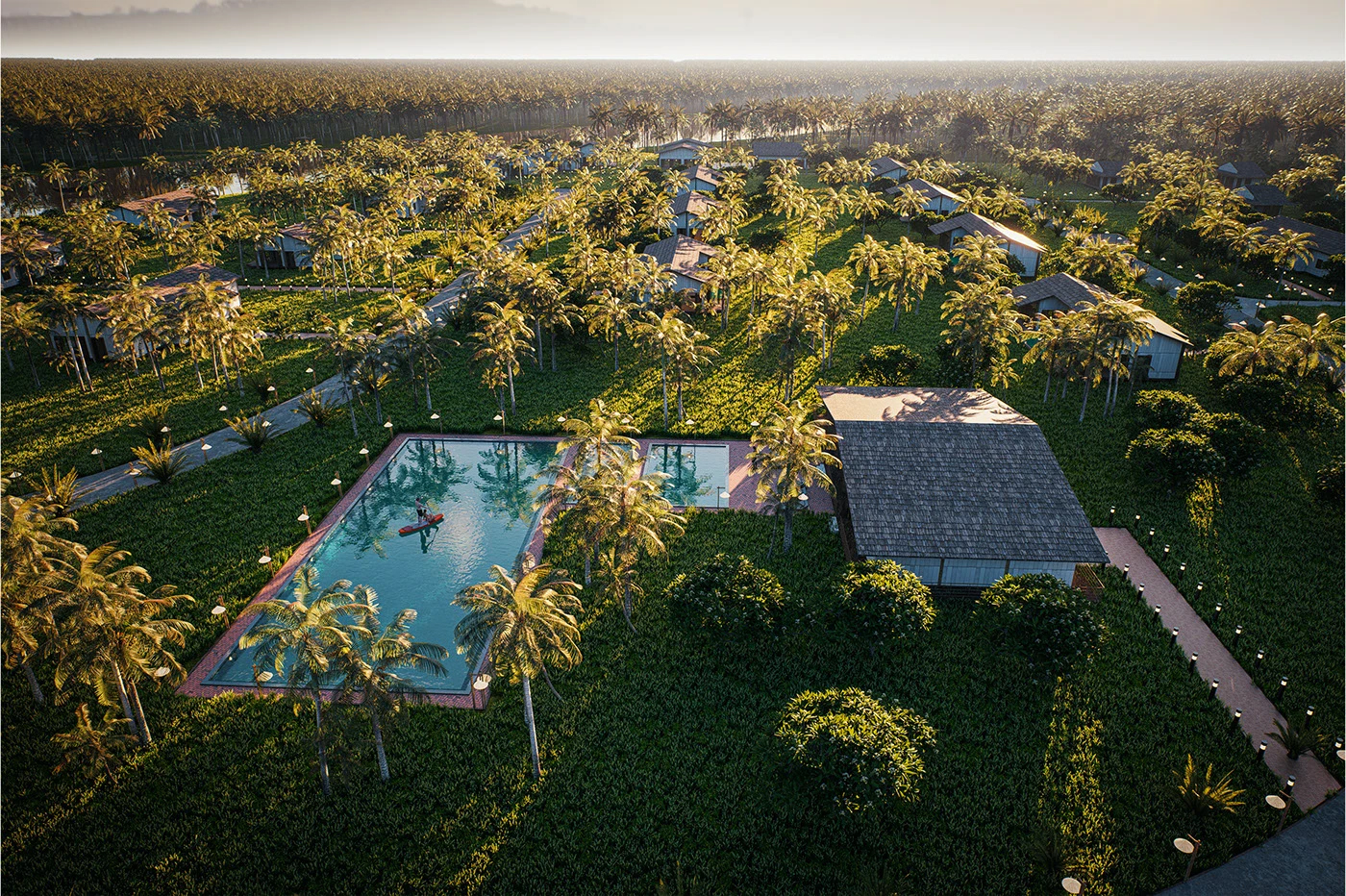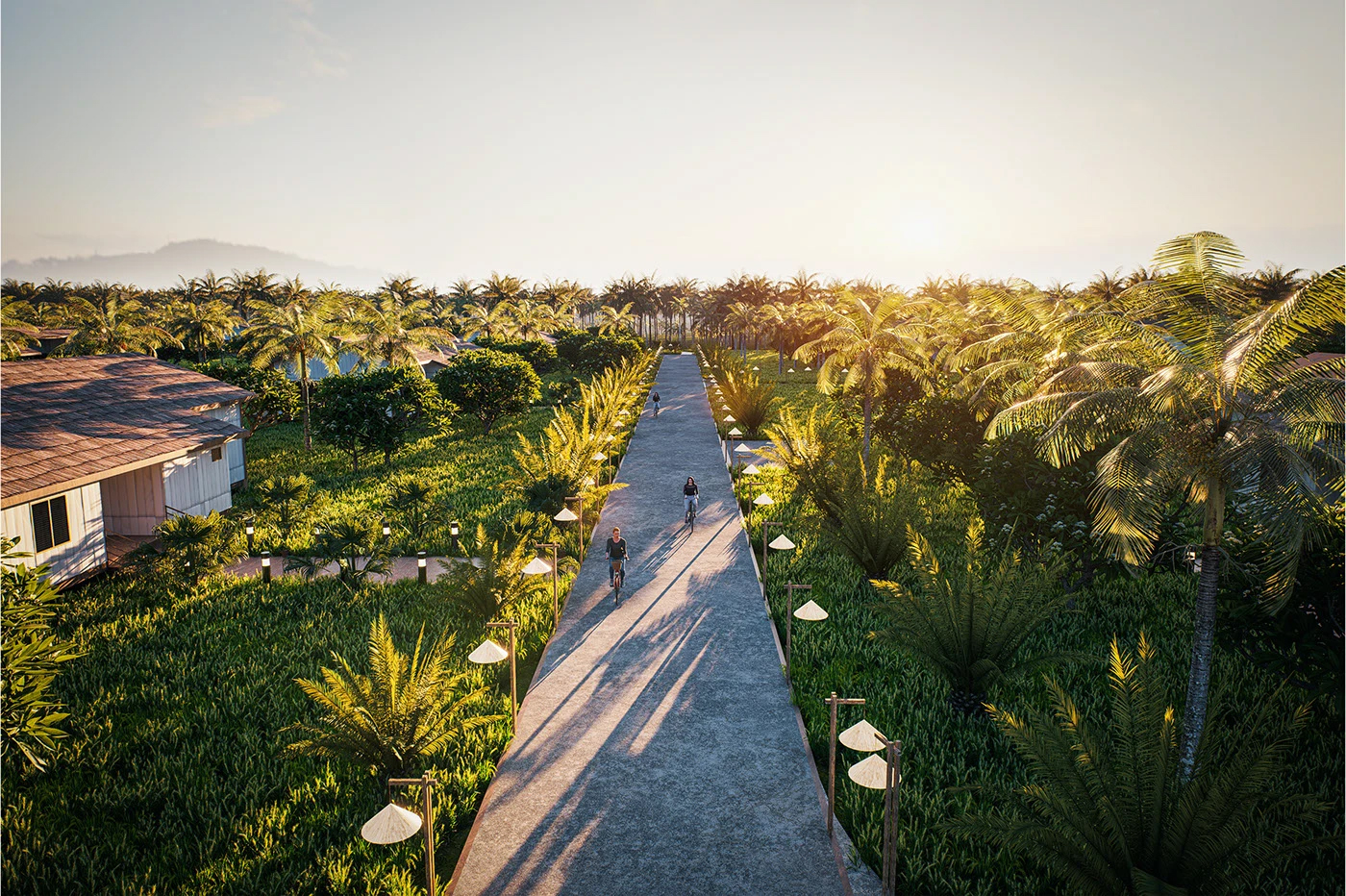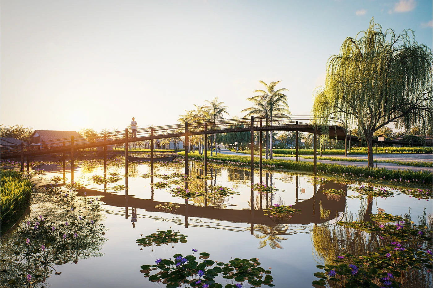 整体是现代东南亚自然度假风,融合田园生态与侘寂原木质感,以水系、椰林、稻田为基底,流线型栈道、临水木屋与自然完全共生,暖调日光加持,松弛度假感拉满,是商业景观与民宿设计的满分范本。