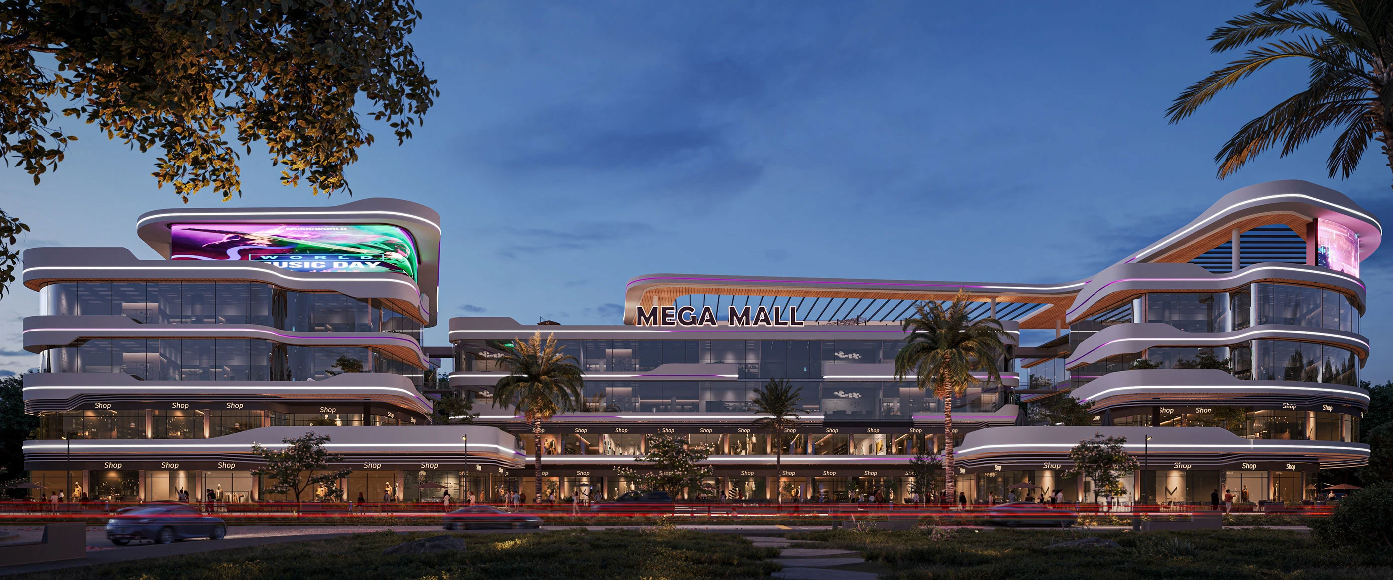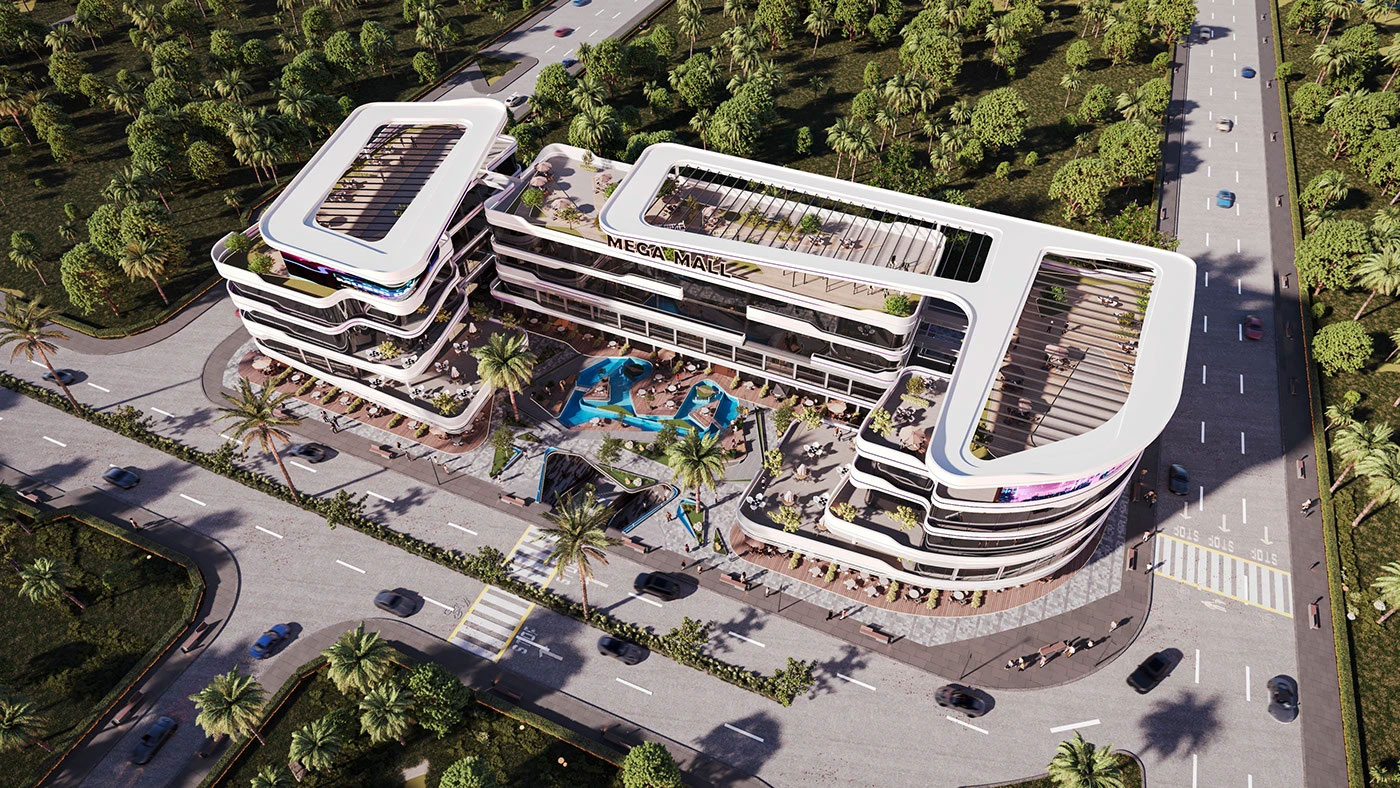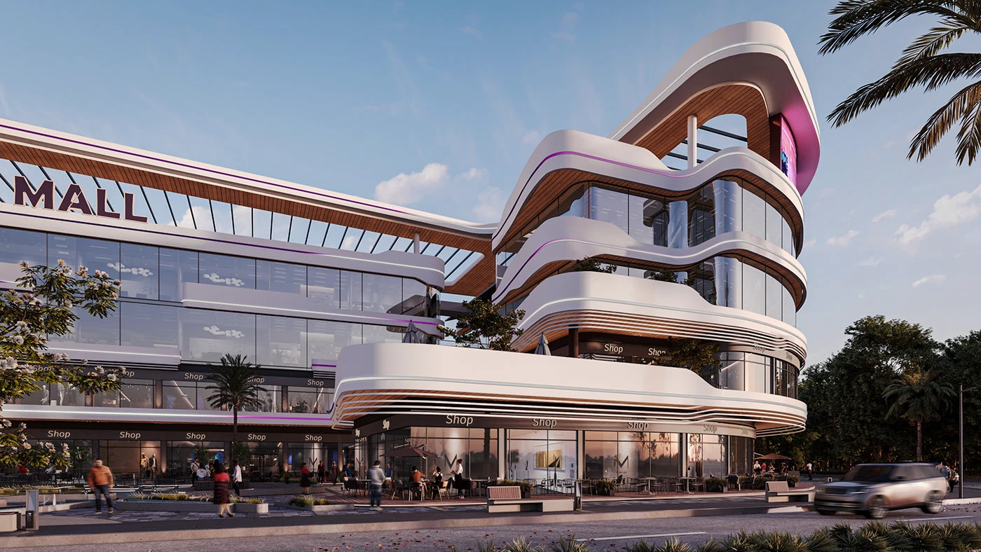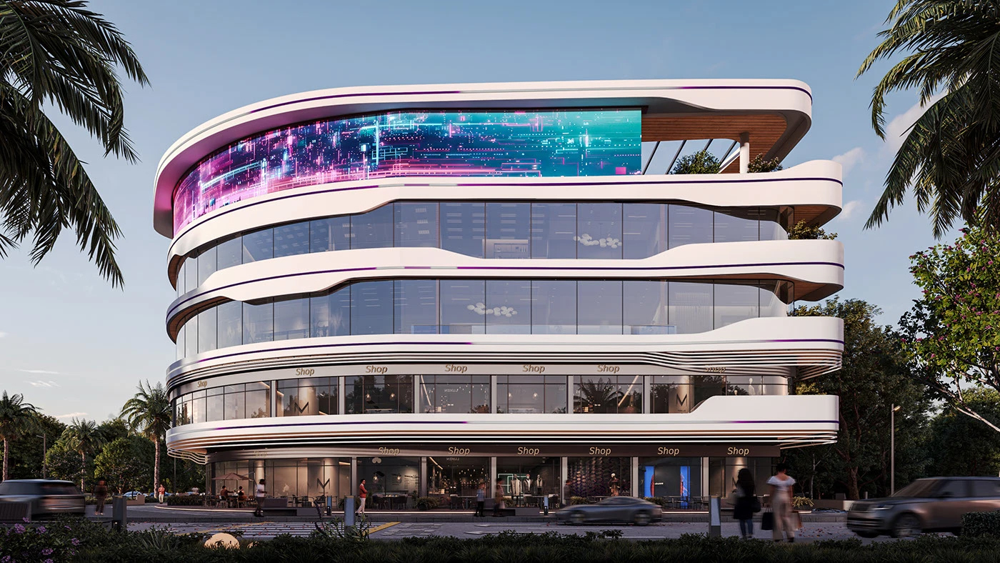 整体是现代未来主义流线商业风格,以流畅的异形曲面、弧形体块为核心,搭配炫彩科技大屏、线性灯带与通透玻璃幕墙,黑白紫撞色勾勒科技质感,热带绿植中和建筑冷硬感,昼夜双景氛围感拉满,是商业地标设计的满分范本。