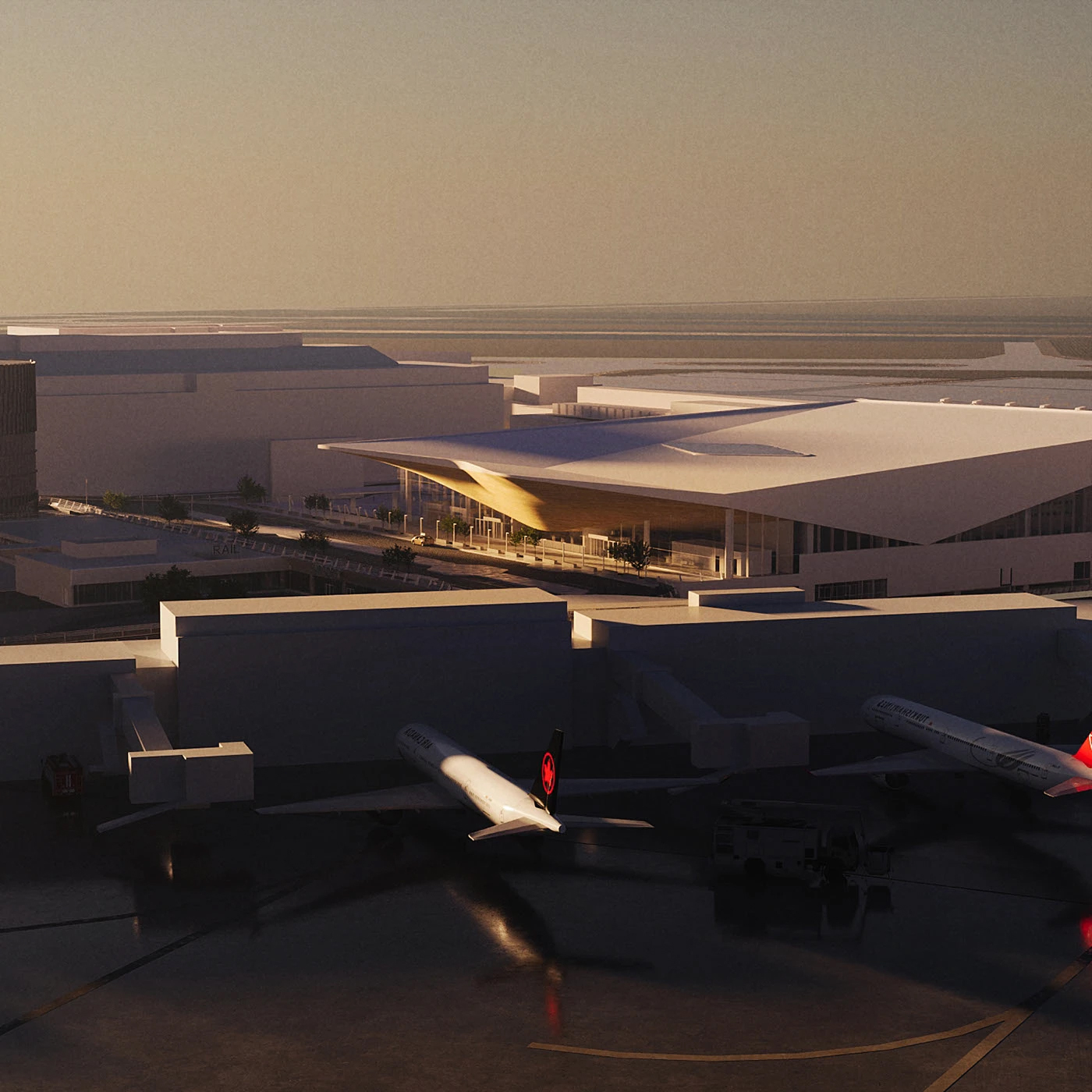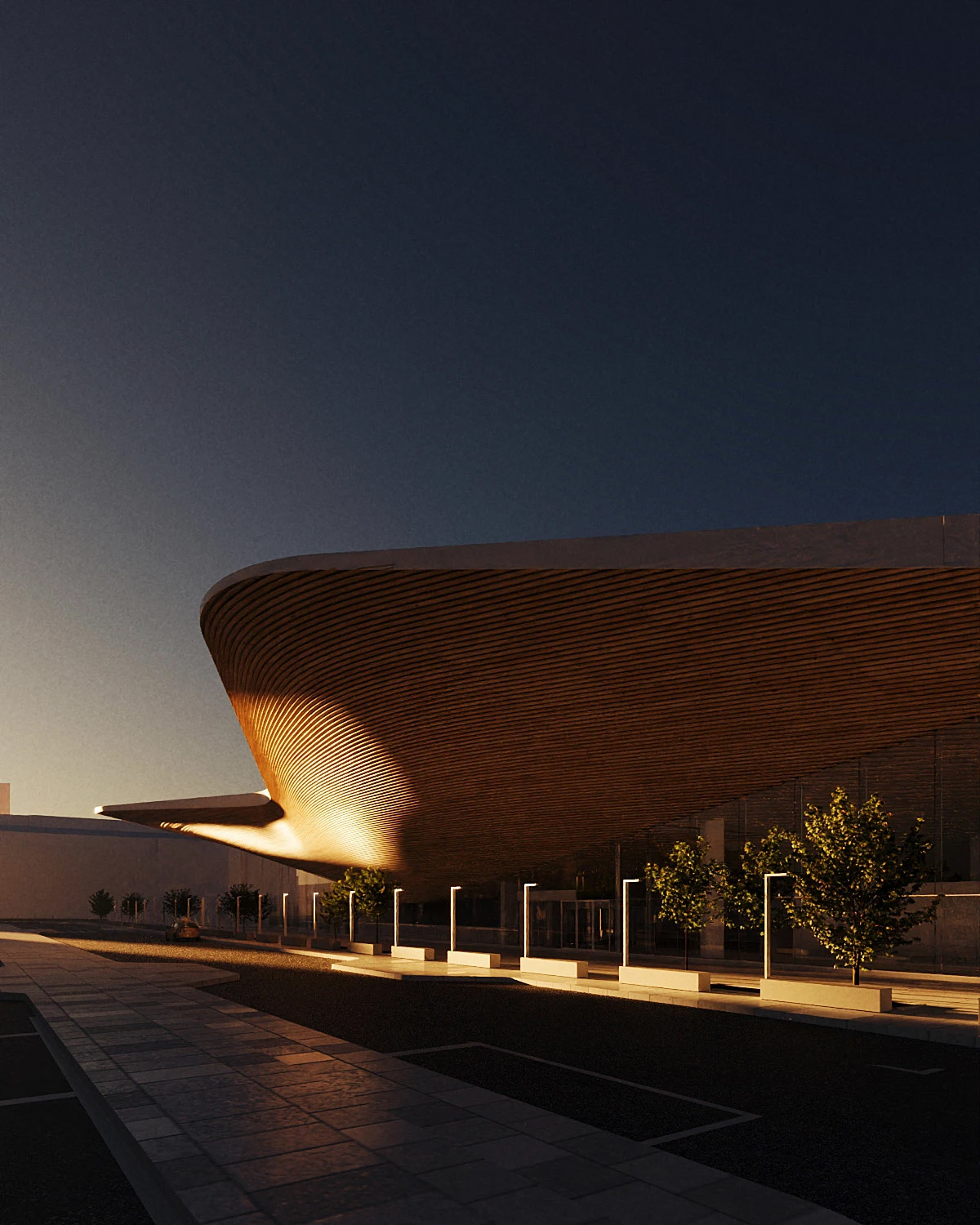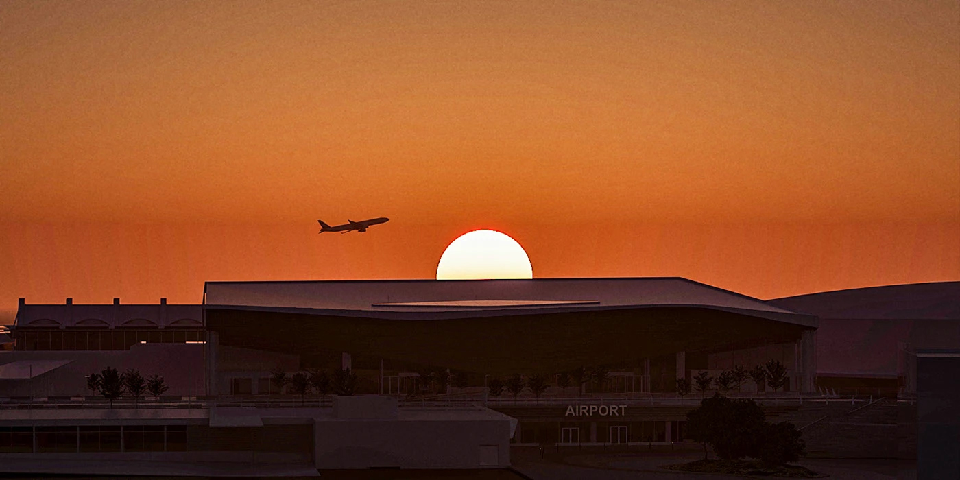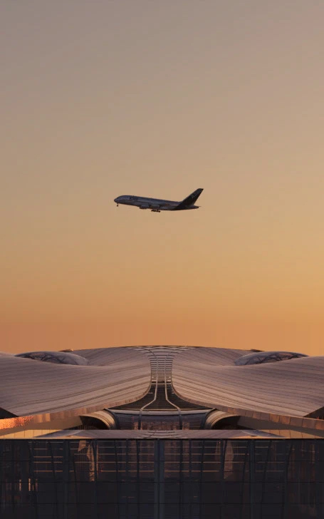 现代流线型建筑美学 + 写实渲染的完美融合。大兴机场标志性的流线型屋顶、木质格栅被精准还原,暖调木材在光影下层次分明;室内空间则是轻奢风的延伸,大理石台面、玉石灯具与木质元素碰撞,既有建筑的宏大叙事,又藏着空间的精致细节,连日出日落的氛围感都复刻得恰到好处。