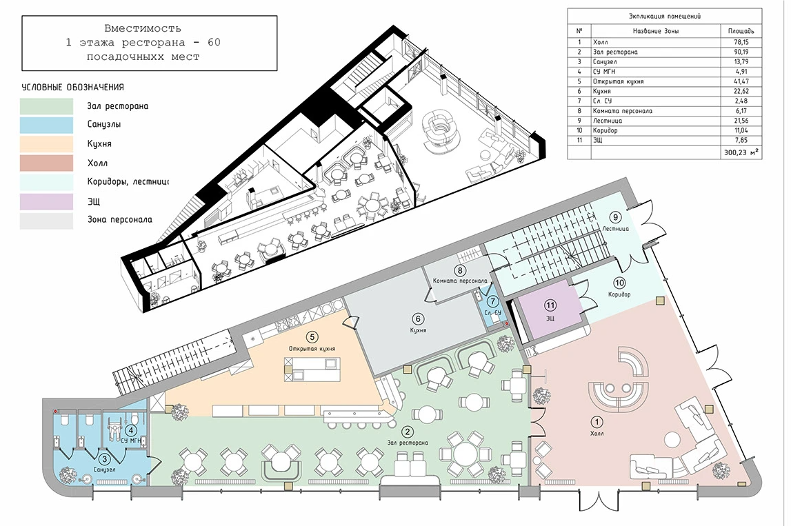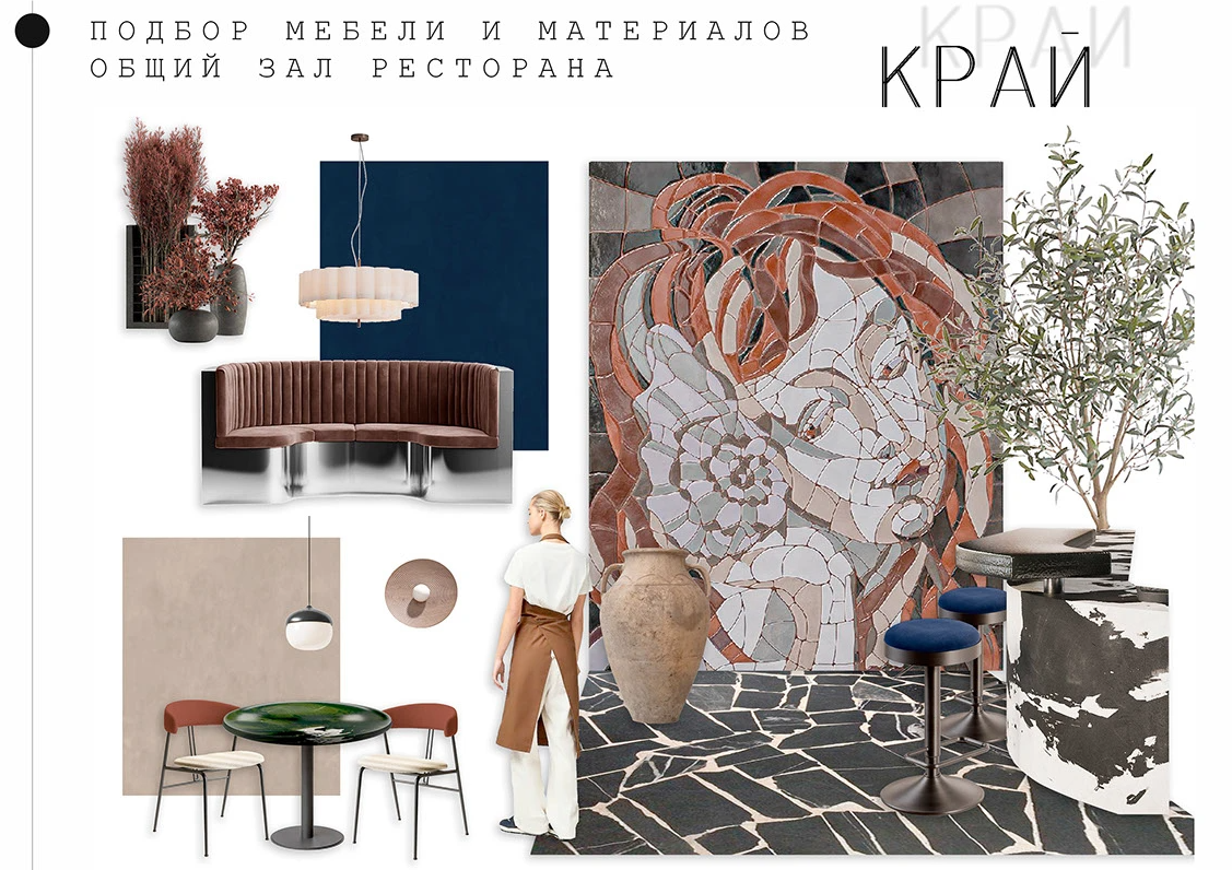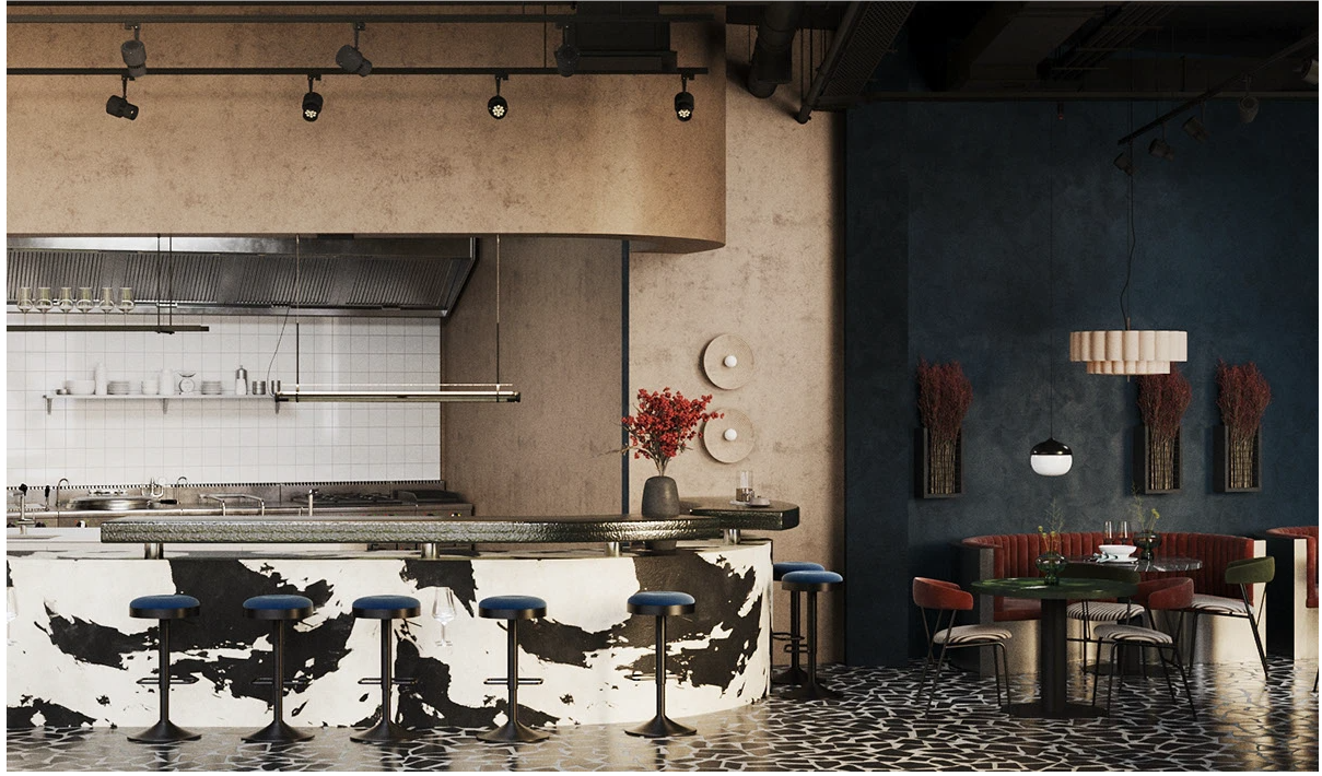 这是侘寂复古艺术风餐饮空间,以自然肌理为核心,水磨石地面、微水泥墙面打底,搭配马赛克艺术壁画、丝绒软包卡座,用低饱和大地色为基底,叠加深蓝、红棕的撞色点缀。既有侘寂风的松弛慵懒,又藏着复古艺术的精致感,60 座的空间动线流畅,用餐区、后厨、前厅分区清晰,颜值和实用性双在线。