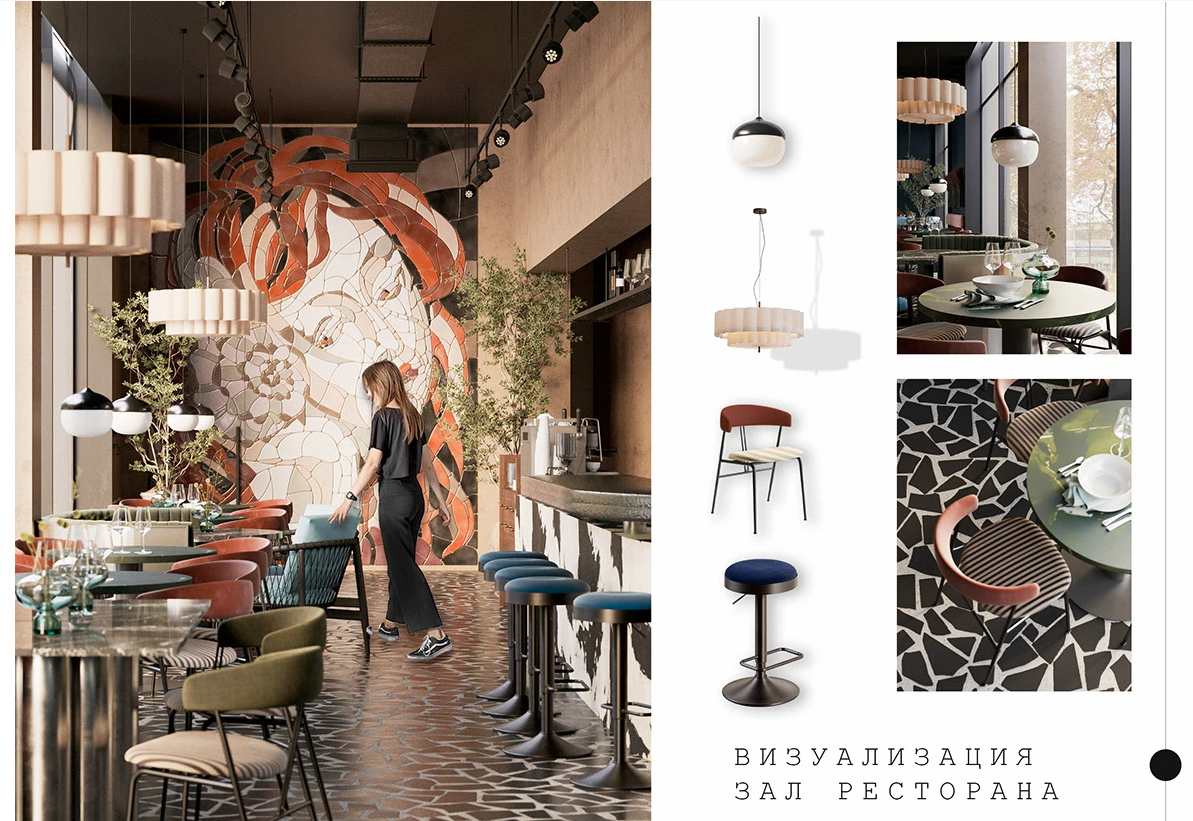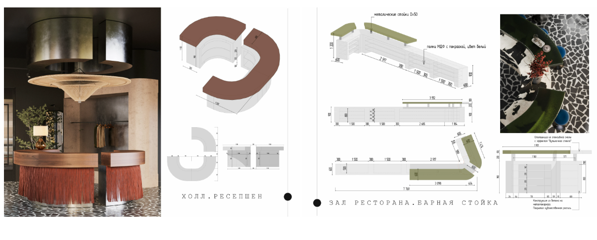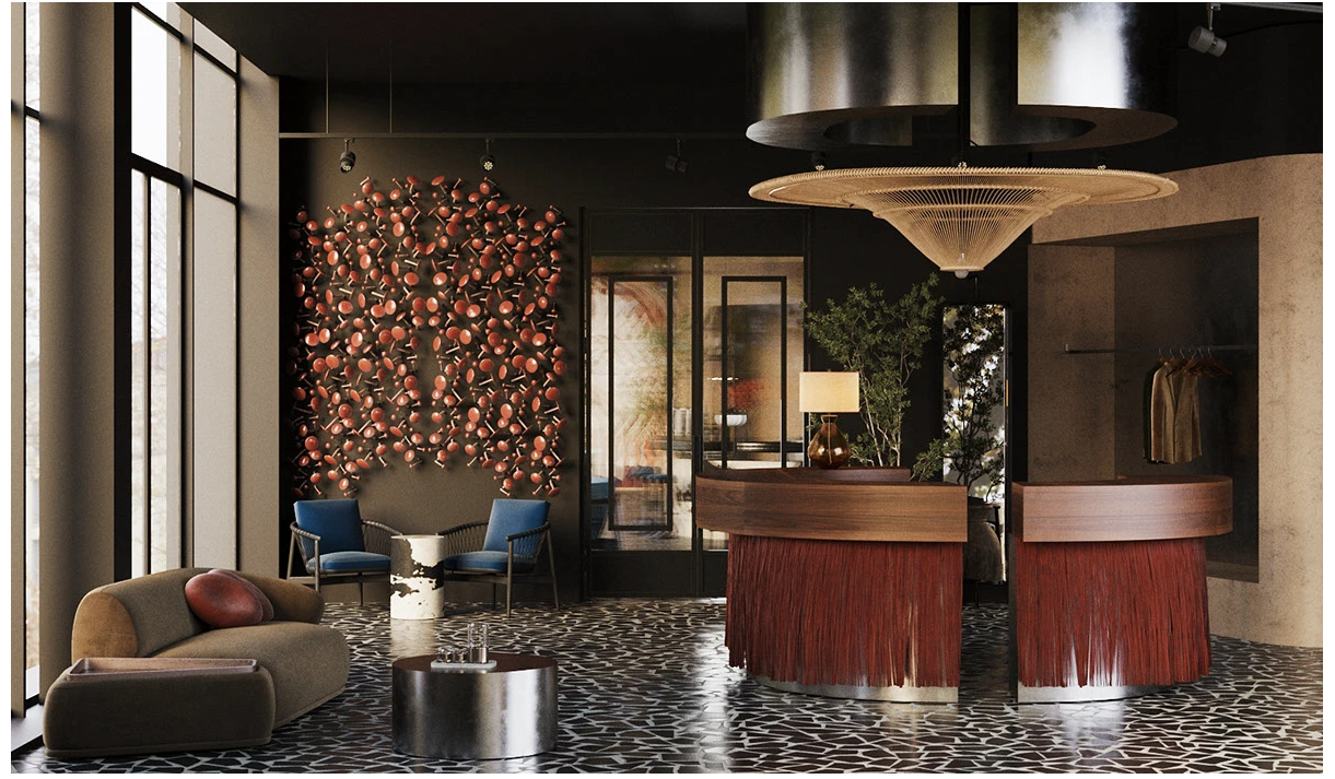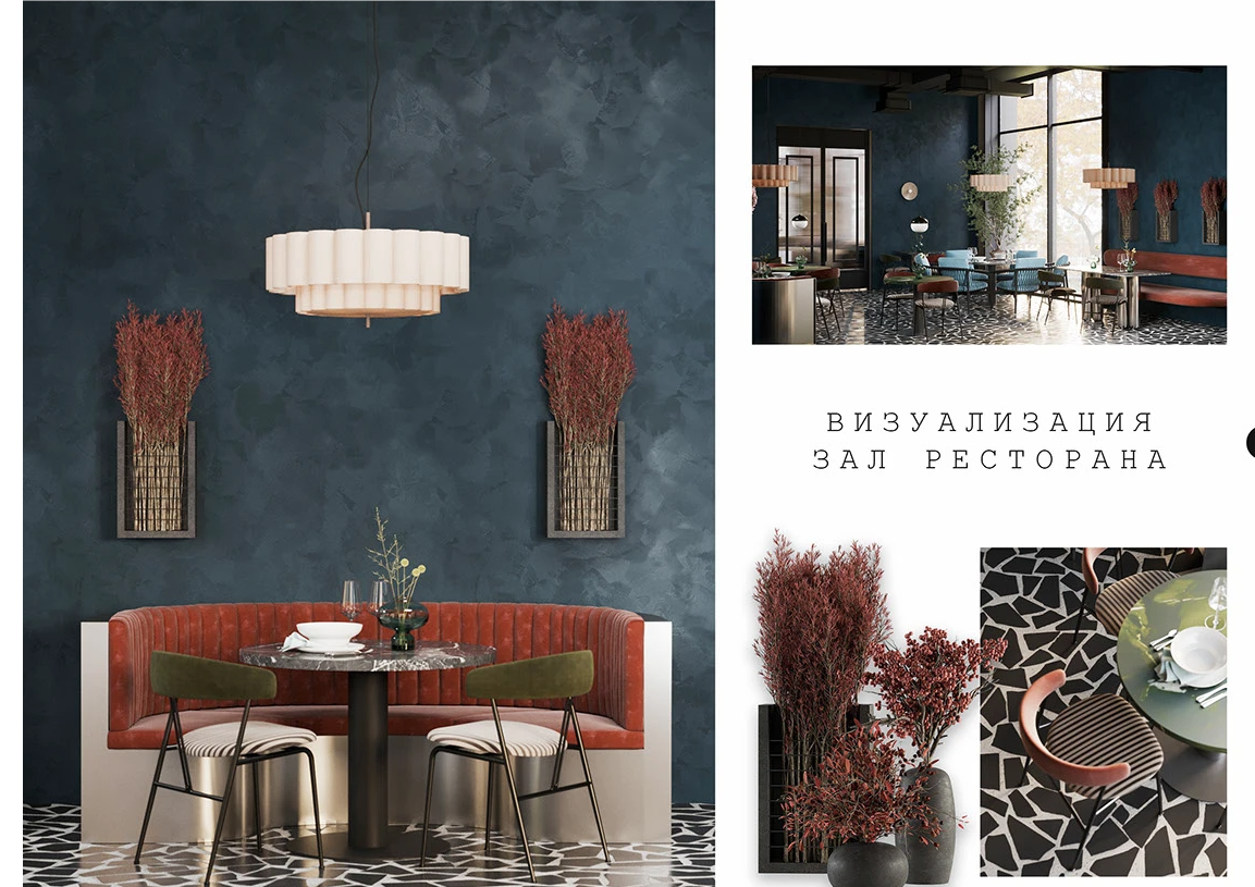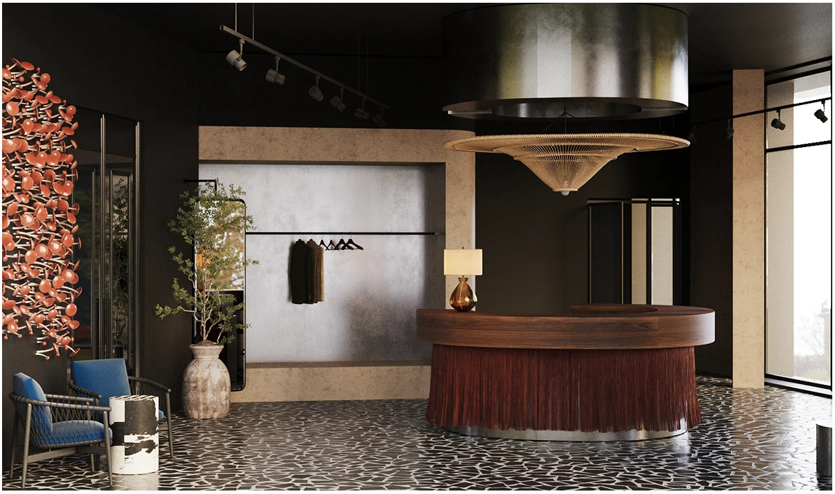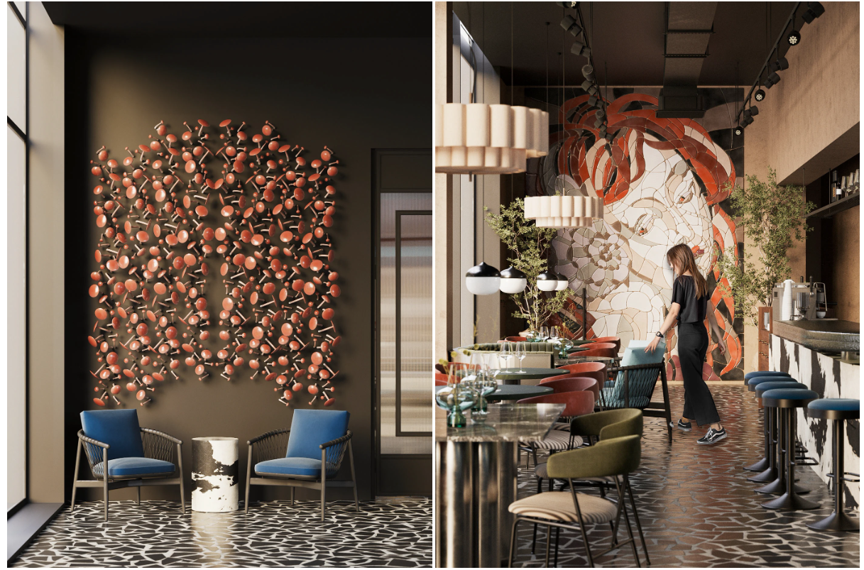 - 精细建模:在 3ds Max 里 1:1 还原空间结构,从马赛克壁画、艺术装置到家具细节都精准建模,确保和施工图尺寸完全匹配。