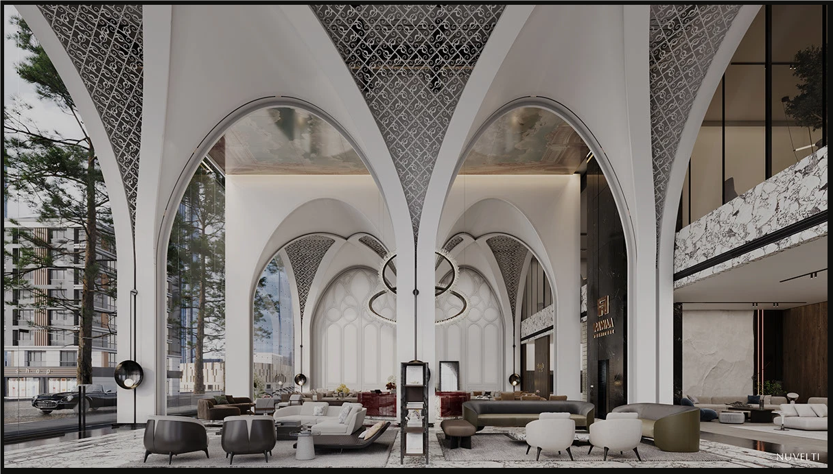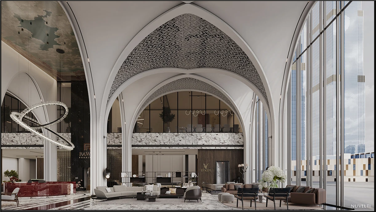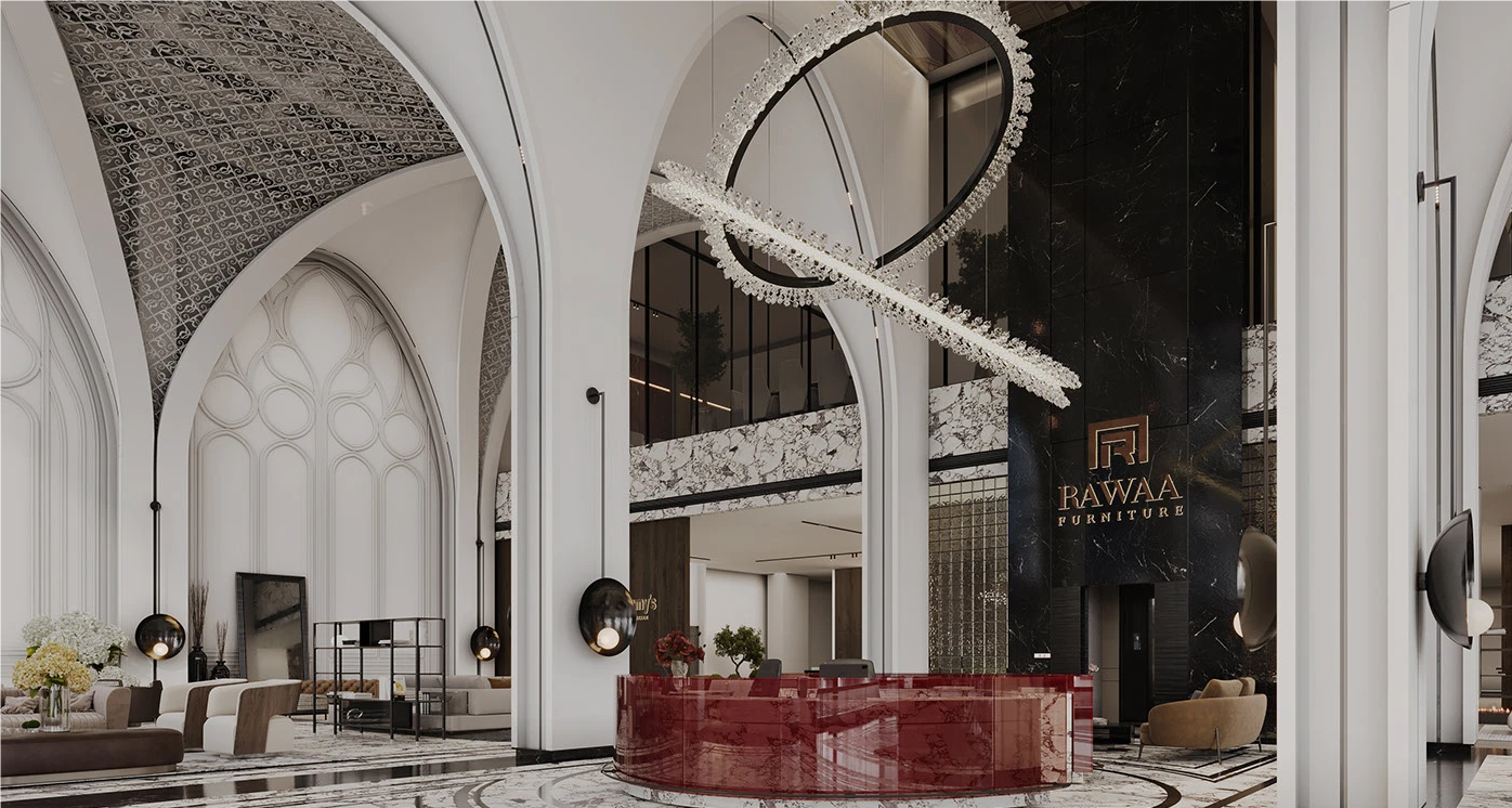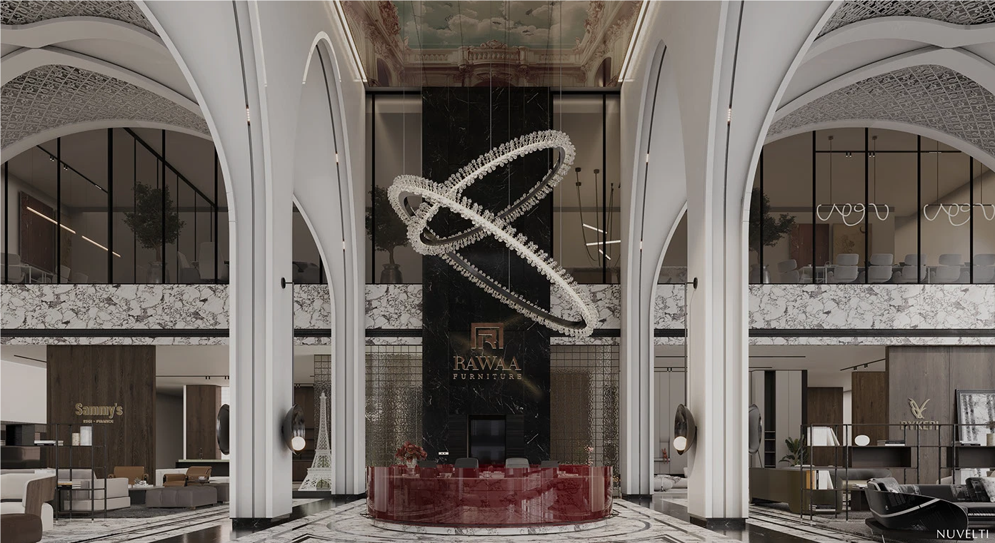 这是新艺术风 × 现代轻奢的融合空间,以新艺术主义的曲线拱顶、雕花纹样为骨架,搭配现代轻奢的大理石、水晶装置与极简家具。复古壁画穹顶、哥特式拱券与通透玻璃、金属线条碰撞,既有古典艺术的仪式感,又藏着现代设计的利落,600㎡的展厅动线流畅,家具展示区、接待区分区清晰,颜值和实用性双在线。
