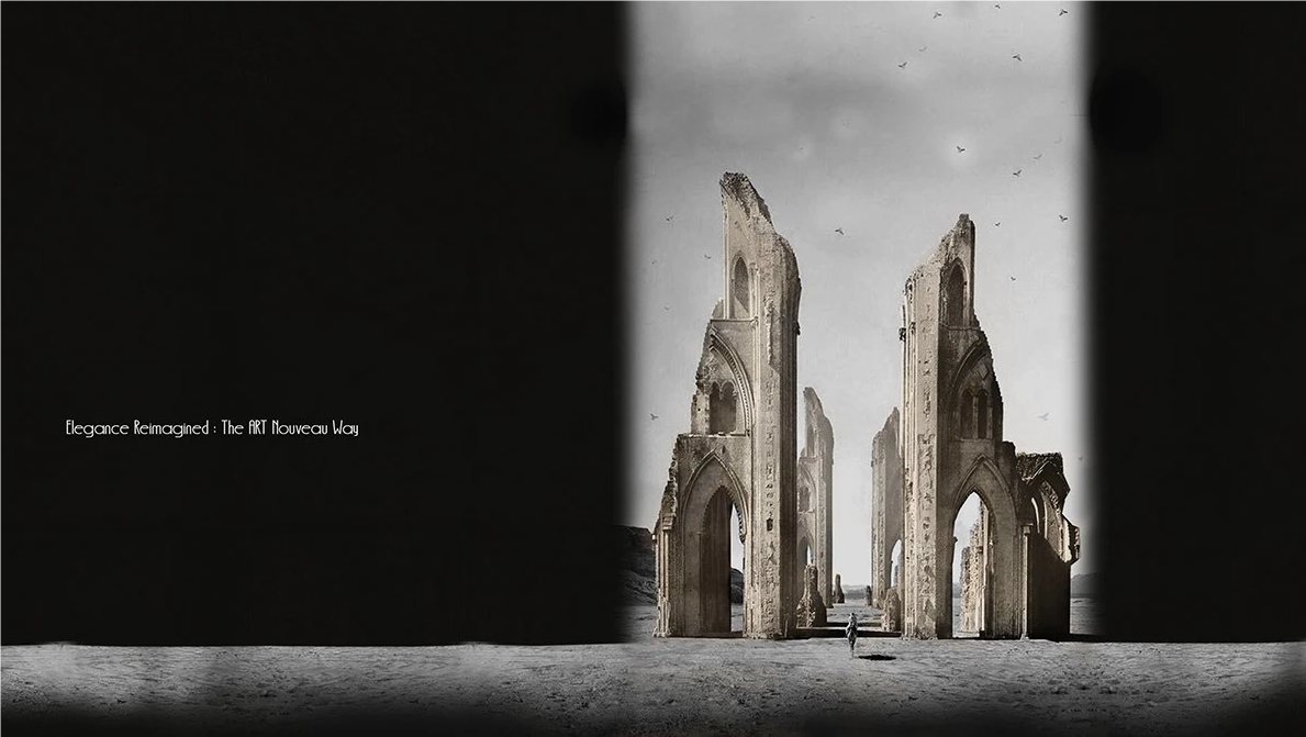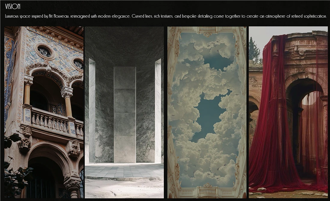 - 方案定调:先用 ArchiCAD 绘制平面布局、拱顶结构施工图,精准规划空间动线和功能分区;同时用 Photoshop 制作灵感拼贴板,敲定新艺术风元素、材质和软装方向,让灵感落地有依据。