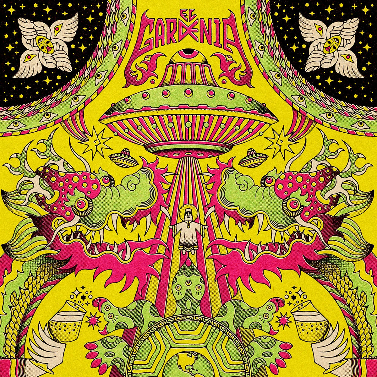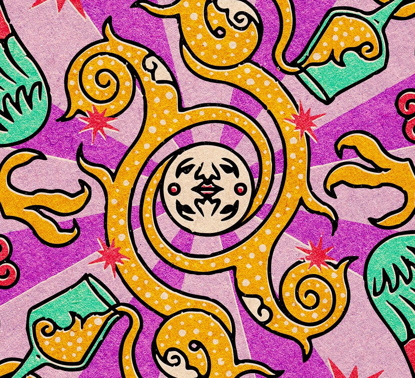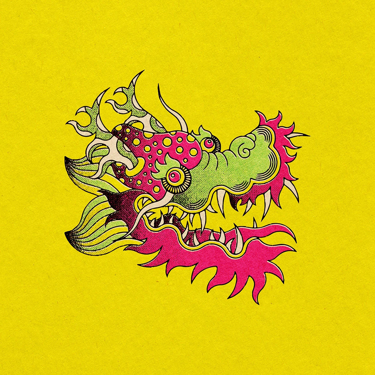 这是拉美民间艺术 × 复古版画 × 迷幻波普的融合风格。以对称式图腾构图为核心,融合东方瑞兽、拉美民俗神兽等装饰元素,粗黑利落的轮廓线搭配高饱和撞色(明黄、荧光粉、湖绿大胆碰撞),再叠上网点肌理模拟老式丝网印刷质感,既有传统民俗艺术的底蕴,又带着现代街头的潮酷感,商业适配度拉满。