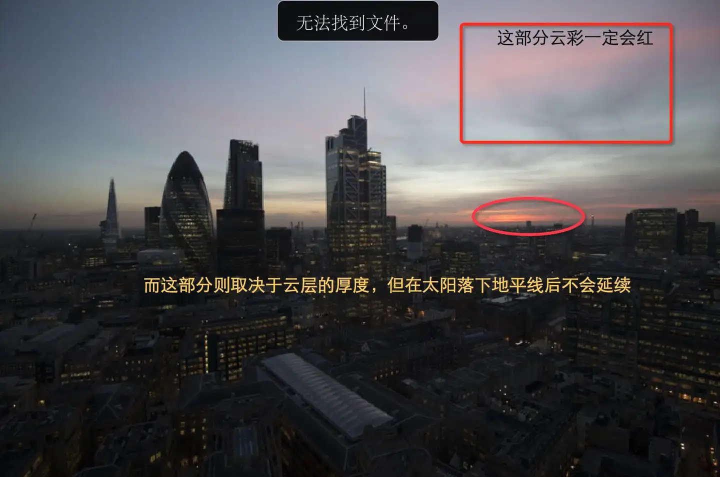果然在太阳落山的位置出现了些许红光,但是由于云层在地平线上下的位置特别厚,所以太阳下山后无法将更多的光线投射到逆光低空的火烧云。而处于高空的云层就有机会了