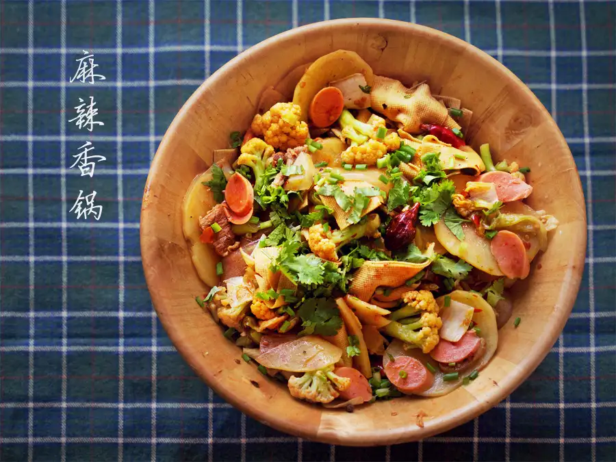 当菜品侧面拍比较困难的时候,试试从上往下俯拍吧。这个麻辣香锅辣椒放得少,当时在家给朋友做的,朋友第二天考试,我没敢放太多辣椒。拍摄非常简单,出锅后,铺桌布,踩凳子从上往下拍,2分钟搞定。(光线:阴天下午晚些时候,夏季)